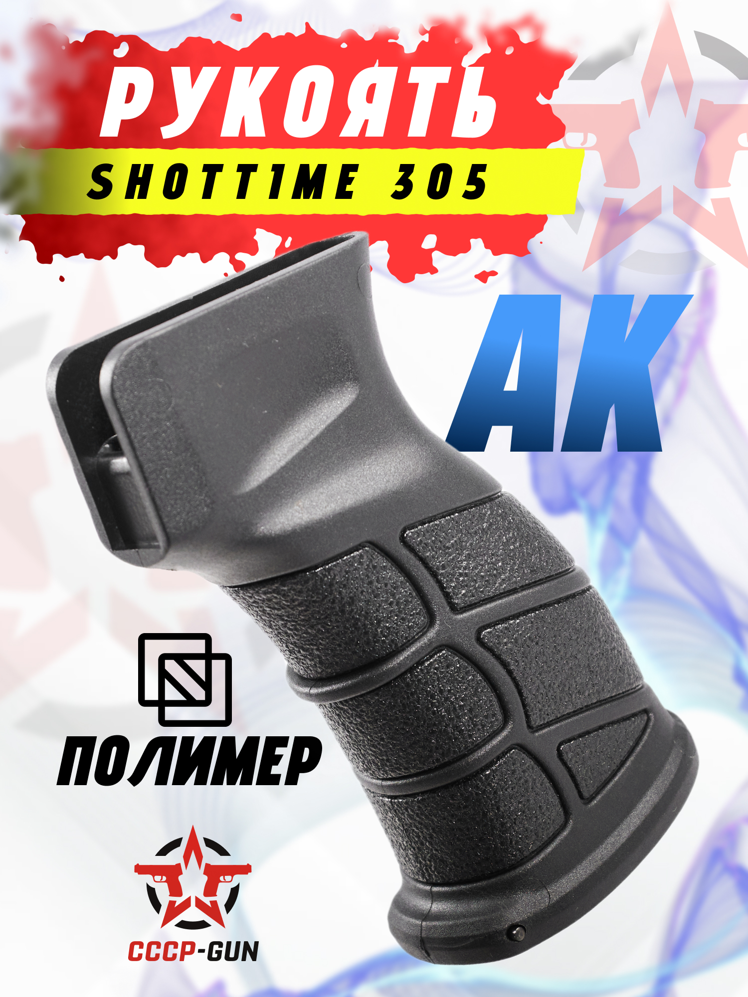 Изготавливается пистолетная рукоять АК 74 от ШотТайм из полимерного материала, стойкого к механическим воздействиям. Внутри предусмотрена полость для хранения батареек, закрываемая откидной крышкой. Помимо прочего, она снижает массу изделия до 0.06 кг.