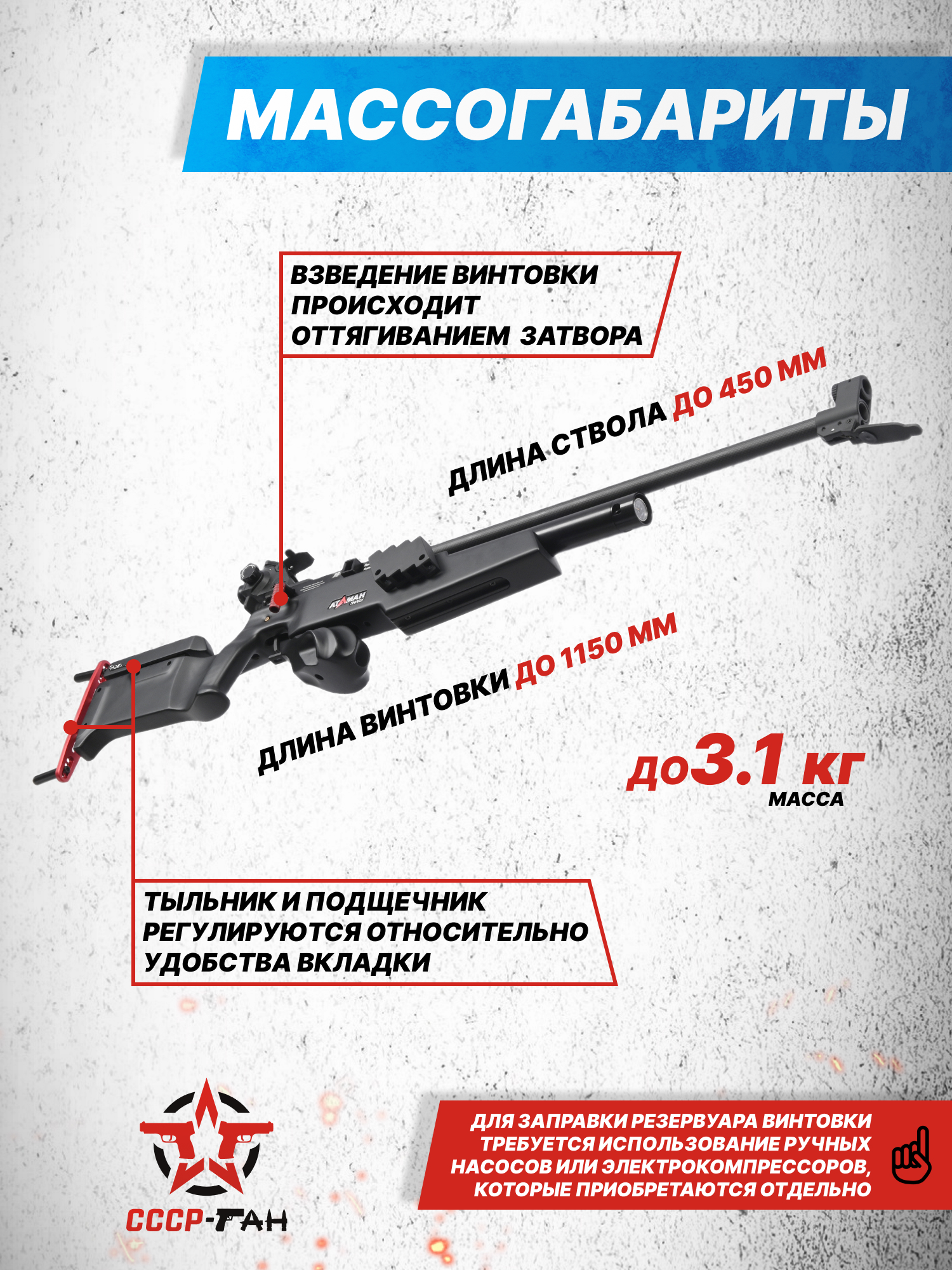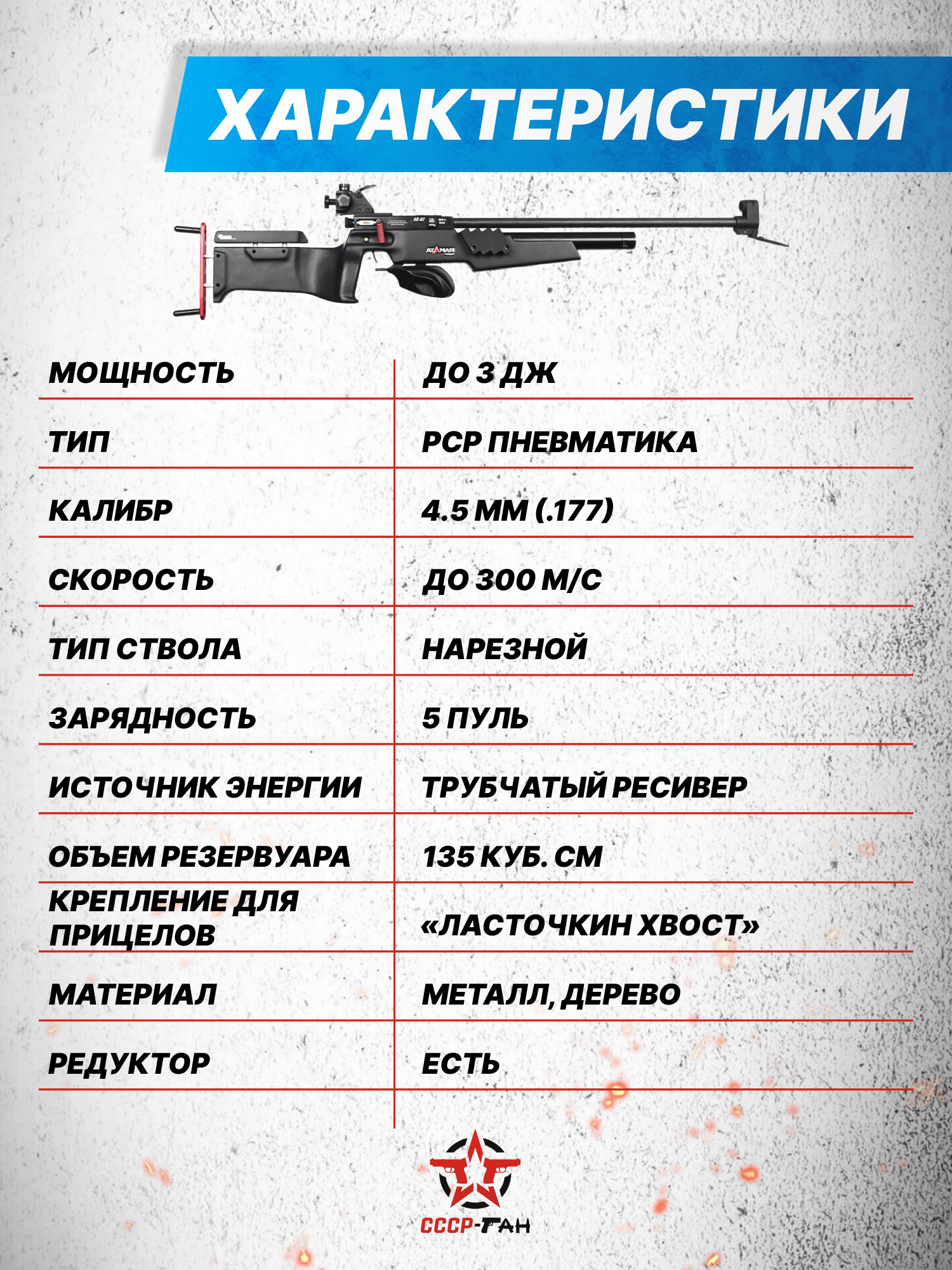 Внимание! Данная модель поставляется в разрешенной мощности для свободного приобретения на территории Российской Федерации. При этом в модели имеется возможность увеличения мощности путем замены части деталей или настройки конструкции, однако не стоит забывать о Федеральном законе «Об оружии» № 150 - ФЗ. В случае необходимости, опираясь на данный закон и руководствуясь им, возможно, потребуется получить разрешение от ЛЛР ГУ МВД России после вмешательства в конструкцию.