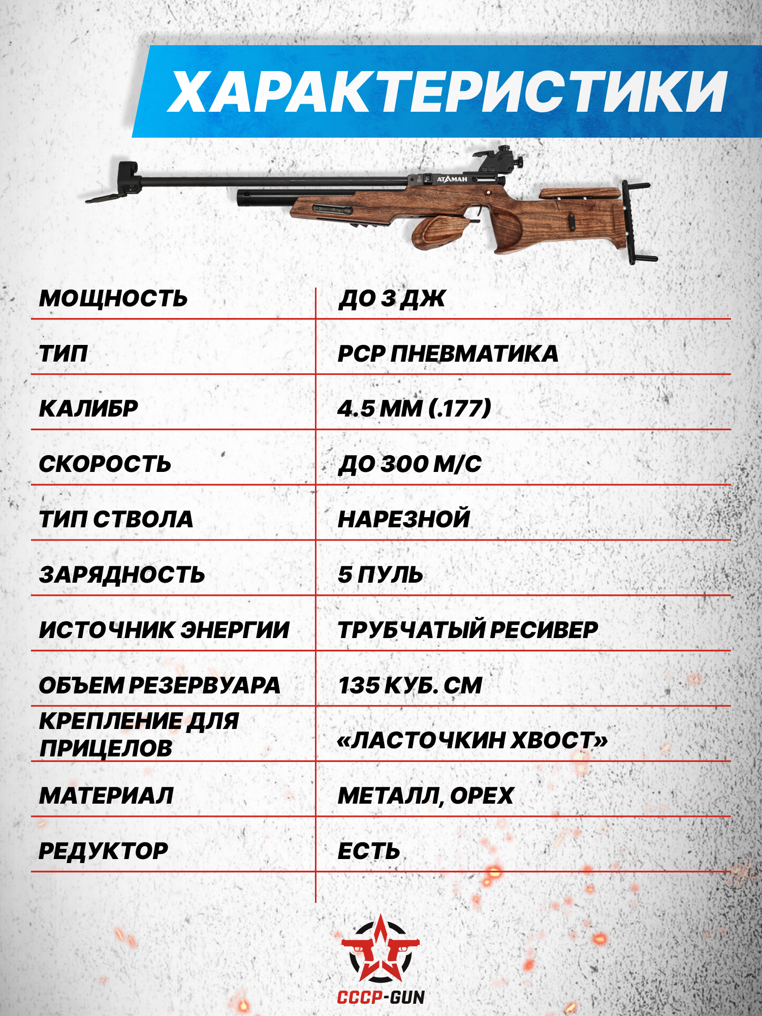 Еще одним отличием модели стало присутствие потенциала разгона до 300 метров в секунду, что может потребоваться при работе на специфичных дистанциях. В то же время изделие не развивает дульную энергию выше 7.5J, ввиду чего оно пребывает в свободном обороте. Соответственно спортивные организации и непосредственно стрелки могут приобретать их без отдельного разрешения Росгвардии.