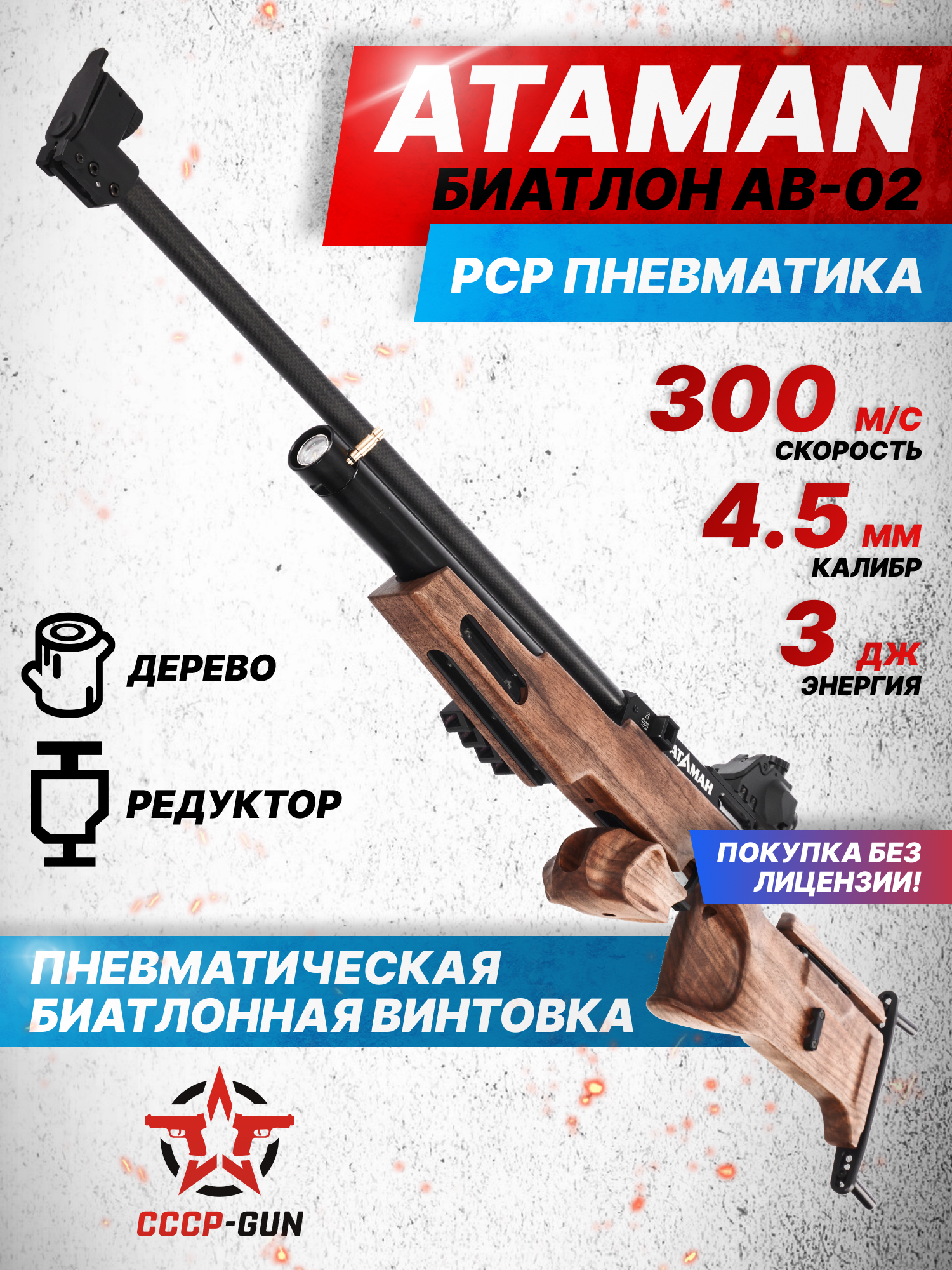 АВ-02 Биатлон 4.5 мм - модель, спроектированная под участие в одноименной игре с нуля. В отличие от прочих ПСП винтовок, стилизованных под такое исполнение, здесь компания реализовала полноценный прямой биатлонной затвор с коротким ходом. Это свойство делает механику пневматики наиболее близкой к таковой у огнестрельных винтовок 22ЛР в тактильном плане, благодаря чему стрелку не придется заново привыкать к перезарядке при смене типов оружия.