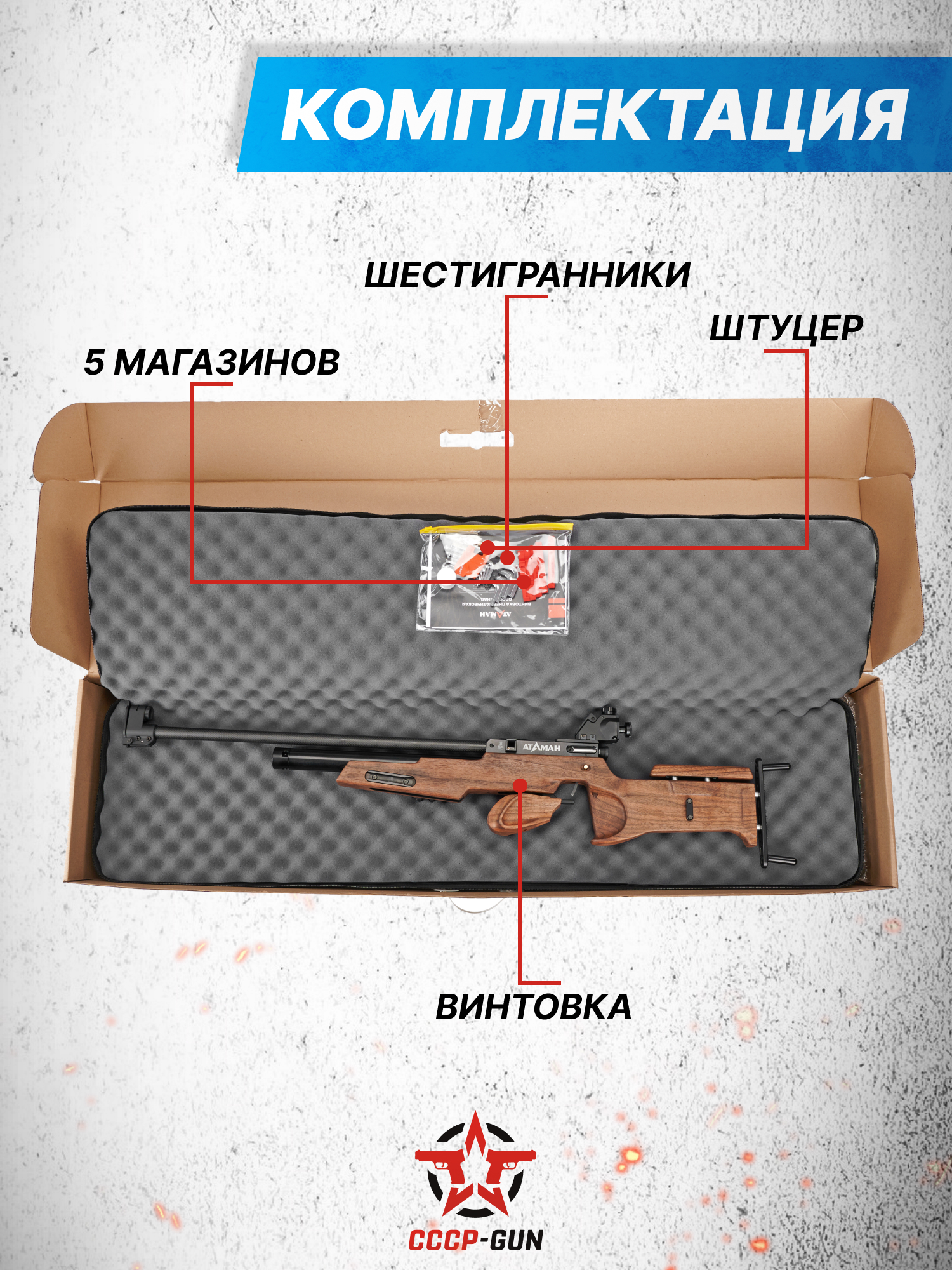 Внимание! Данная модель поставляется в разрешенной мощности для свободного приобретения на территории Российской Федерации. При этом в модели имеется возможность увеличения мощности путем замены части деталей или настройки конструкции, однако не стоит забывать о Федеральном законе «Об оружии» № 150 - ФЗ. В случае необходимости, опираясь на данный закон и руководствуясь им, возможно, потребуется получить разрешение от ЛЛР ГУ МВД России после вмешательства в конструкцию.