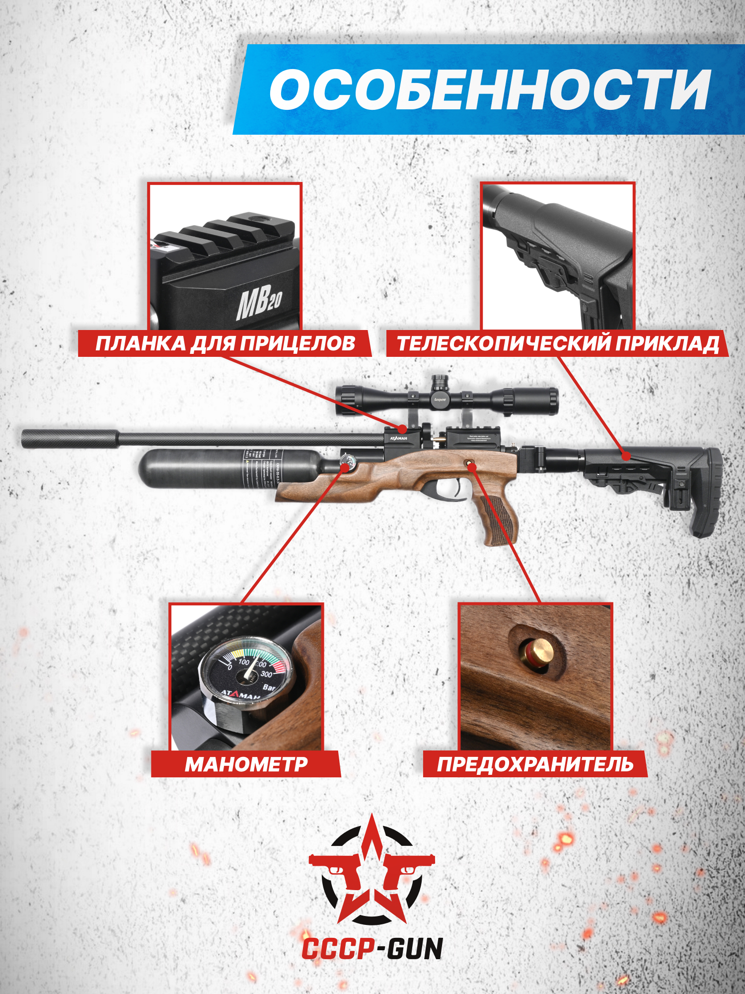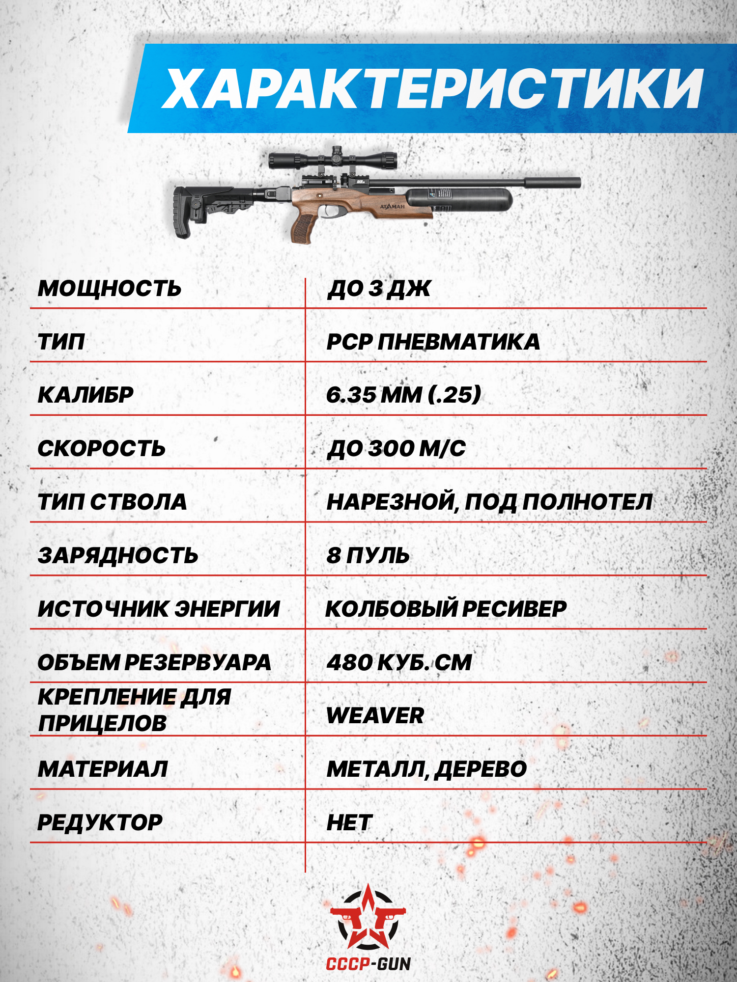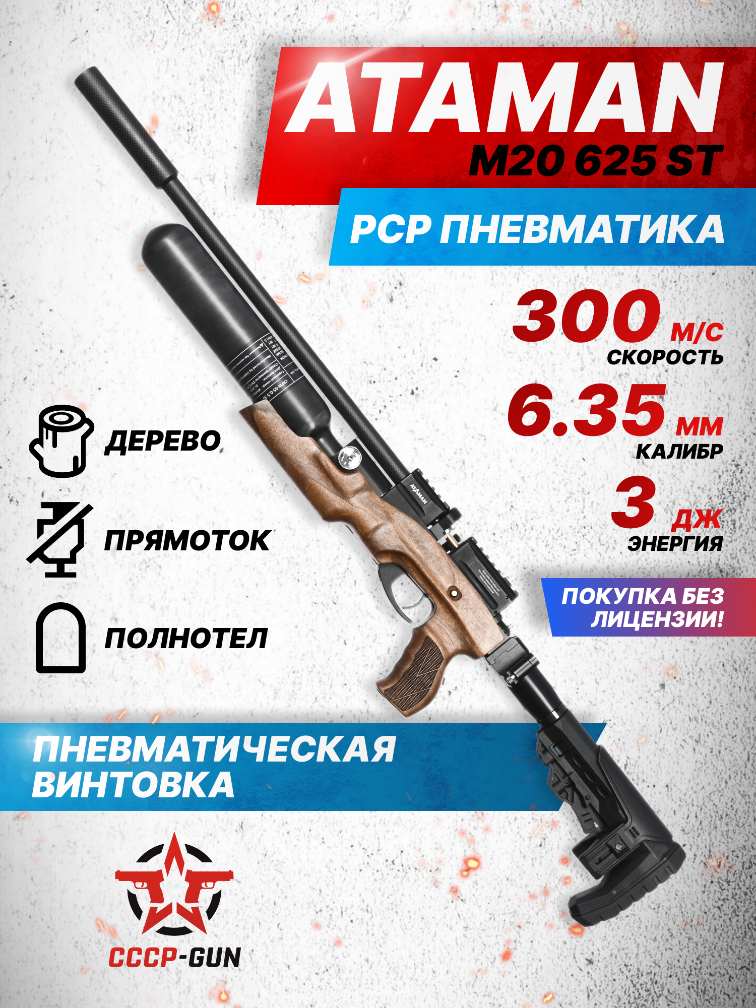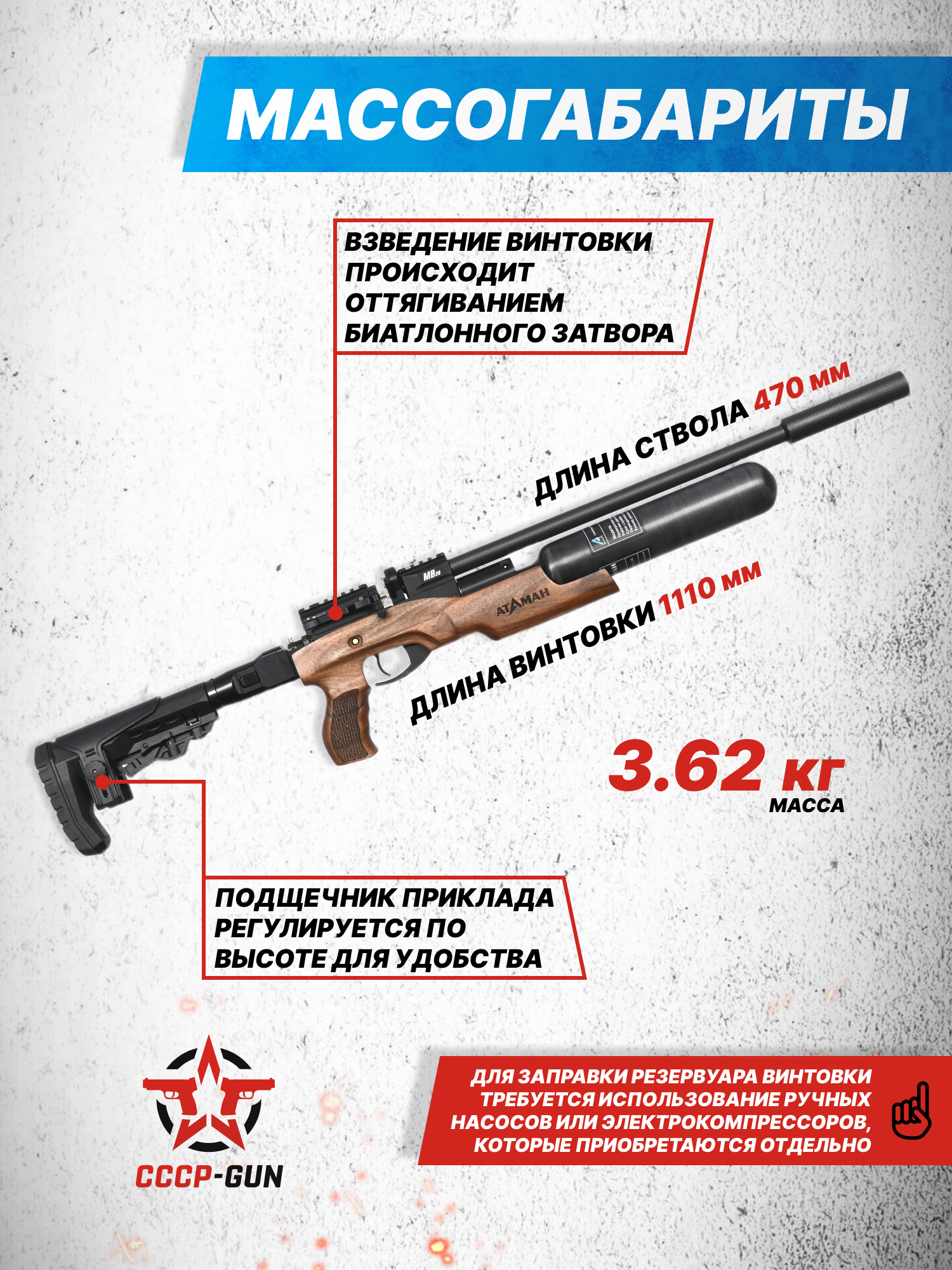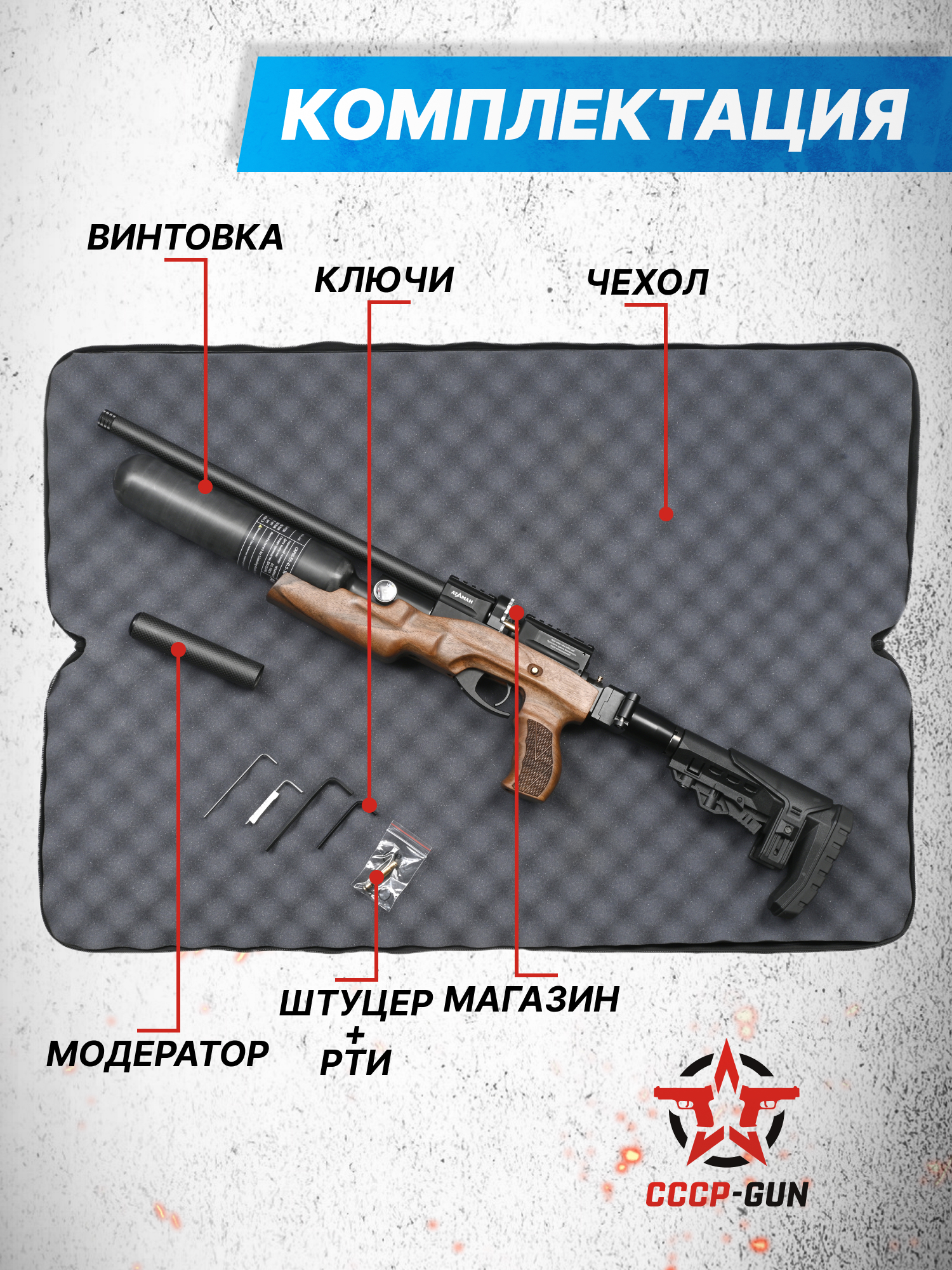 | Комплект поставки | Винтовка, модератор, чехол, магазин, заправочный штуцер, упаковка, краткая документация, копия сертификата (по запросу покупателя) |
