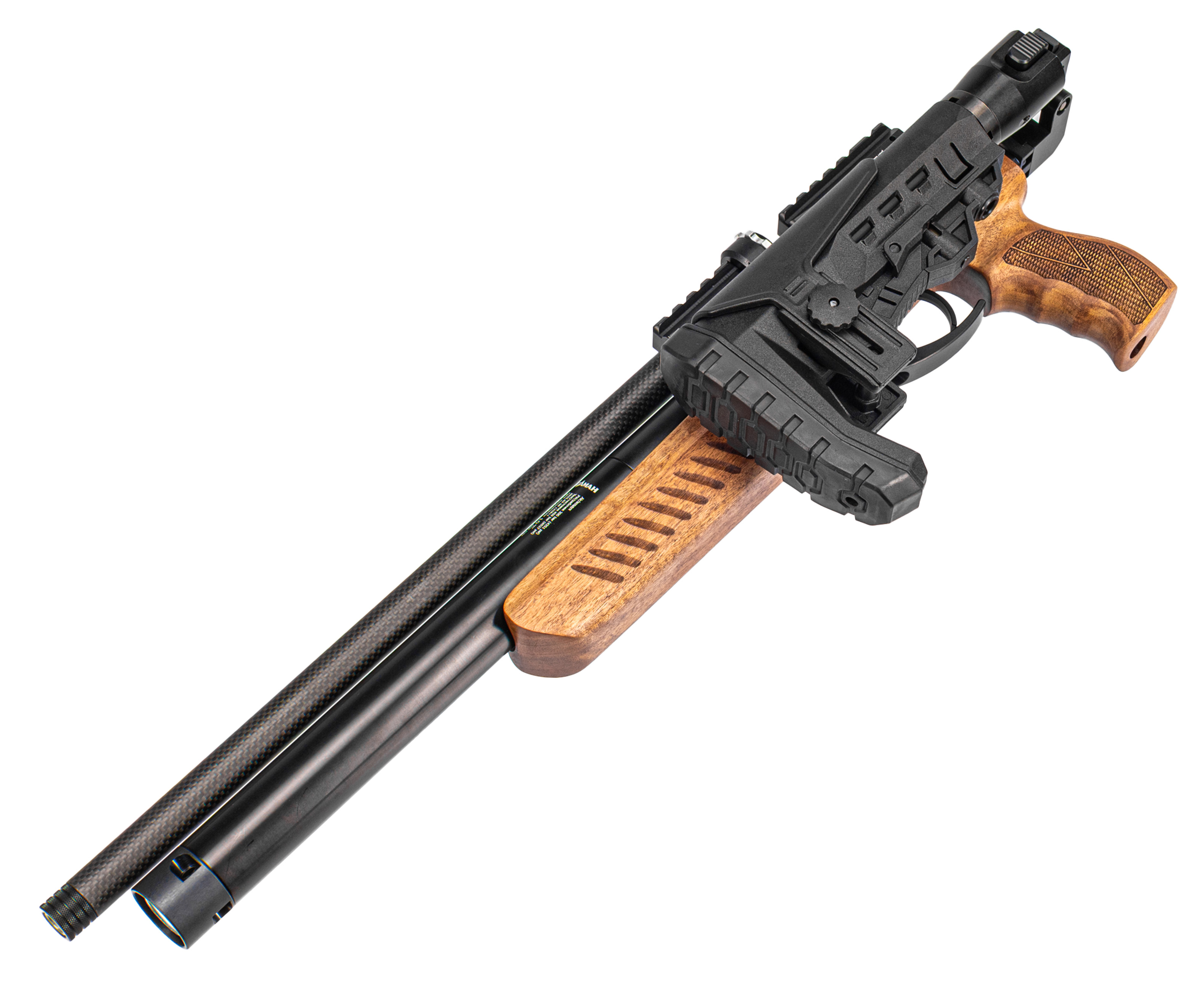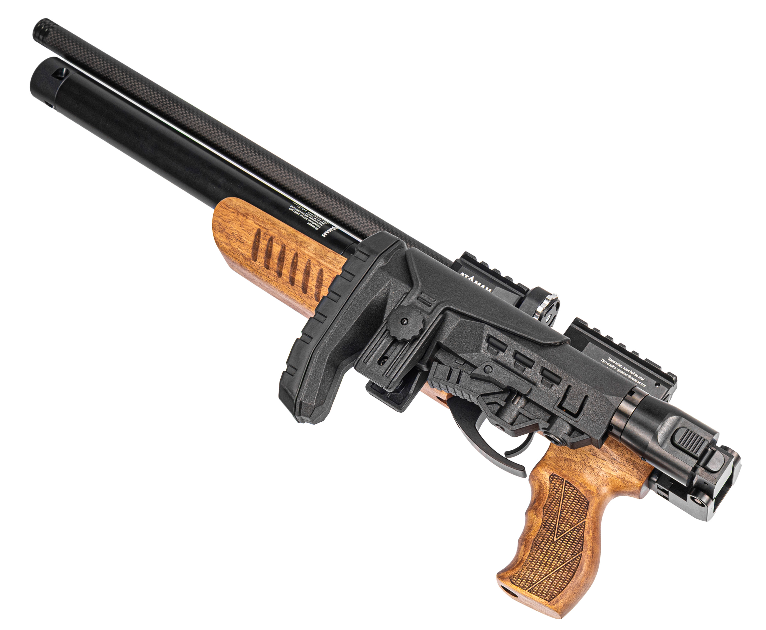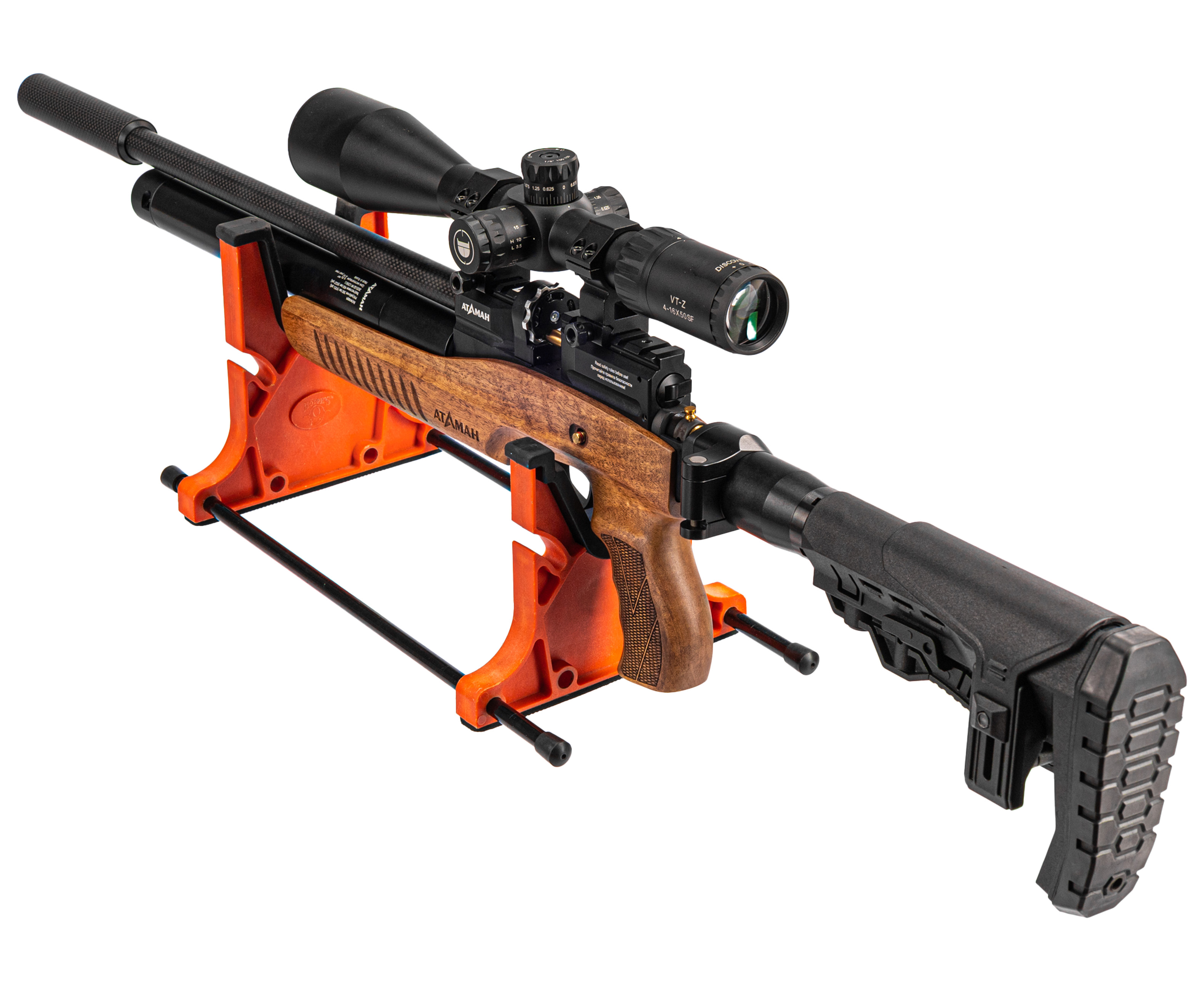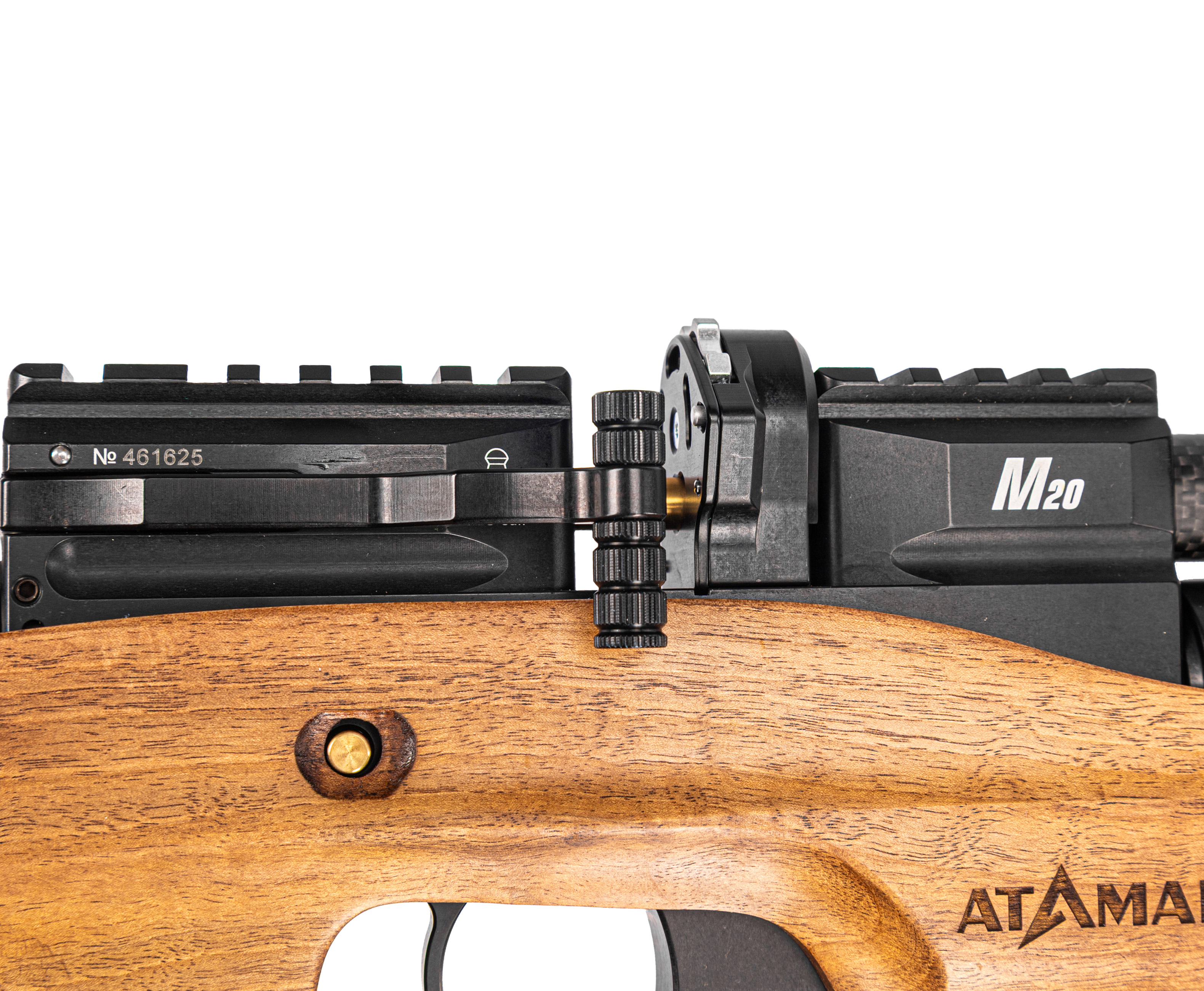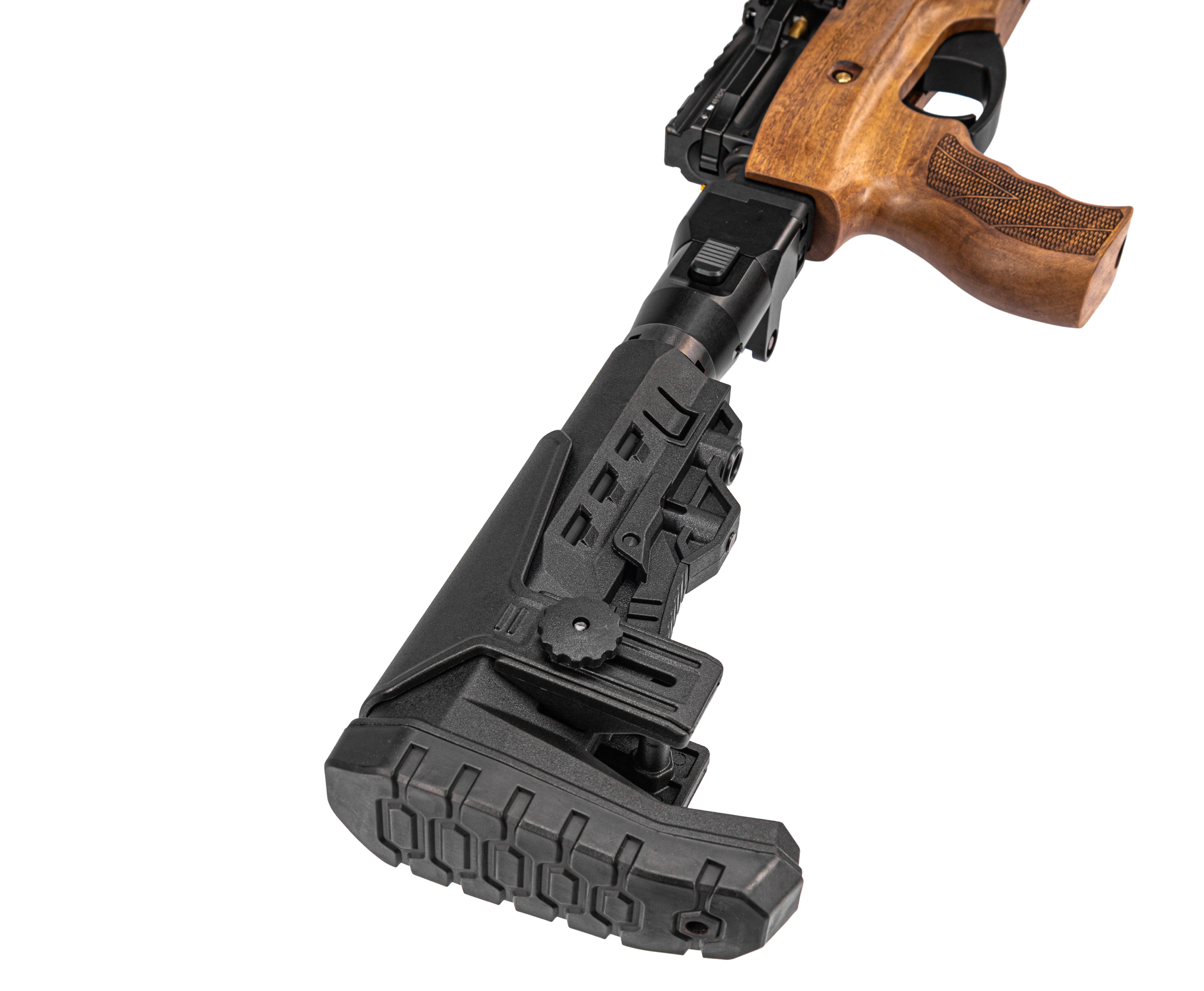Представленная модификация Ataman M20 647 W привлекает внимание продуманной антропометрической организацией, достигнутой за счет включения пистолетной рукояти и приклада с телескопической регулировкой и складным механизмом. Подобные решения обеспечивают отстройку длины плечевого упора под телосложение стрелка и упрощают транспортировку оборудования до места стрельбища. Полные габаритные показатели модели достигают 1030 мм.