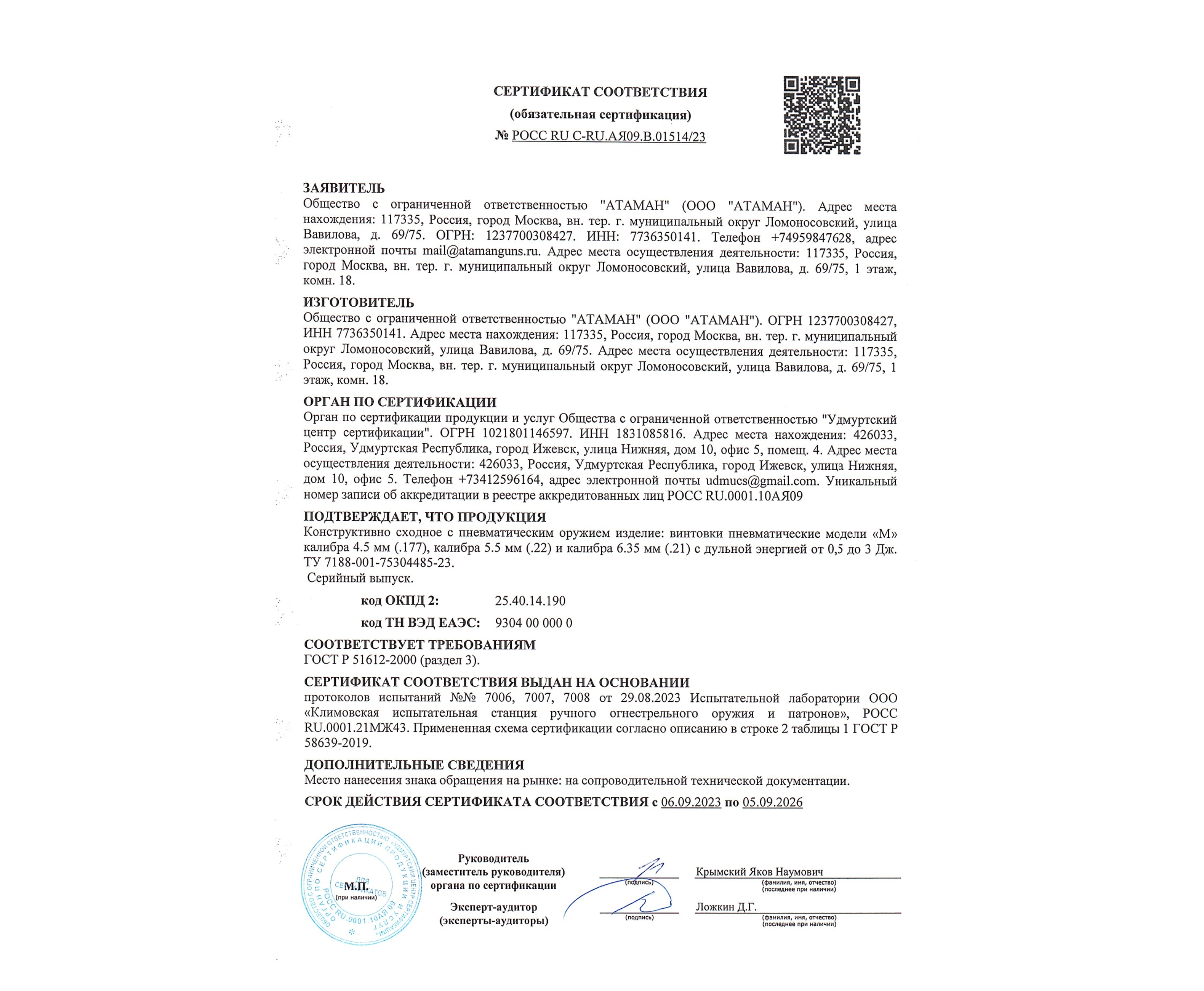 Эта модель располагает к стрельбе полнотелыми пулями повышенной массы - такие заряды могут выходить из среза ствола винтовки Ataman со скоростью 300 метро в сек. Тем не менее, в рассматриваемом случае на изделие распространяется ограничение энергии - снаряд не сможет развить скорость выше 3 Дж ввиду законодательных требований. Последнее не позволяет идентифицировать образец в качестве оружия, а значит ограничений к обороту нет.