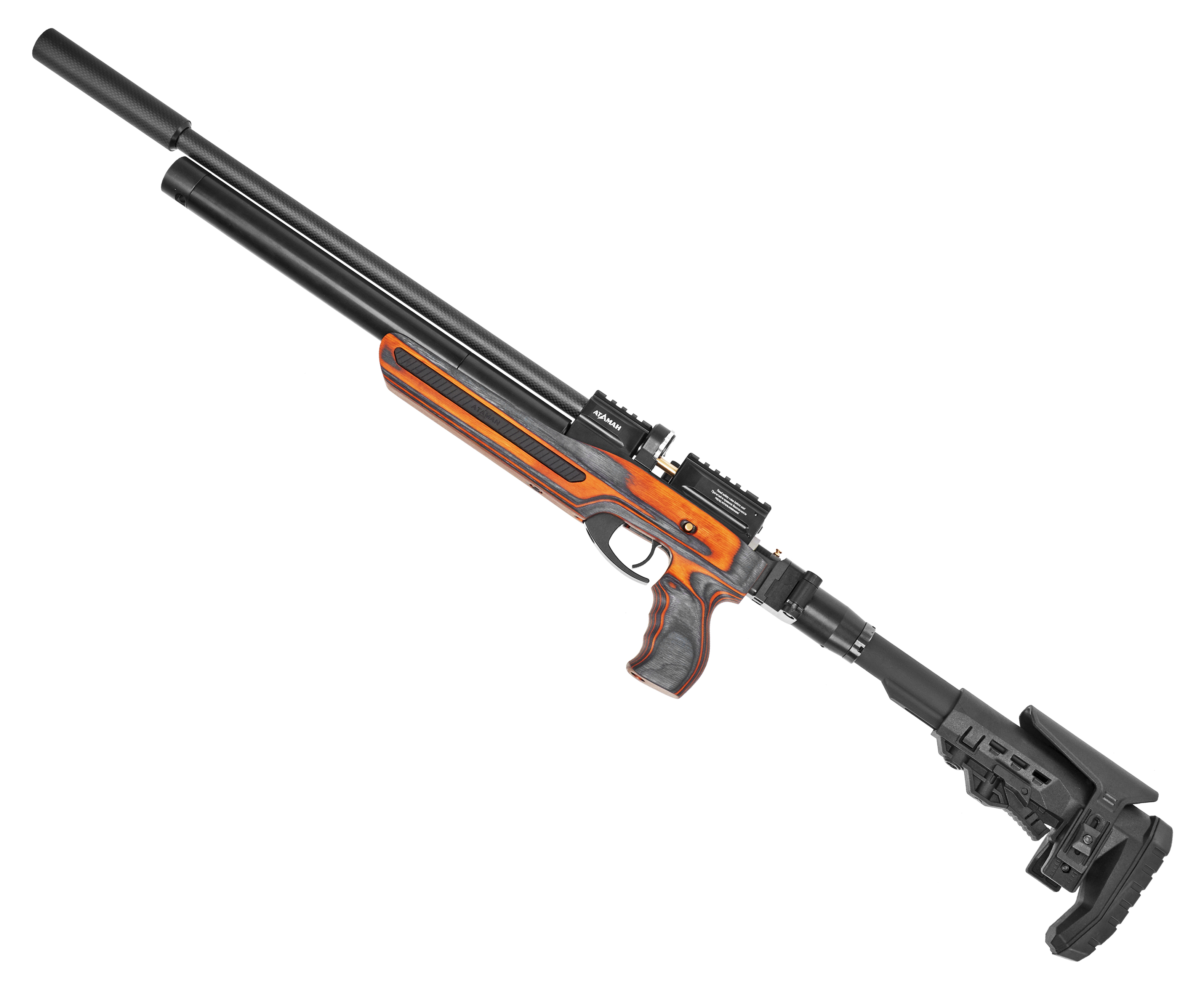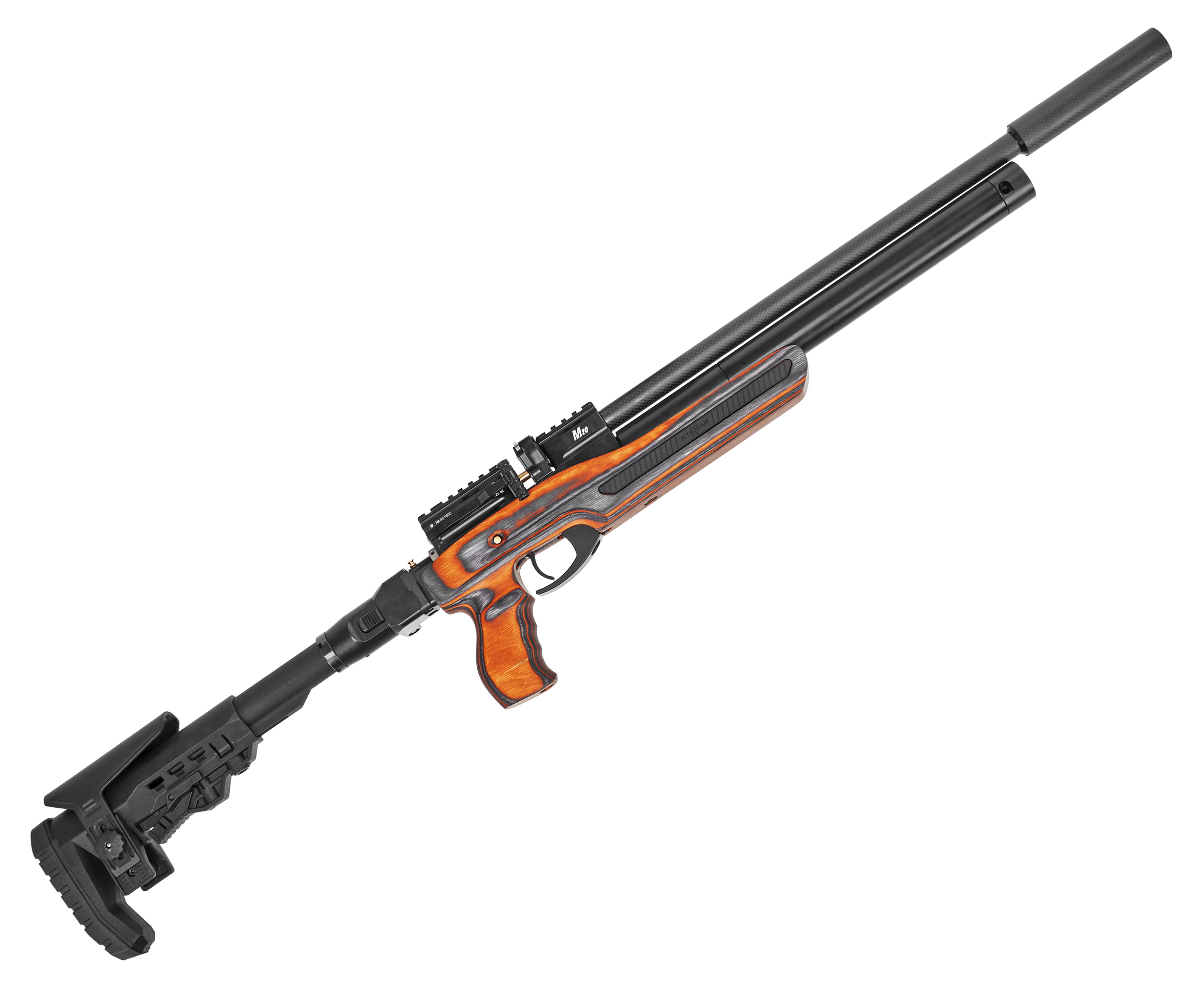 Полная длина изделия составляет 1030 мм - модель предусматривает приклад с комбинированным функционалом, то есть пользователь может либо выдвинуть плечевой упор под антропометрию, либо вовсе сложить его для транспортировки. Кроме того, присутствует регулируемый по вылету затыльник, а также эргономичная пистолетная рукоять с рельефными зонами для пальцев. Ложе изготовили из ламината в насыщенном оранжевом цветовом решении.