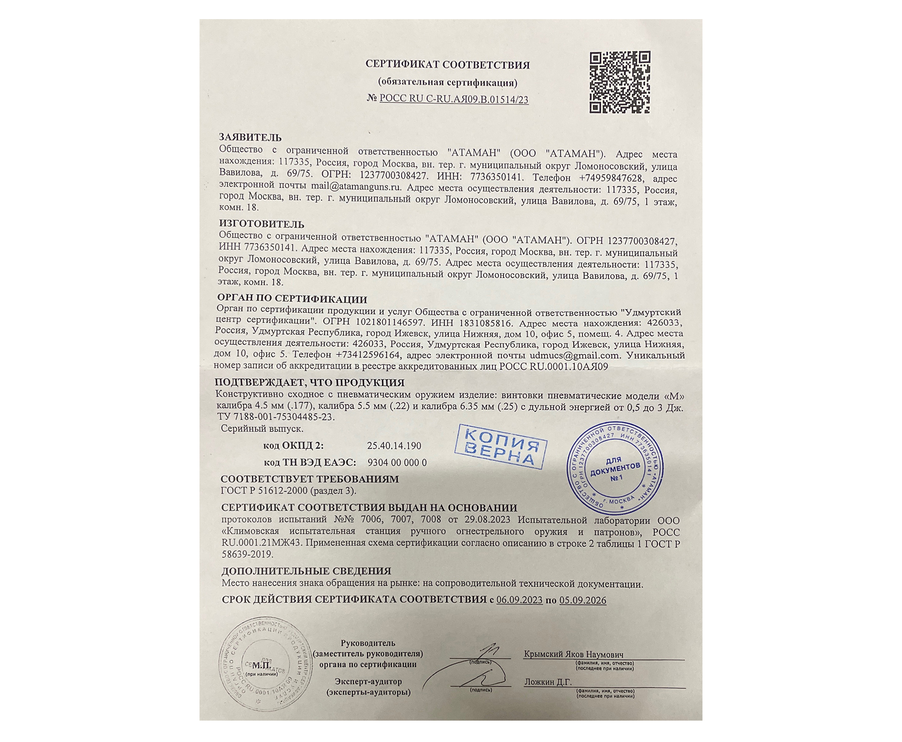 Внимание! Данная модель поставляется в разрешенной мощности для свободного приобретения на территории Российской Федерации. При этом в модели имеется возможность увеличения мощности путем замены части деталей или настройки конструкции, однако не стоит забывать о Федеральном законе «Об оружии» № 150 - ФЗ. В случае необходимости, опираясь на данный закон и руководствуясь им, возможно, потребуется получить разрешение от ЛЛР ГУ МВД России после вмешательства в конструкцию.
