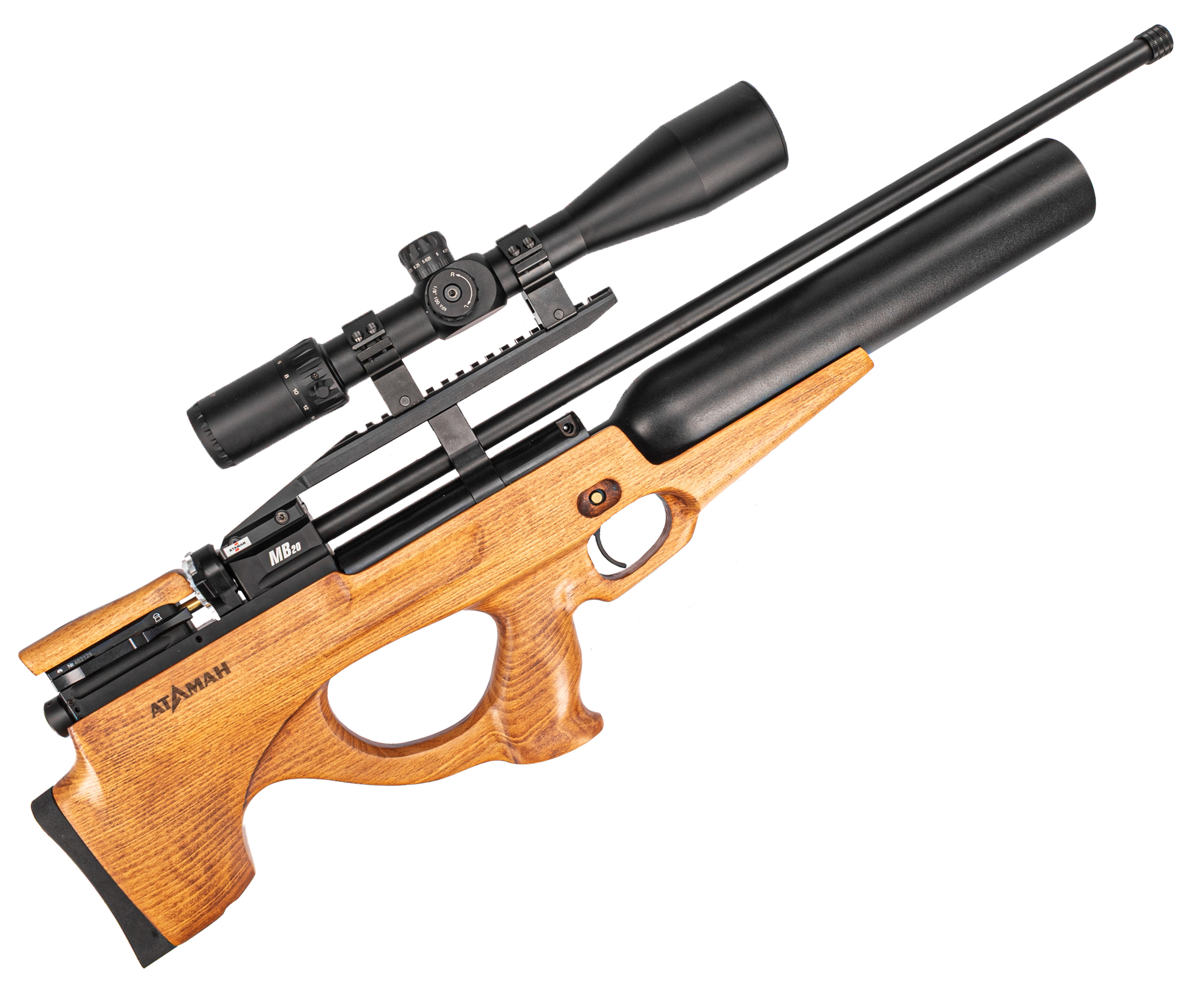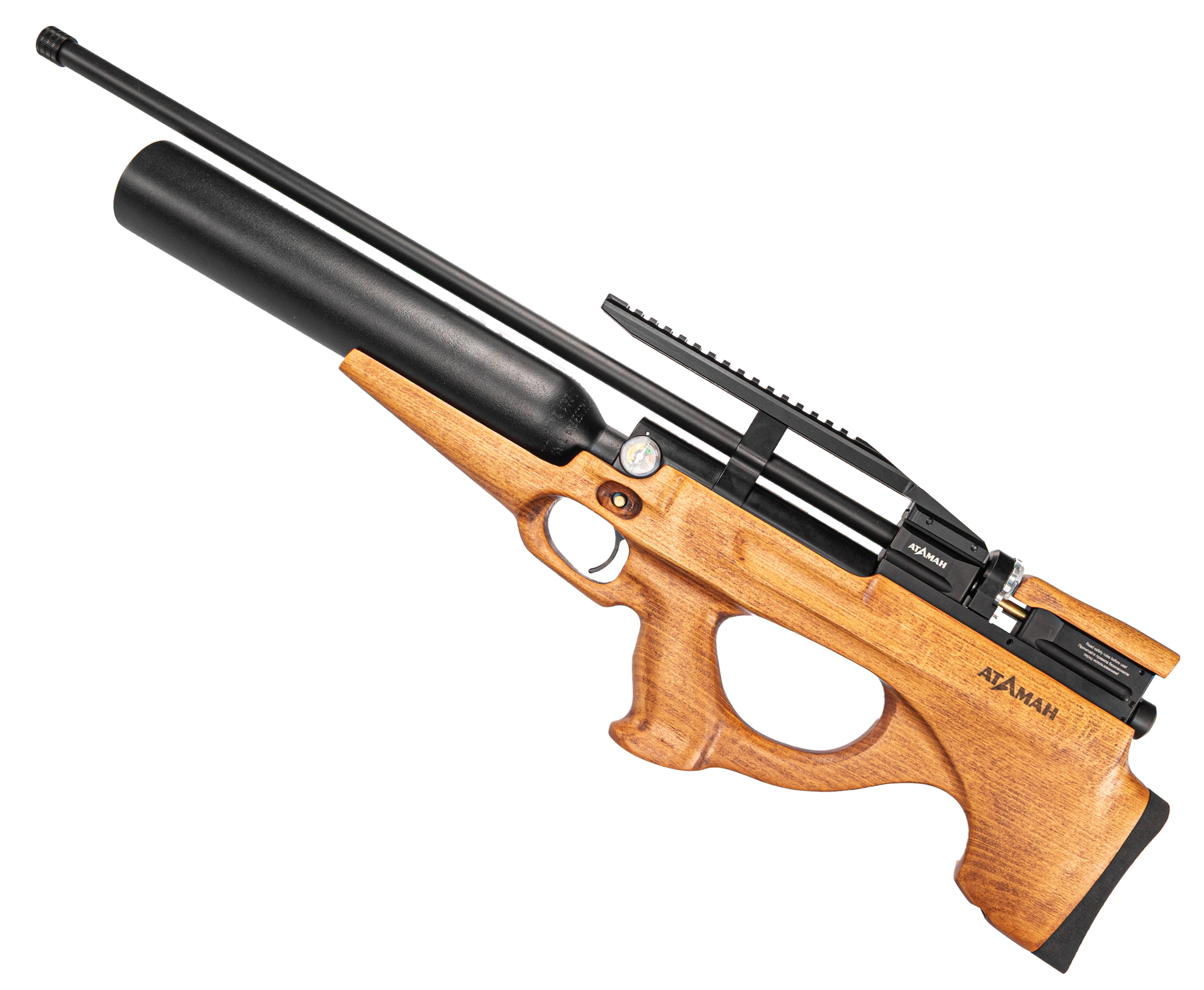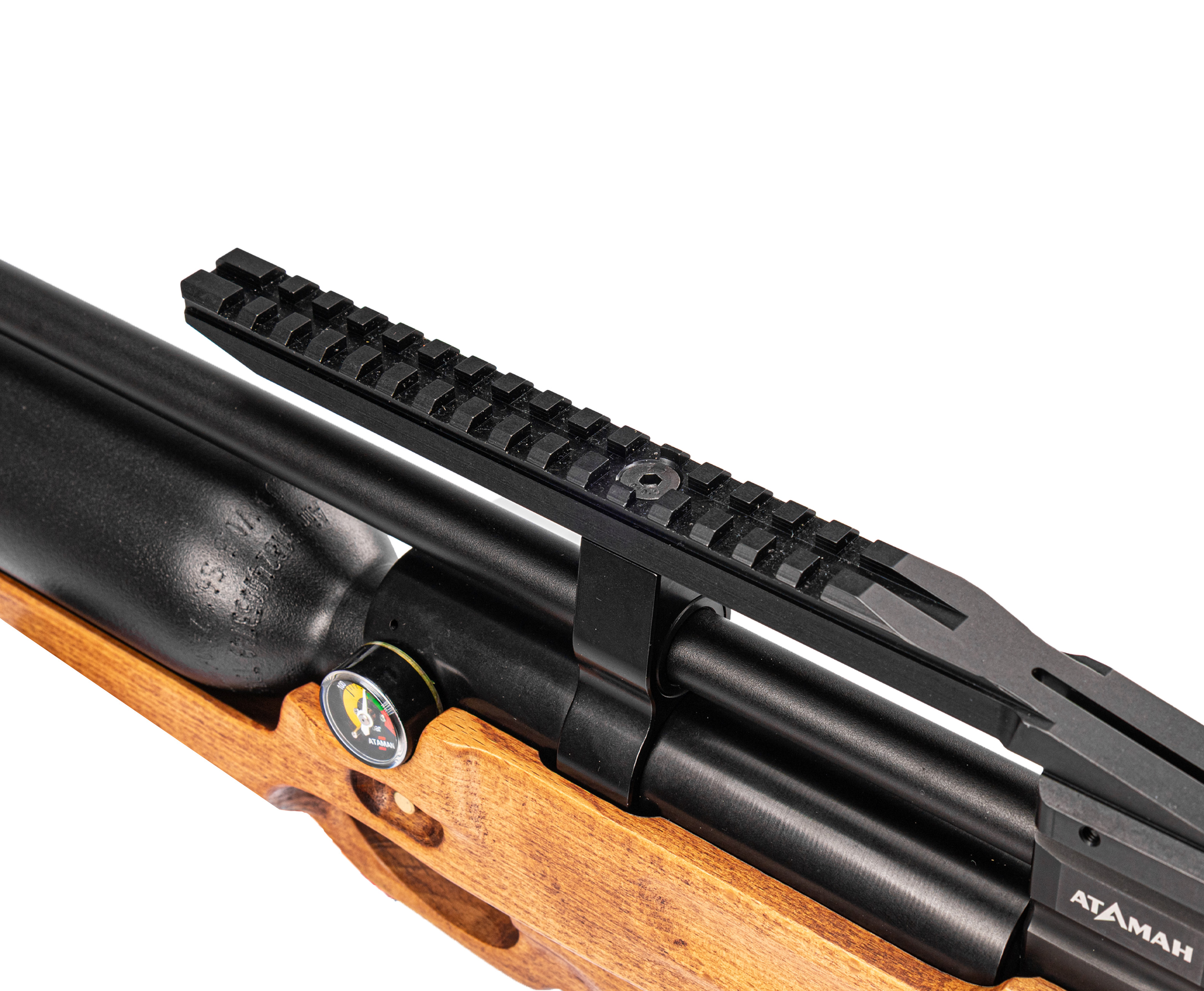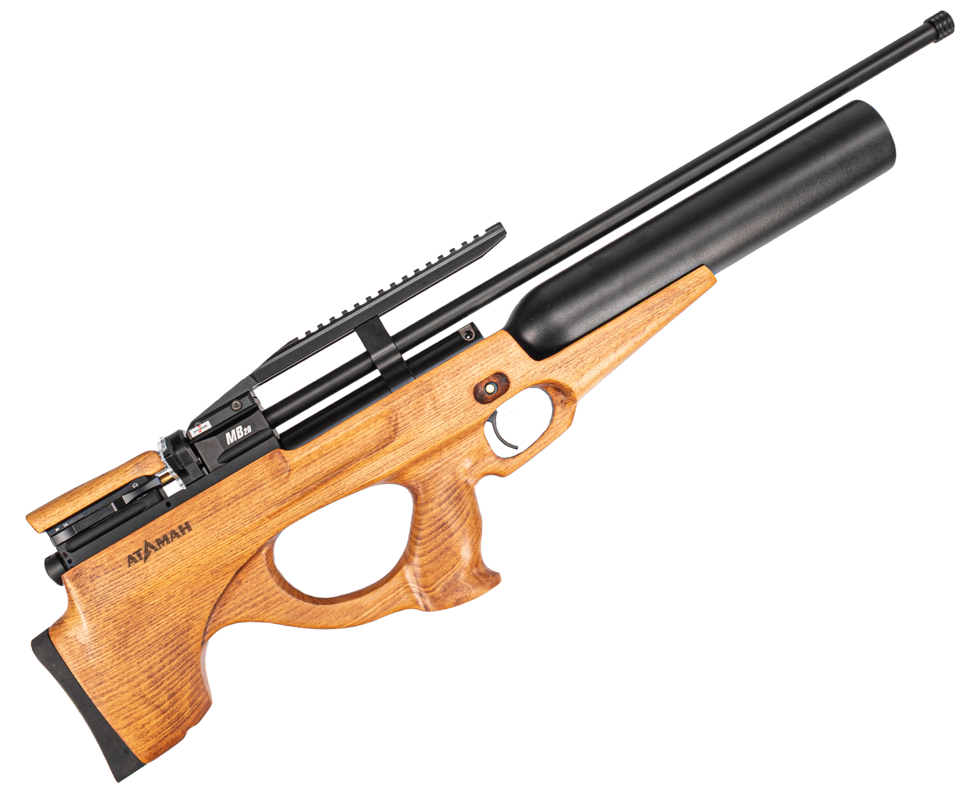 Атаман MB20L 6.35 Бук оборудован специальной мостовой конструкцией с рельсой Вивера 22 миллиметра, на которую устанавливаются прицельные приборы. Благодаря этому пользователь сможет подобрать комфортный вариант коллиматора или оптики для меткой стрельбы. Более того, на ствольном бланке предусмотрена резьба, применяемая для монтажа модератора звука, снижающего шум выхлопа пневматики.