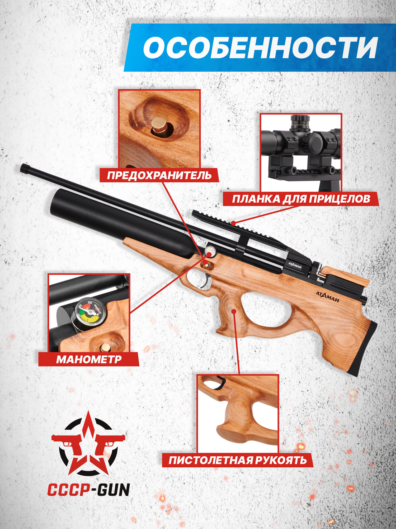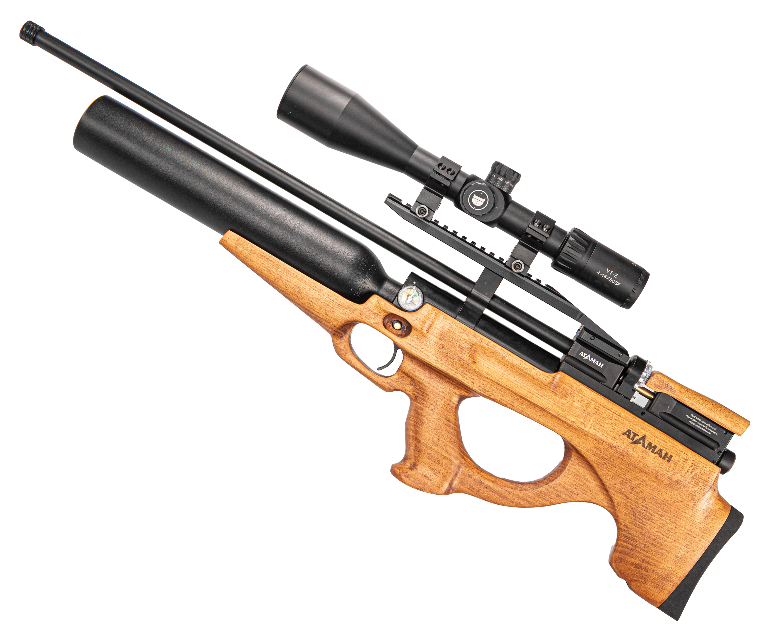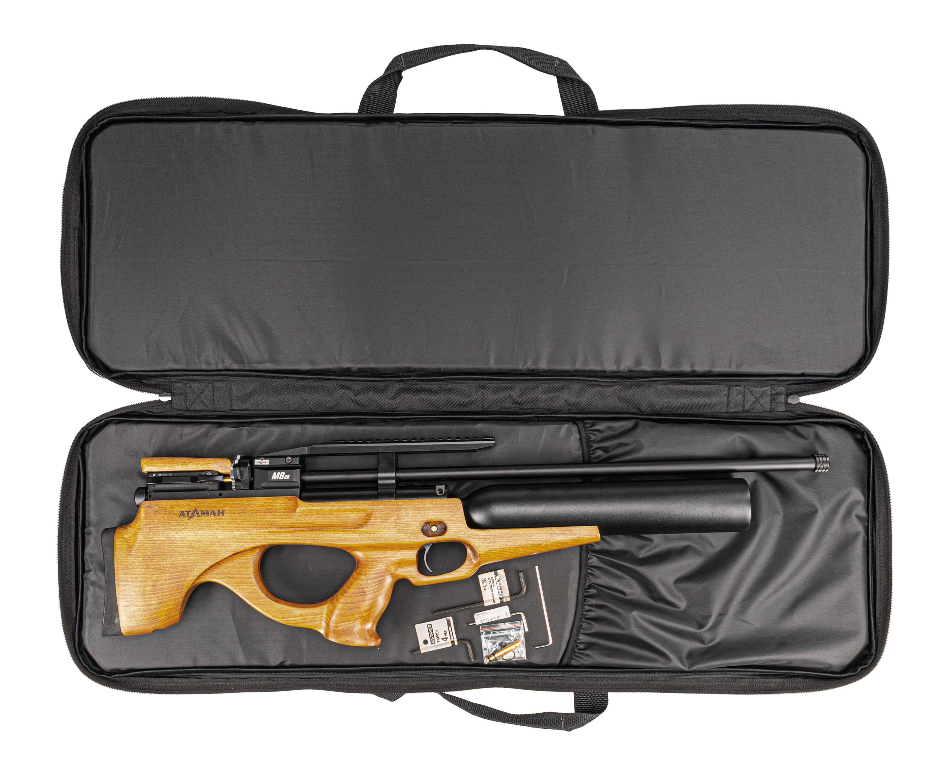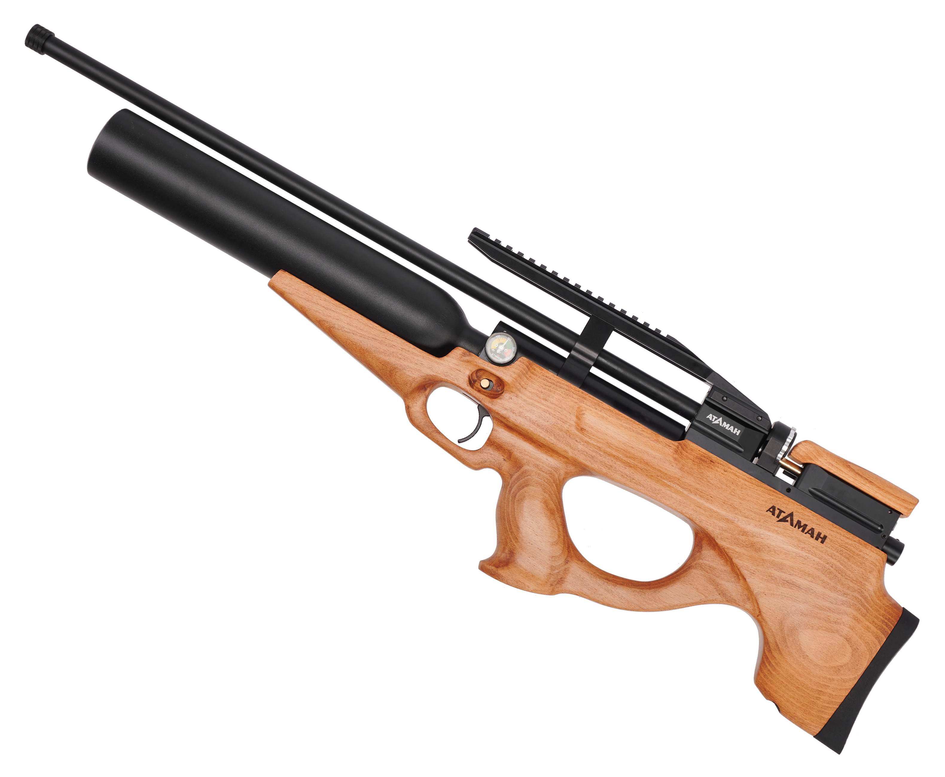 Атаман MB20L 6.35 Бук оборудован специальной мостовой конструкцией с рельсой Вивера 22 миллиметра, на которую устанавливаются прицельные приборы. Благодаря этому пользователь сможет подобрать комфортный вариант коллиматора или оптики для меткой стрельбы. Более того, на ствольном бланке предусмотрена резьба, применяемая для монтажа модератора звука, снижающего шум выхлопа пневматики.
