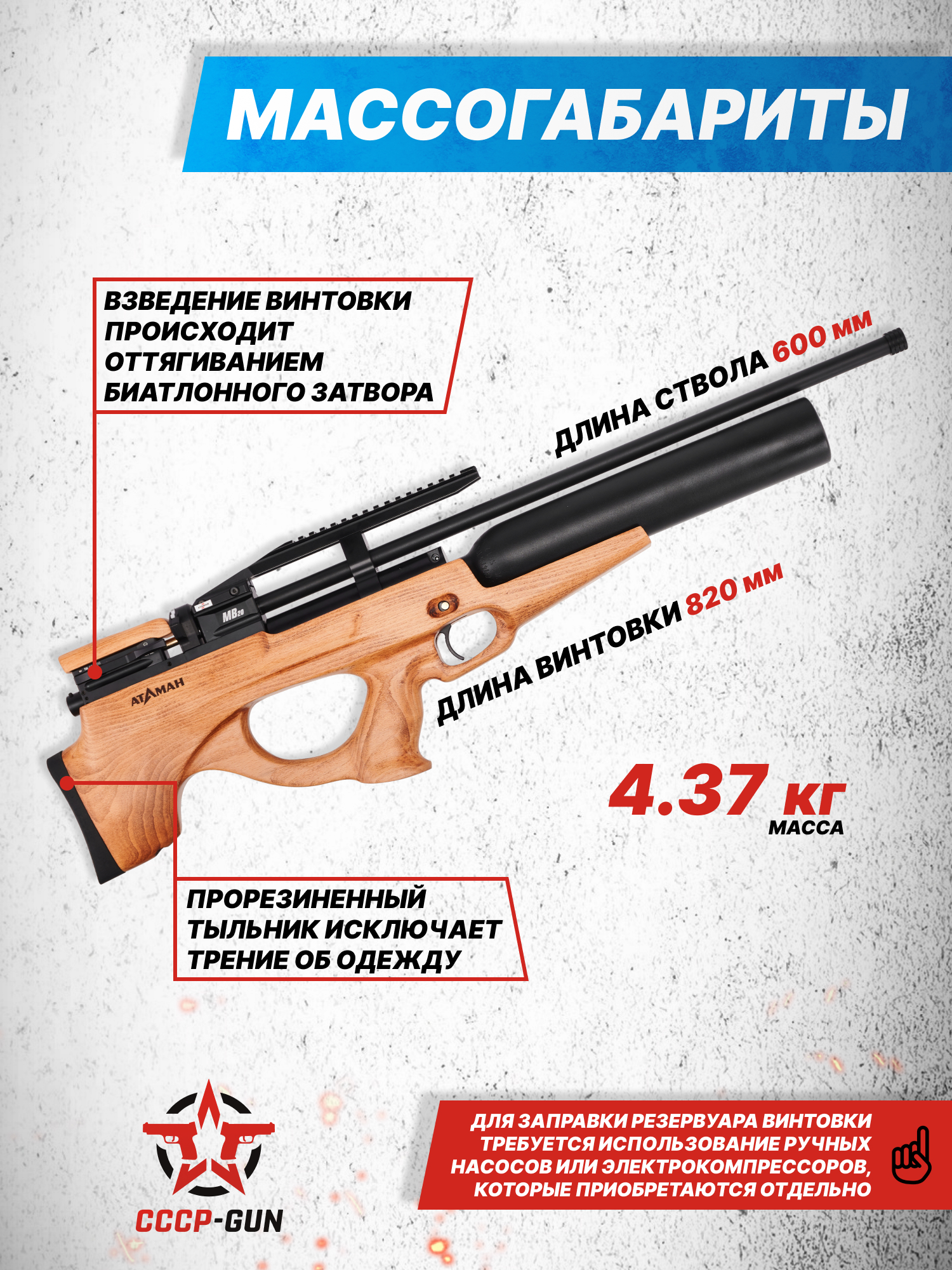 Помимо боеприпасов для стрельбы потребуется насос или компрессор, который подключается через заправочный штуцер из набора для накачки колбы. После усиления винтовки скорость полета снарядов будет достигать порядка 300 метров в секунду. Важно отметить, что на российский рынок производитель выпускает модели с разрешенным параметром штатной мощности, находящимся на отметке до 3 Дж, ввиду чего приобретение изделия не обязует покупателя располагать лицензией на оружие от Росгвардии.