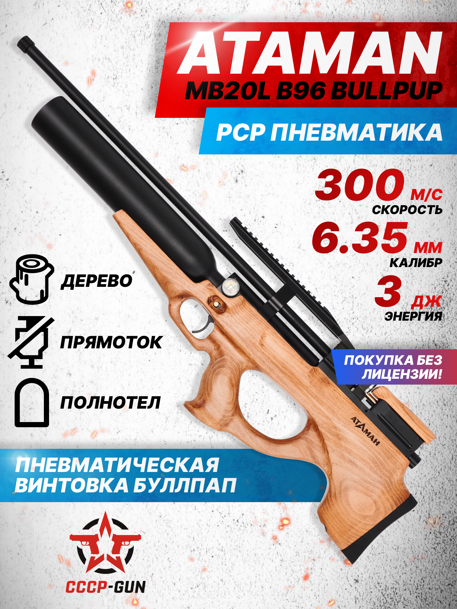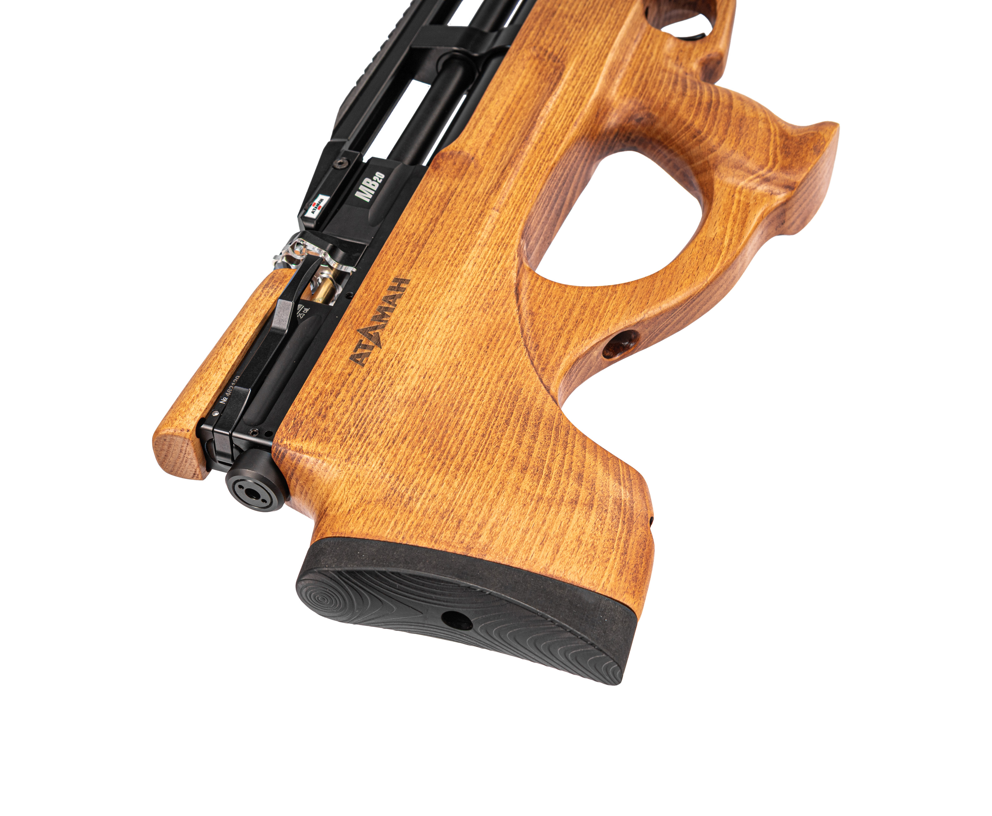 Представленная винтовка Ataman MB20L B96 спроектирована под калибр 6.35 миллиметров и использует в роли боеприпасов полнотелые или воланчиковые свинцовые пули. Нарезной ствол оружия насчитывает 600 миллиметров в длину, при этом габариты изделия компактны благодаря компоновке Bull-Pup и не превышают 82 сантиметров. Масса экземпляра составляет порядка четырех килограмм, а для удобства обращения с пневматикой инженеры предусмотрели эргономичную пистолетную рукоять и ортопедический приклад.