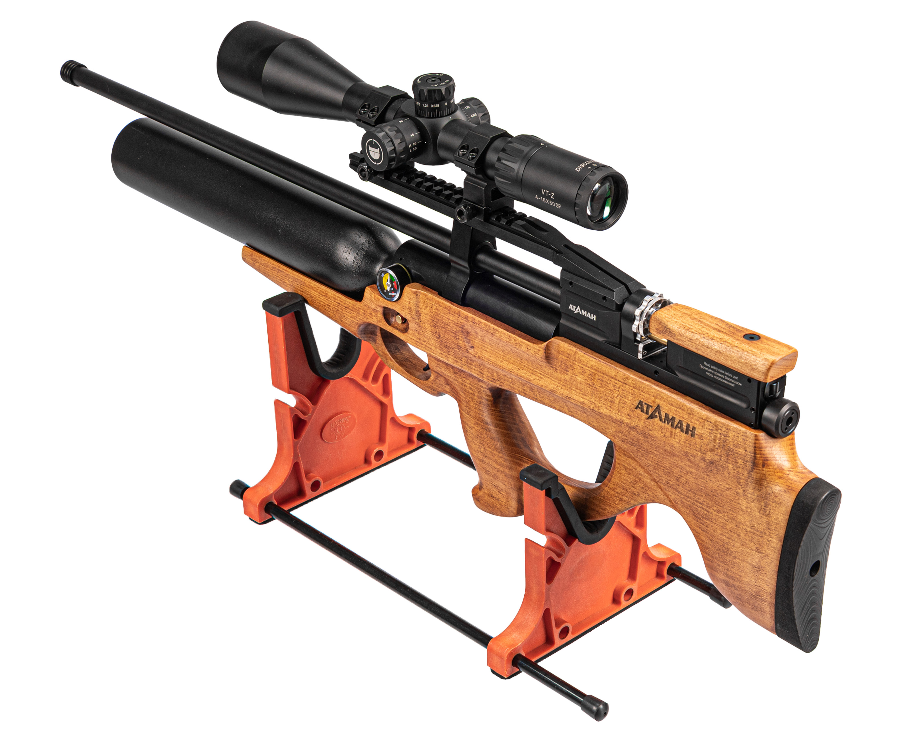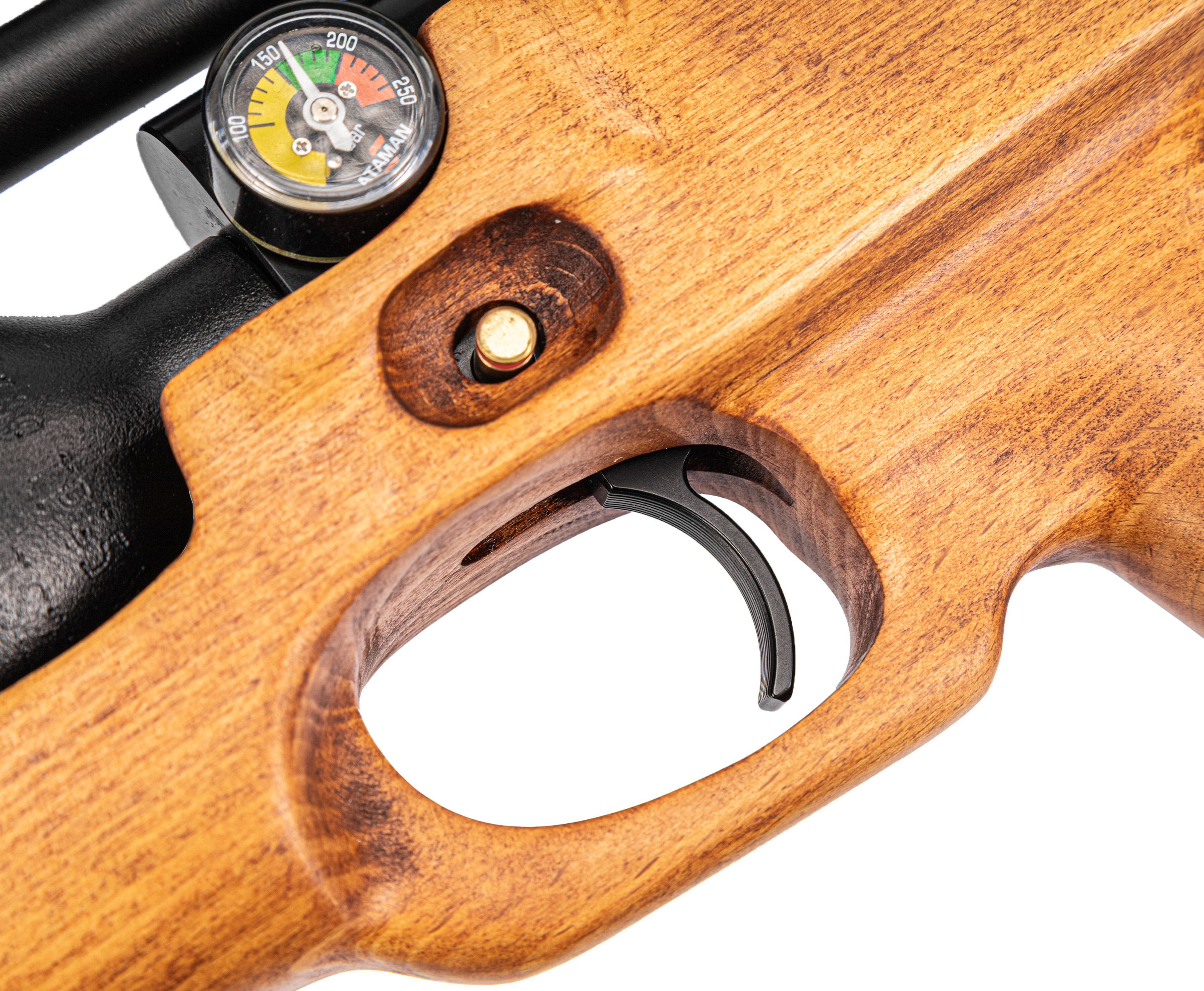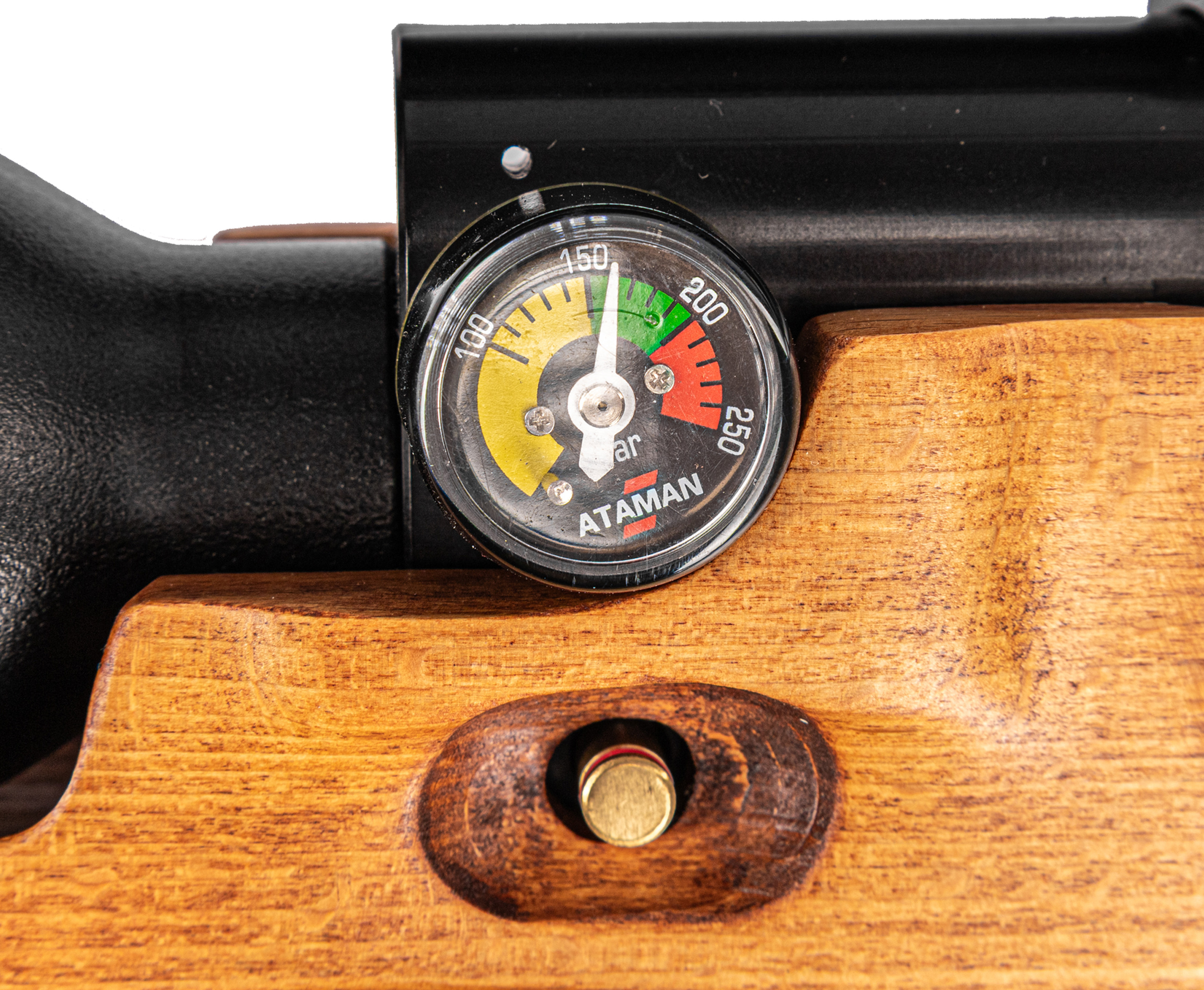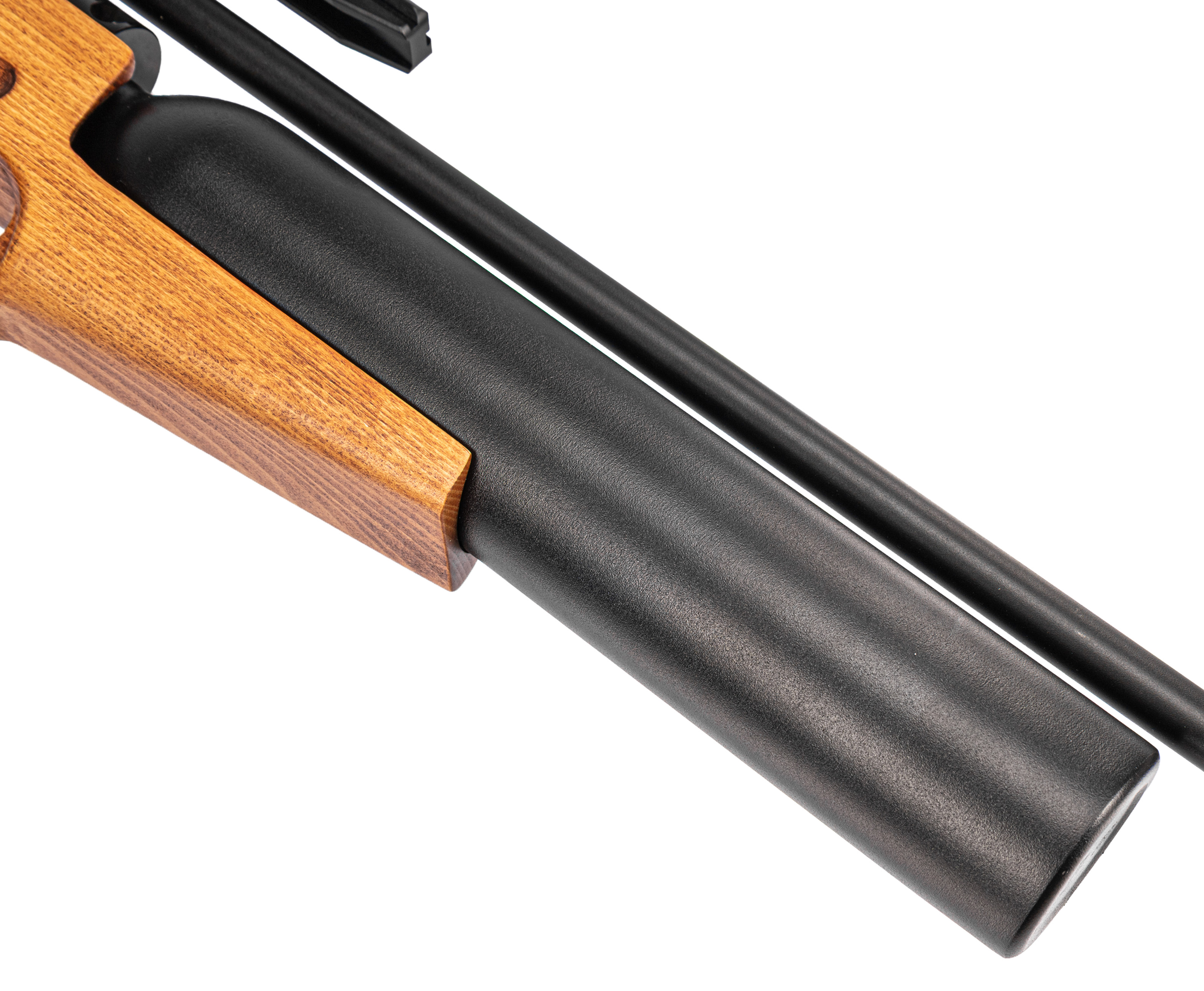 Деревянная ложа обозреваемой винтовки удерживает металлический корпус с большой подствольной колбой. Такой увеличенный ресивер вмещает до 480 кубических сантиметров газа с рекомендуемым давлением в пределах 300 Бар. Высвобождение воздуха происходит по прямотоку, после того как пользователь нажмет на спуск, а контролировать уровень заполнения емкости поможет установленный с левой стороны корпуса манометр.