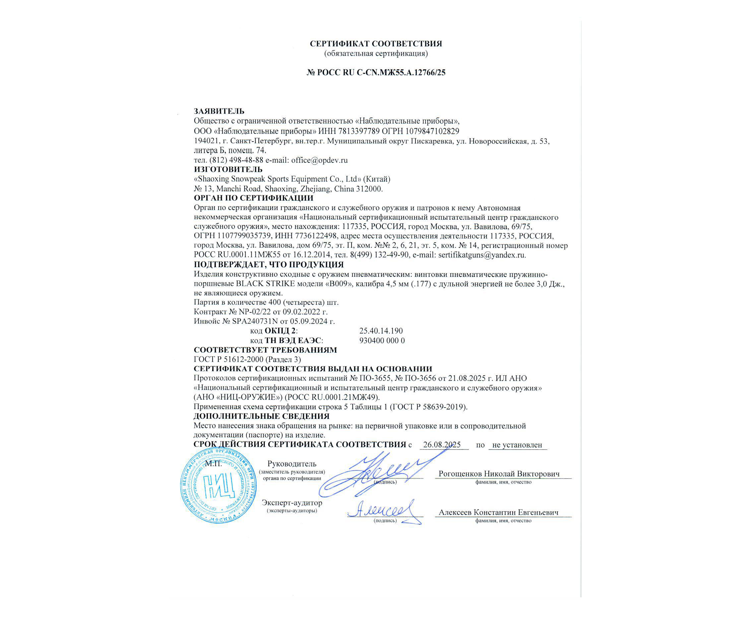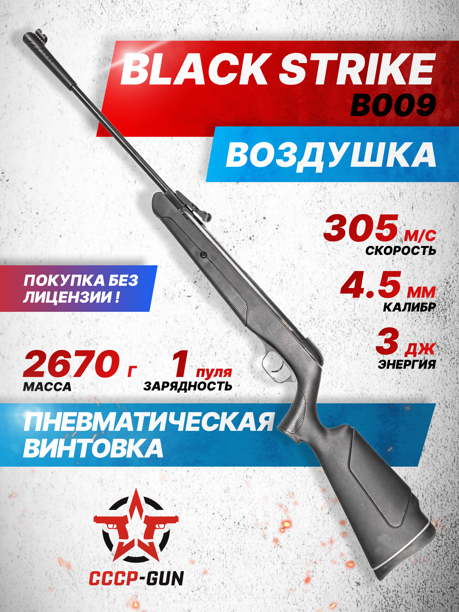 Пневматика B009 - предпочтительный образец для тех, кто бы хотел получить изделие с потенциалом мощности за небольшую сумму. Представленный экземпляр обладает удлиненным компрессором, за счет чего конструкция винтовки способна к тому, чтобы ускорить пульку до 305 м/с. Причем этот аспект не противоречит букве закона - в стандартном заводском виде пневматическая винтовка Black Strike не позволит заряду развить энергию свыше положенных 3J.