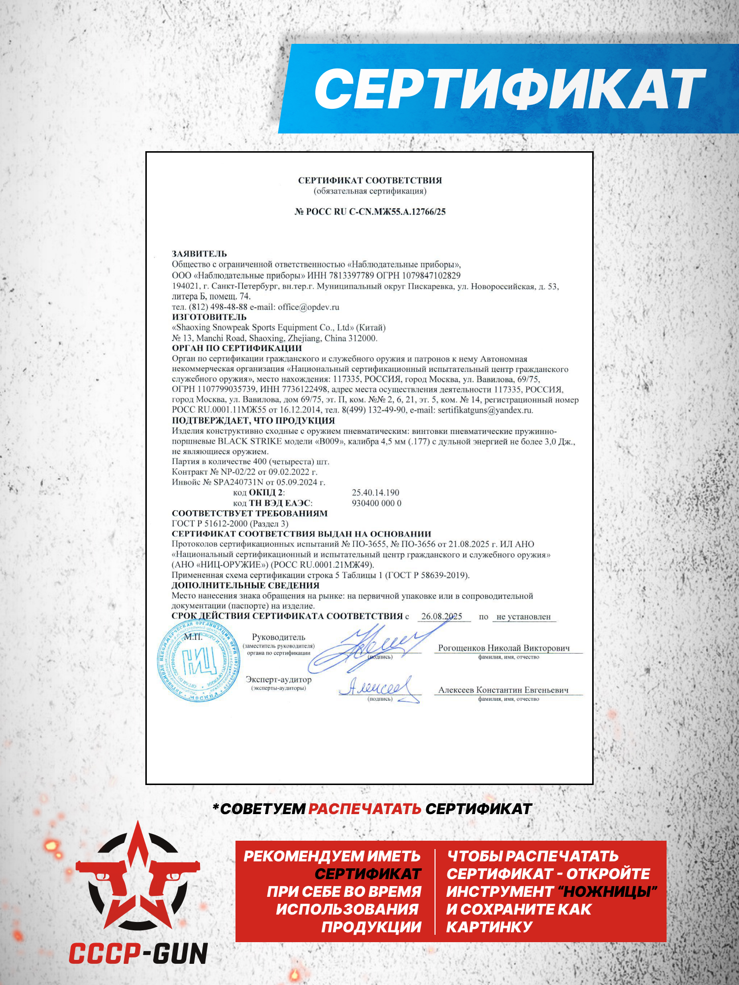 Внимание! Данная модель поставляется в разрешенной мощности для свободного приобретения на территории Российской Федерации. При этом в модели имеется возможность увеличения мощности путем замены части деталей или настройки конструкции, однако не стоит забывать о Федеральном законе «Об оружии» № 150 - ФЗ. В случае необходимости, опираясь на данный закон и руководствуясь им, возможно, потребуется получить разрешение от ЛЛР ГУ МВД России после вмешательства в конструкцию.