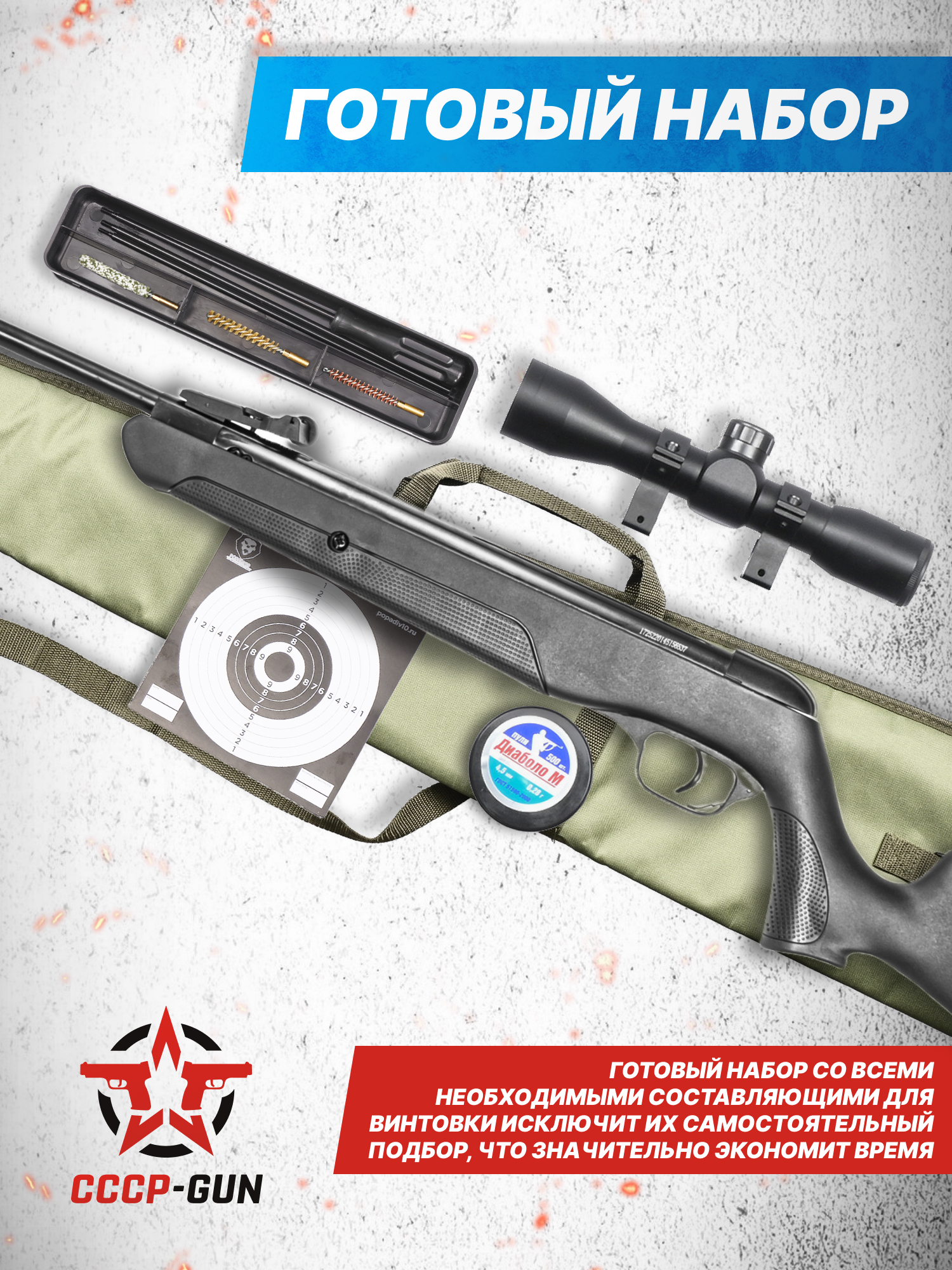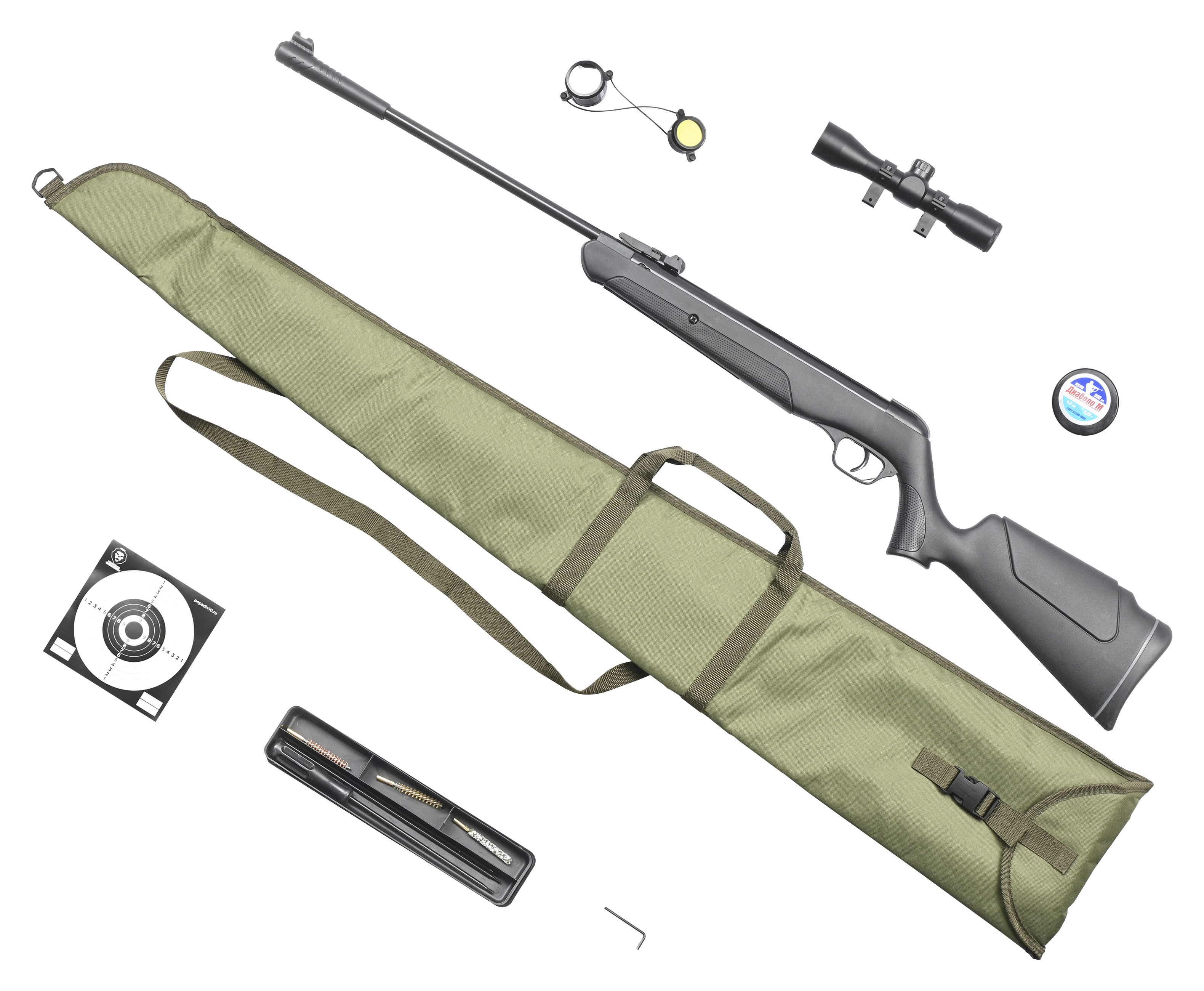 Пружинно поршневое оружие не требует для работы ничего, кроме метаемого снаряда. Пульки вместе с мишенями, а также набором для чистки 480 мм бланка есть в комплекте. Следовательно, пользователь обустроит место для стрельб и обслужит винтовку после тренировки.