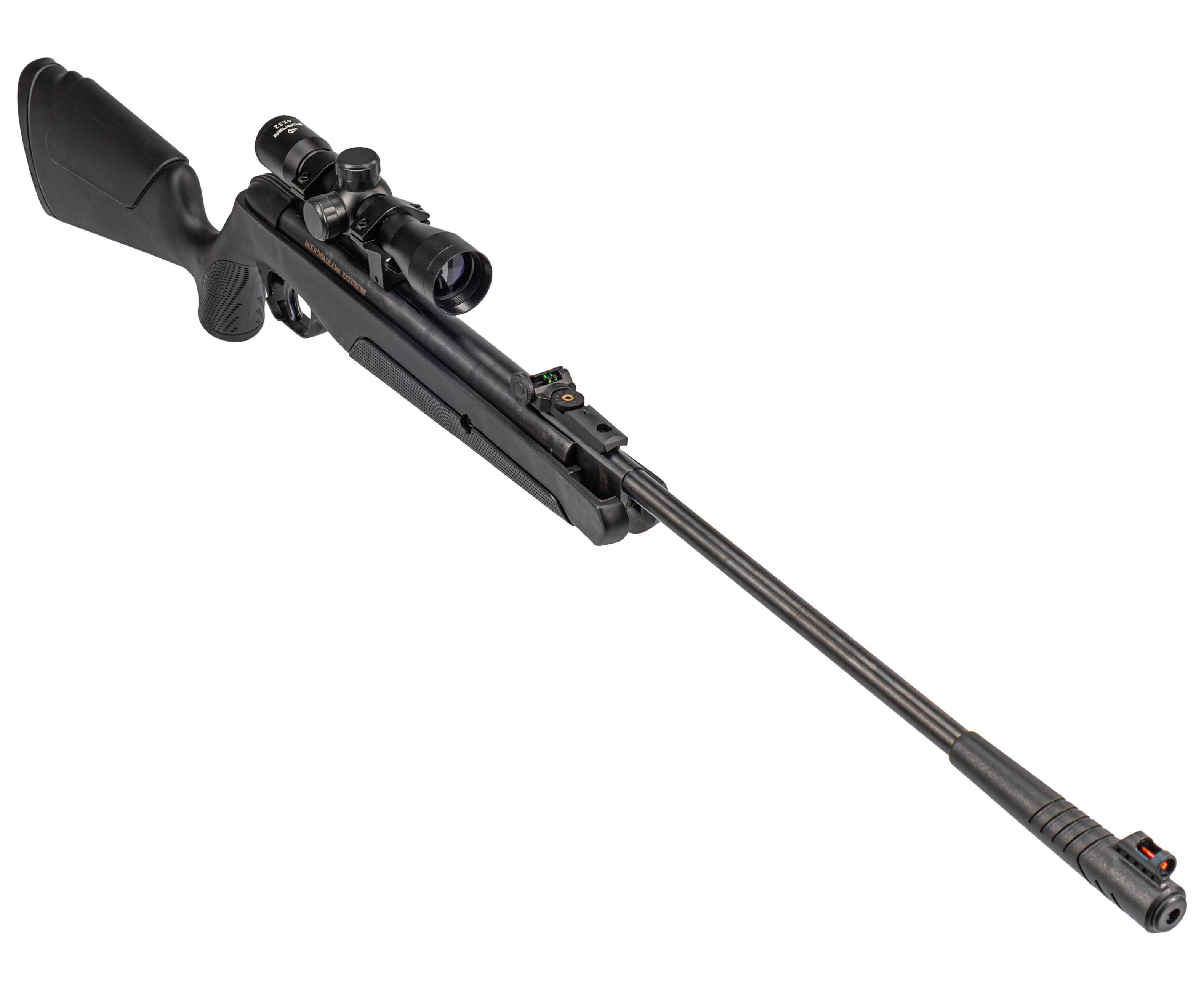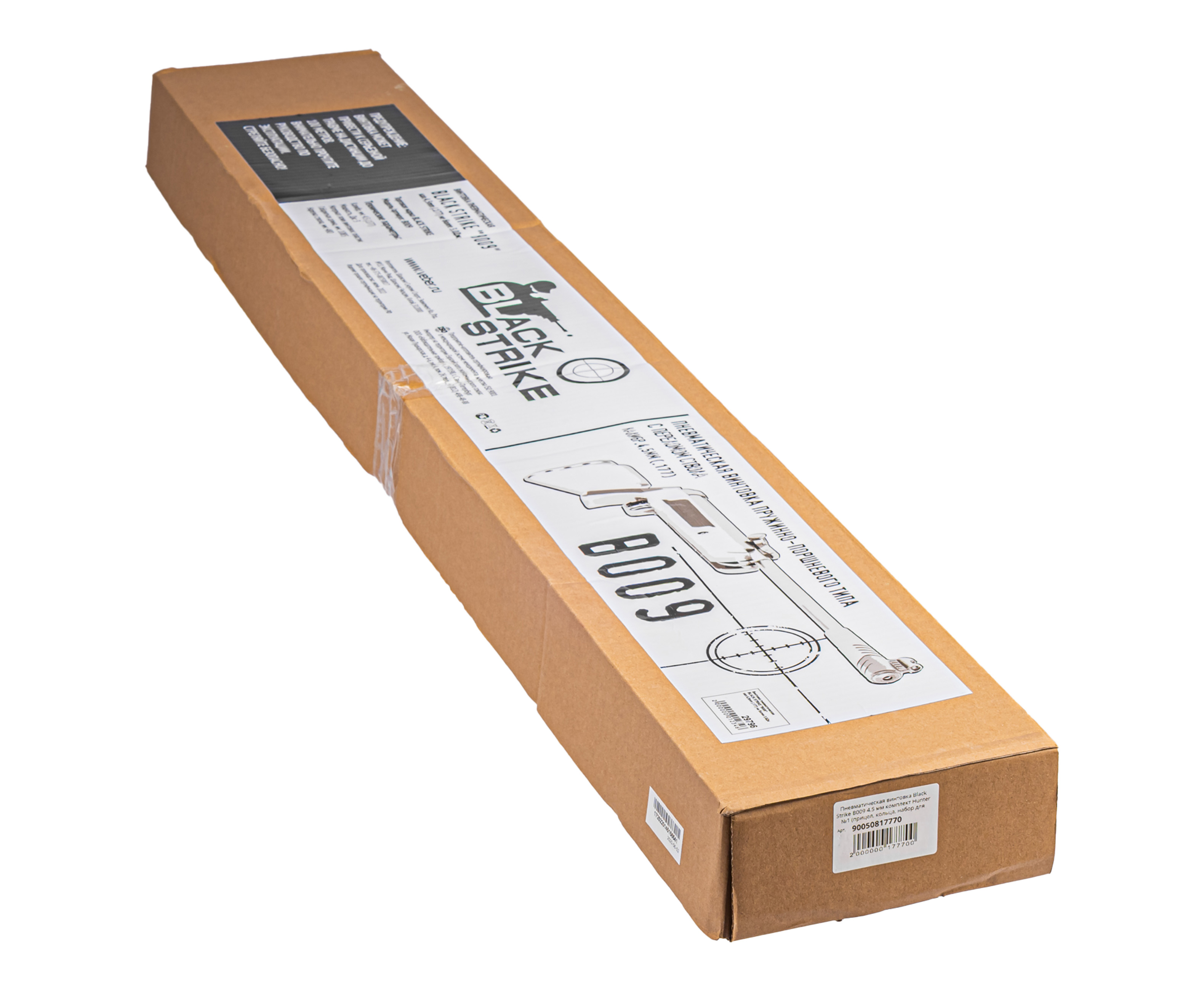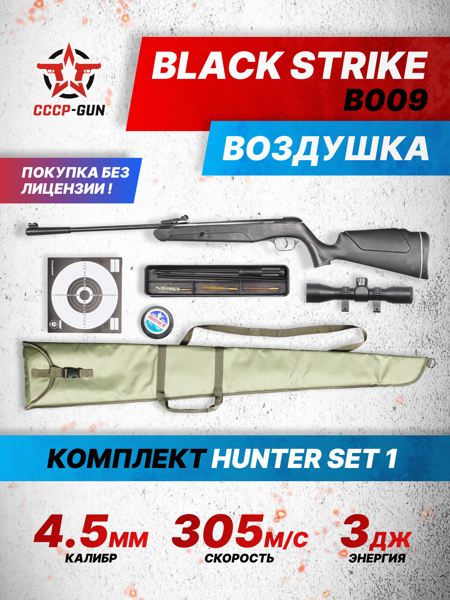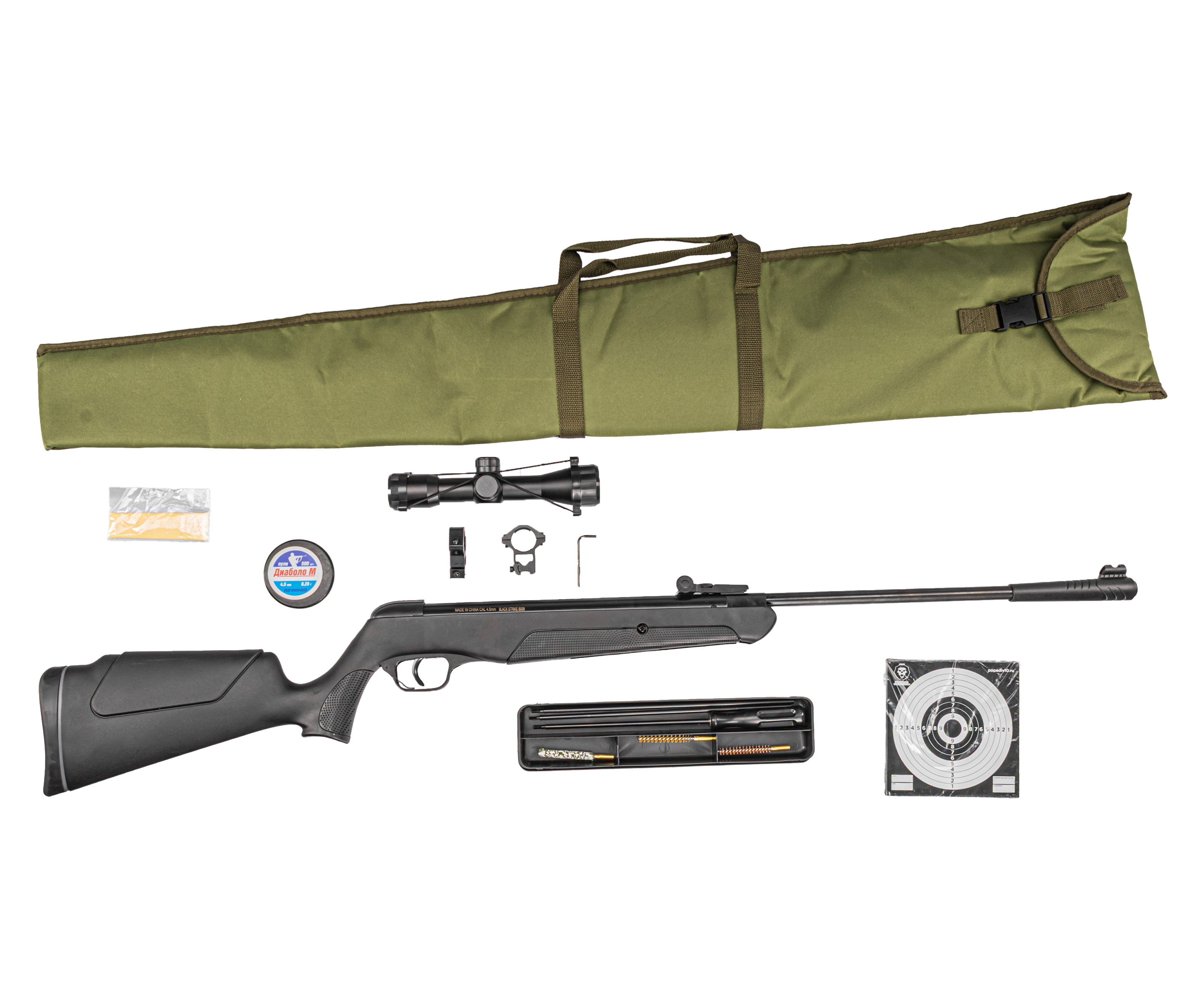В центре представленного набора стоит винтовка B009 в калибре 4.5 мм, представленная брендом Блек Страйк. Несмотря на бюджетную стоимость это надежное оружие, выдающее отличные характеристики, благодаря которым начинающий стрелок будет упражняться продолжительное время не меняя оружия. Иными словами, потенциала пневматики хватит «на вырост».