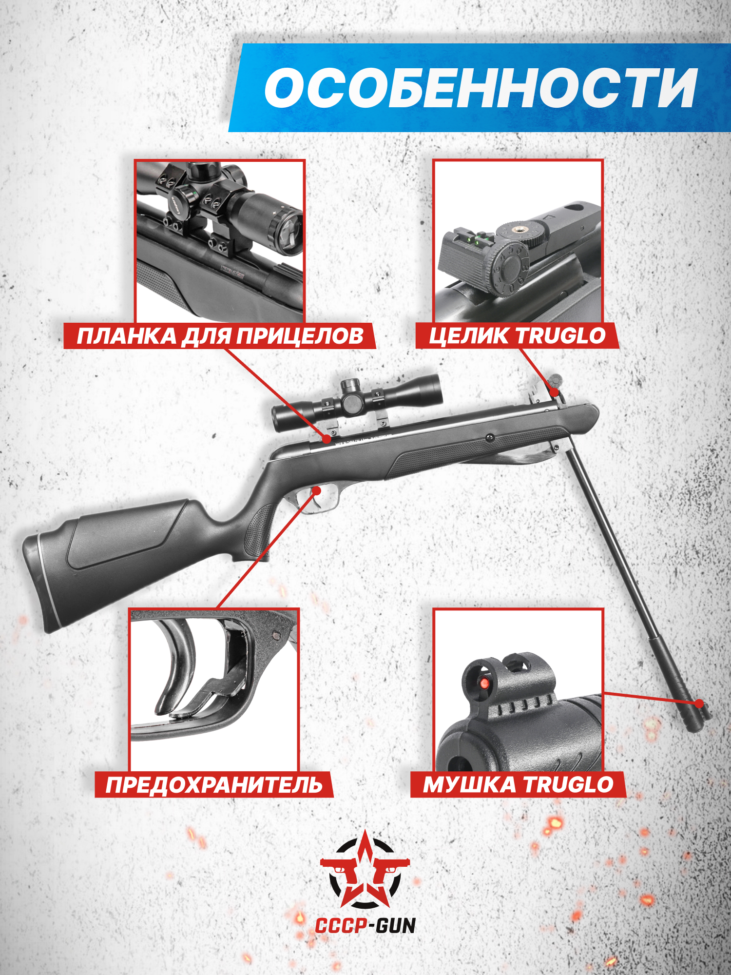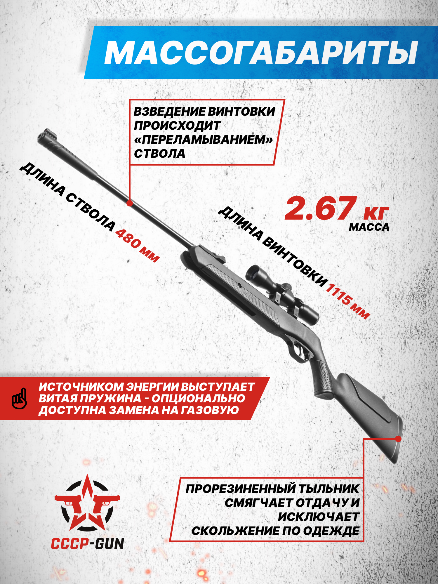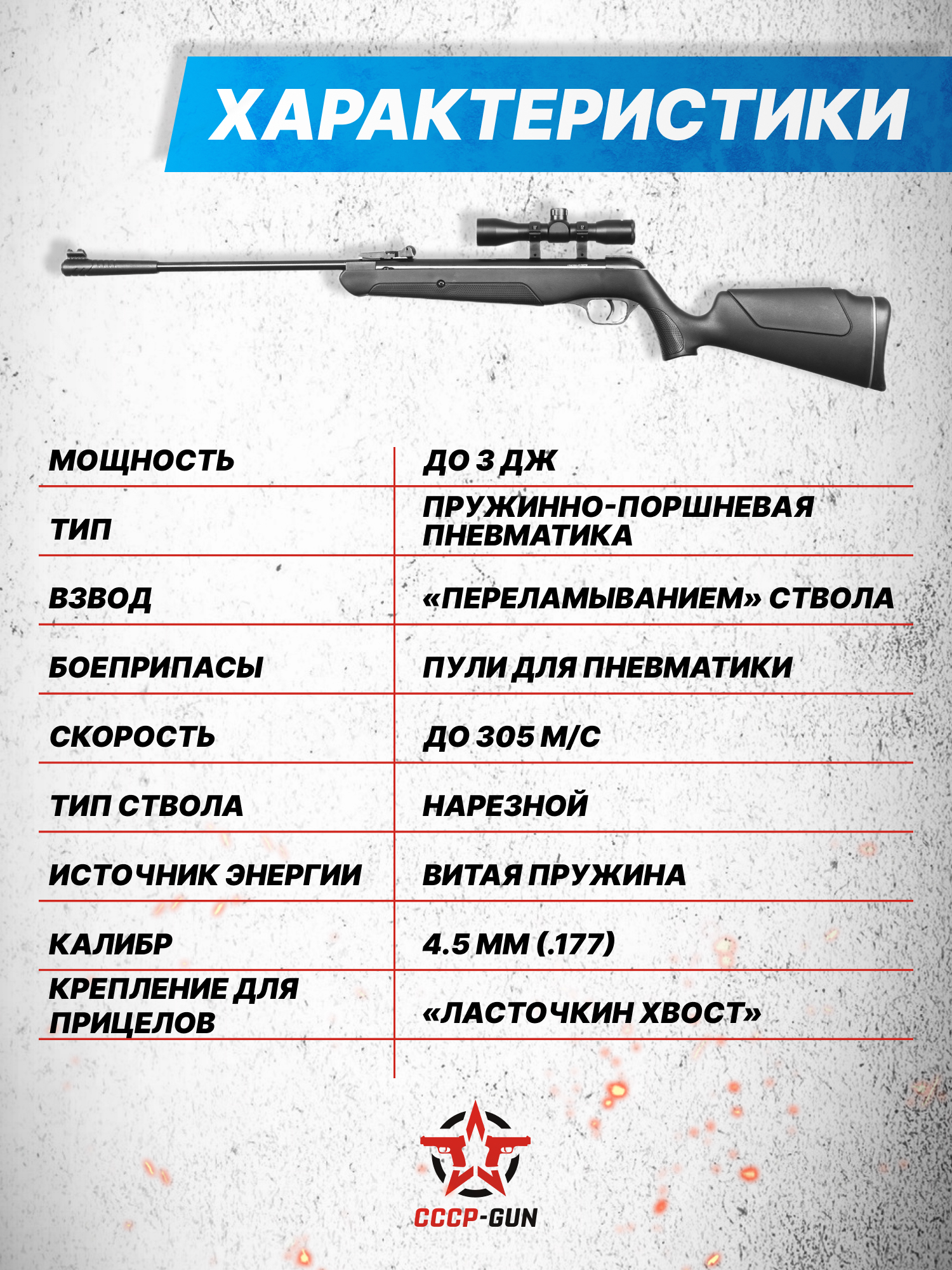 Внимание! Данная модель поставляется в разрешенной мощности для свободного приобретения на территории Российской Федерации. При этом в модели имеется возможность увеличения мощности путем замены части деталей или настройки конструкции, однако не стоит забывать о Федеральном законе «Об оружии» № 150 - ФЗ. В случае необходимости, опираясь на данный закон и руководствуясь им, возможно, потребуется получить разрешение от ЛЛР ГУ МВД России после вмешательства в конструкцию.