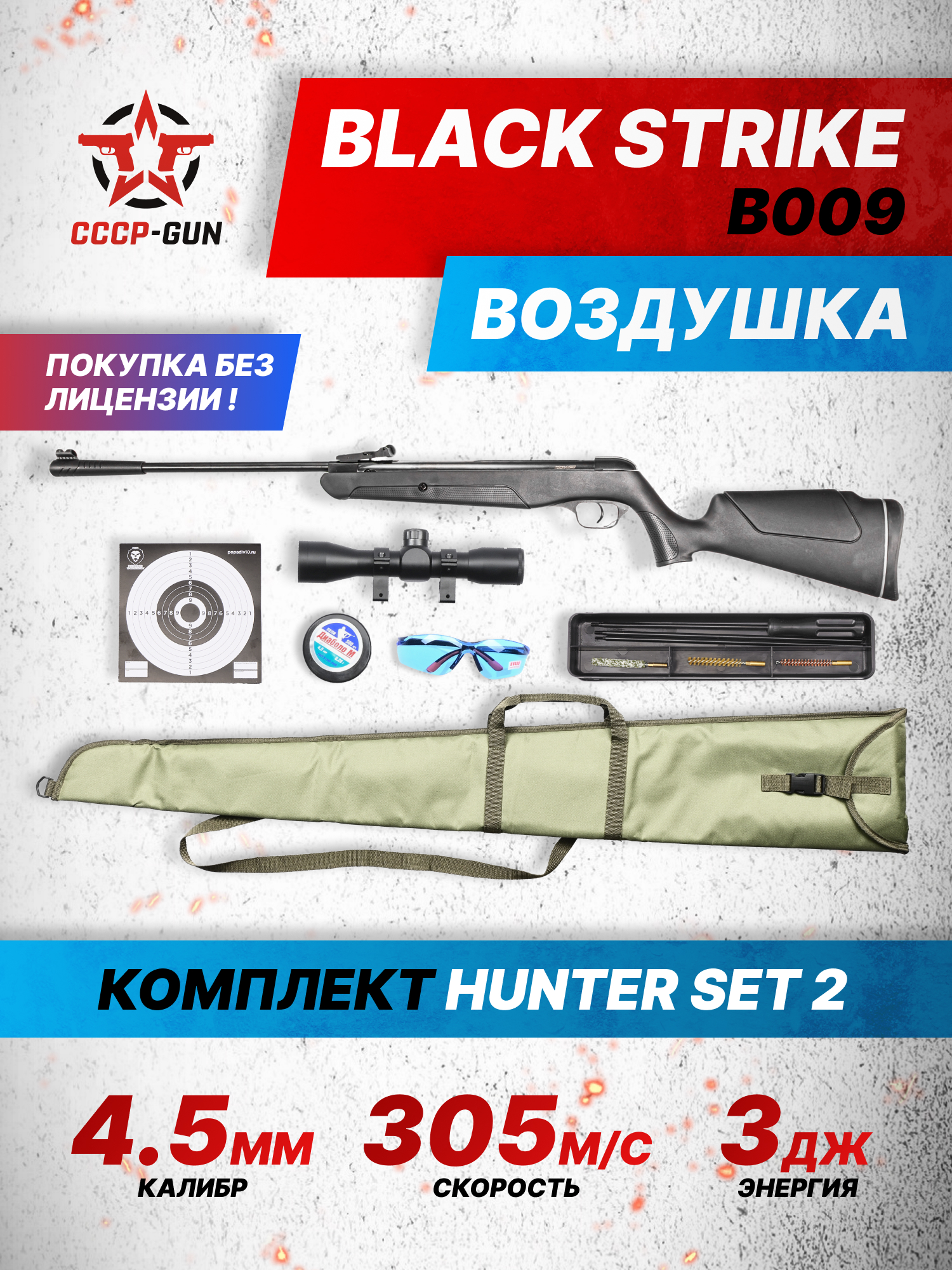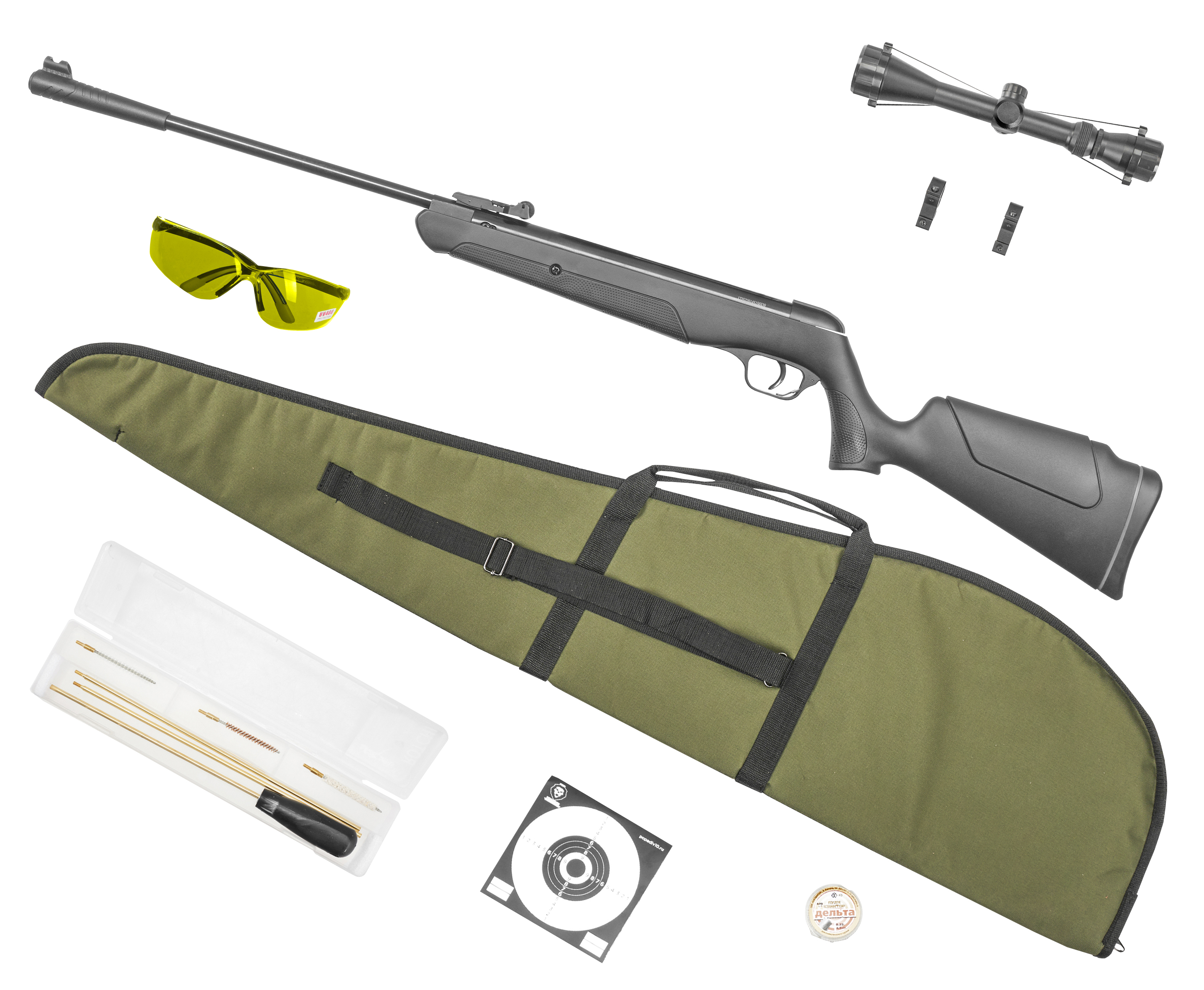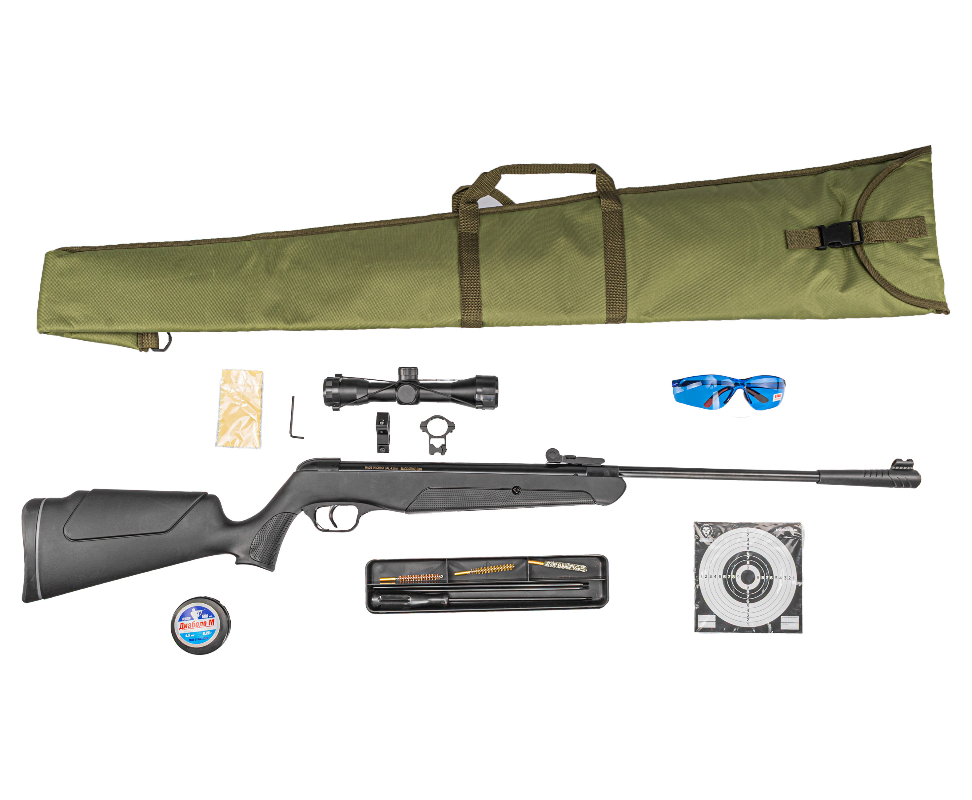 Набор номер два собрали на базе винтовки Black Strike модели B009 - помимо оружия в набор также попал оптический прицел с подходящими под планку «Ласточкин хвост» 11 мм креплениями. С его помощью начинающий пользователь сможет освоить стрельбу на расстояние после того, как научиться работать со штатным комплексом. Также здесь найдутся очки, которые сохранят органы зрения в нештатных ситуациях.