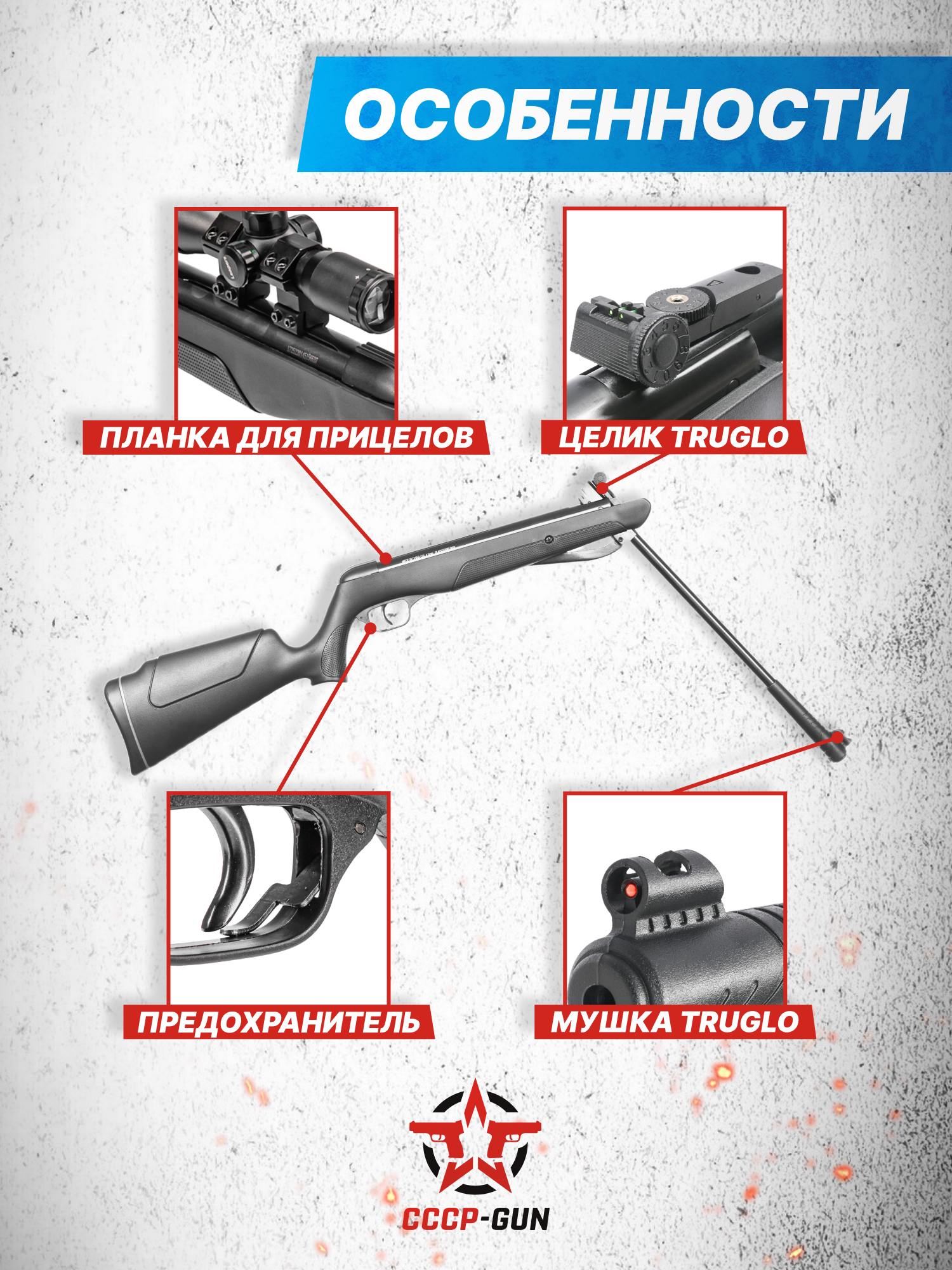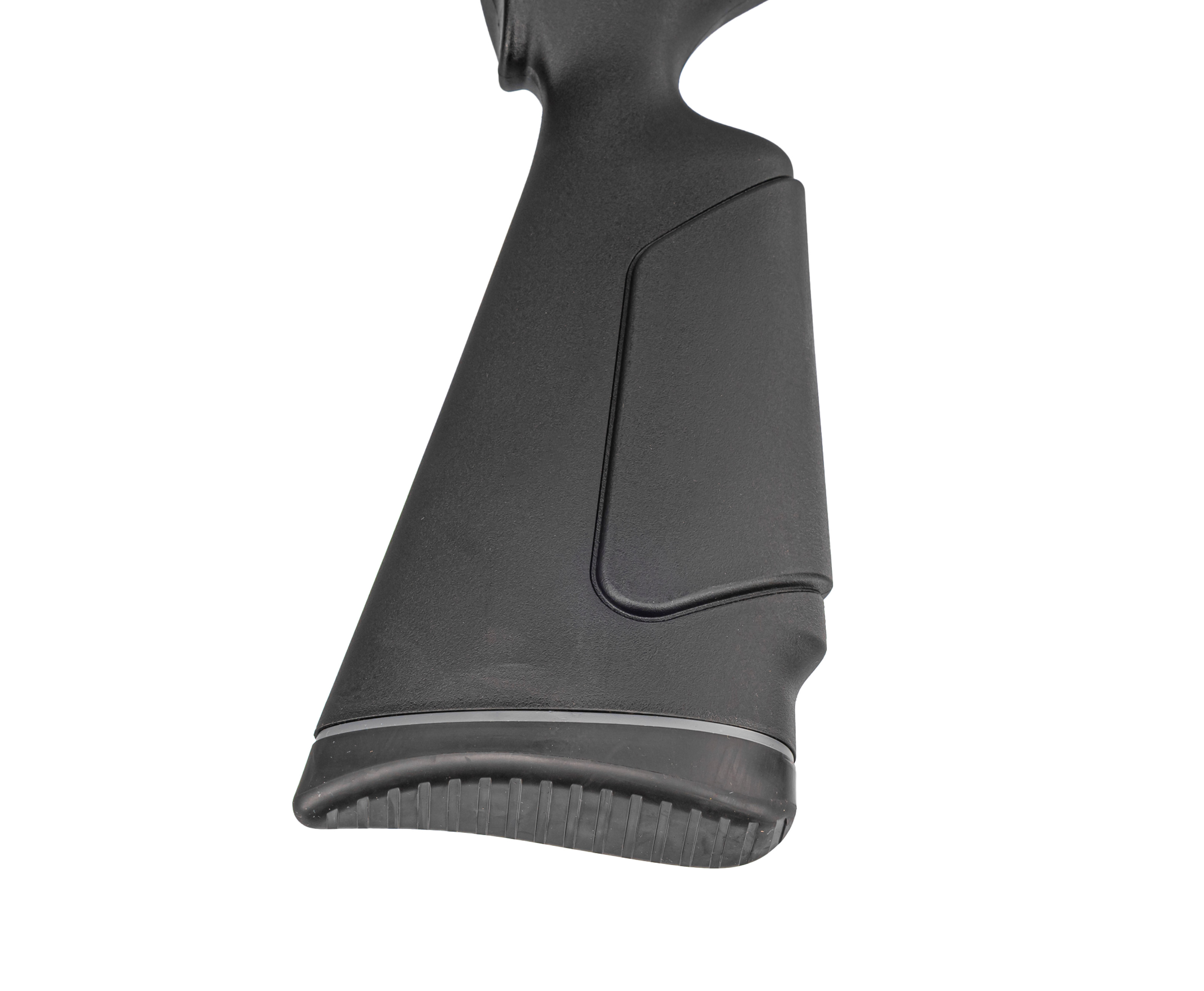На фурнитуре присутствует резиновая проставка, благодаря которой приклад не будет соскальзывать с плеча стрелка. В тех же целях на рукоятке с цевьем появилось текстурирование. В скобе разместили предохранитель, блокирующий спуск для невозможности выстрела.
