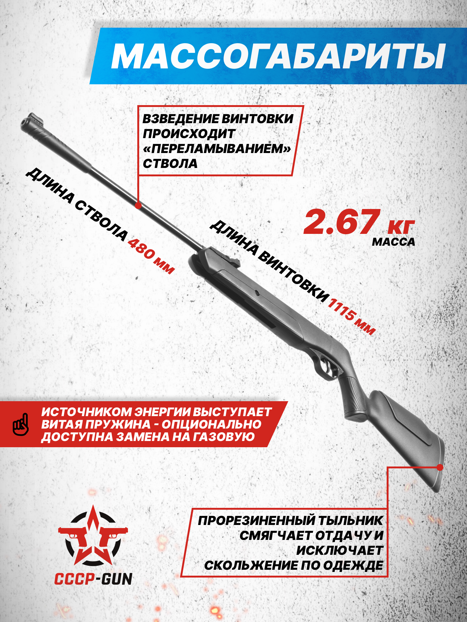 Внимание! Данная модель поставляется в разрешенной мощности для свободного приобретения на территории Российской Федерации. При этом в модели имеется возможность увеличения мощности путем замены части деталей или настройки конструкции, однако не стоит забывать о Федеральном законе «Об оружии» № 150 - ФЗ. В случае необходимости, опираясь на данный закон и руководствуясь им, возможно, потребуется получить разрешение от ЛЛР ГУ МВД России после вмешательства в конструкцию.
