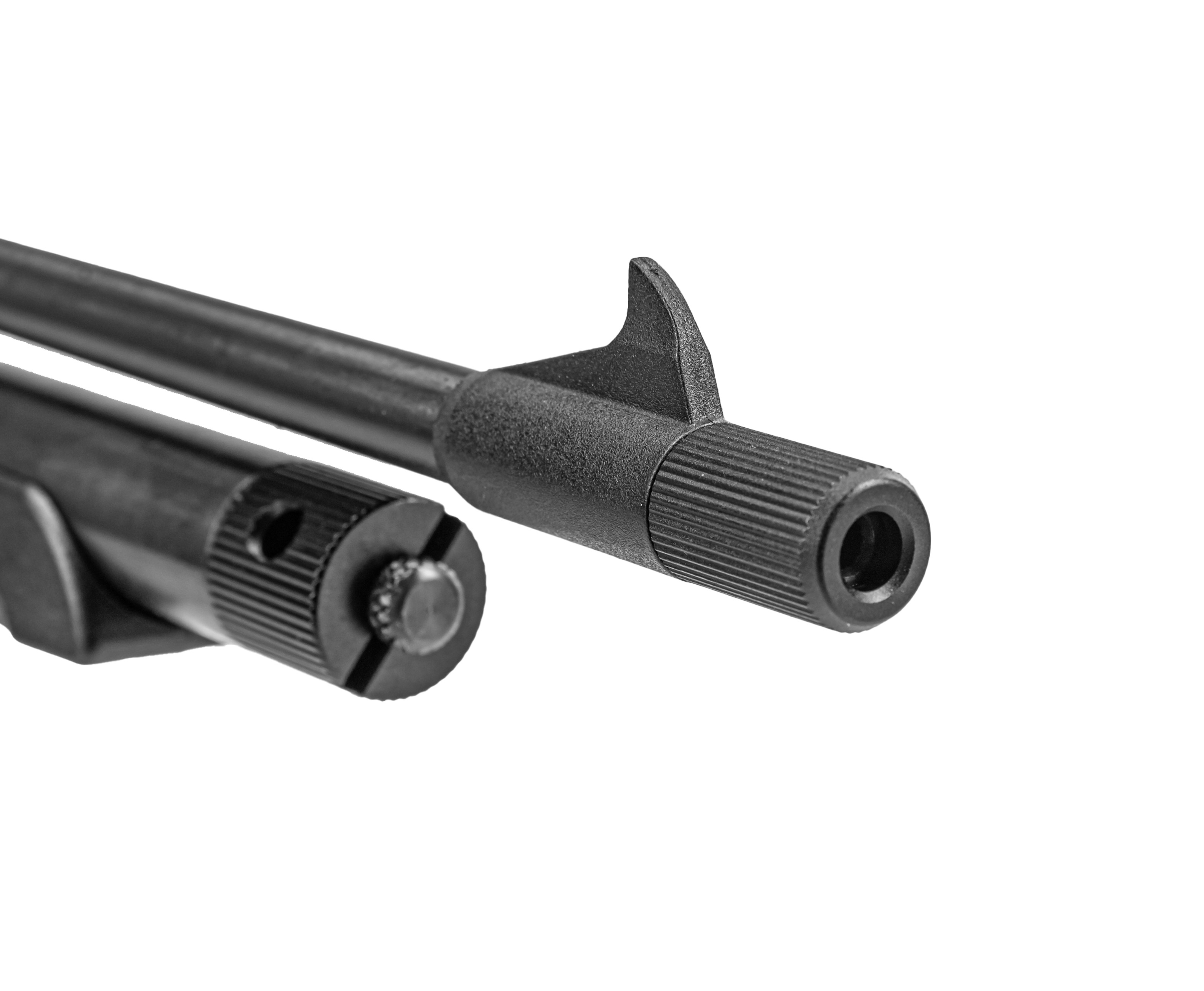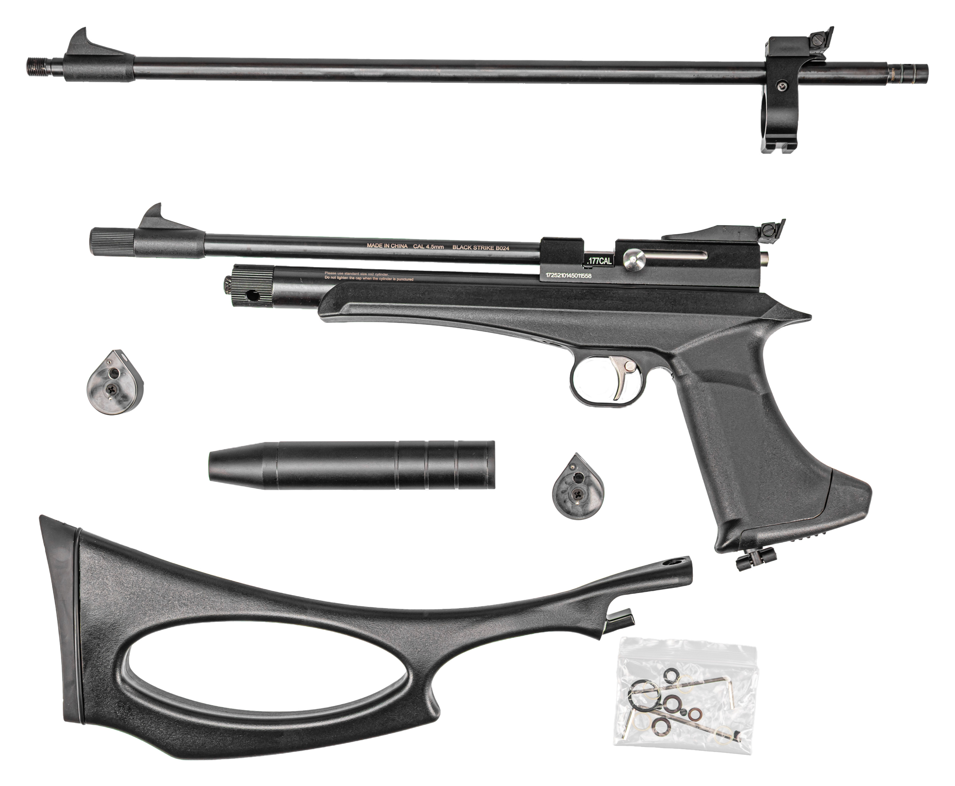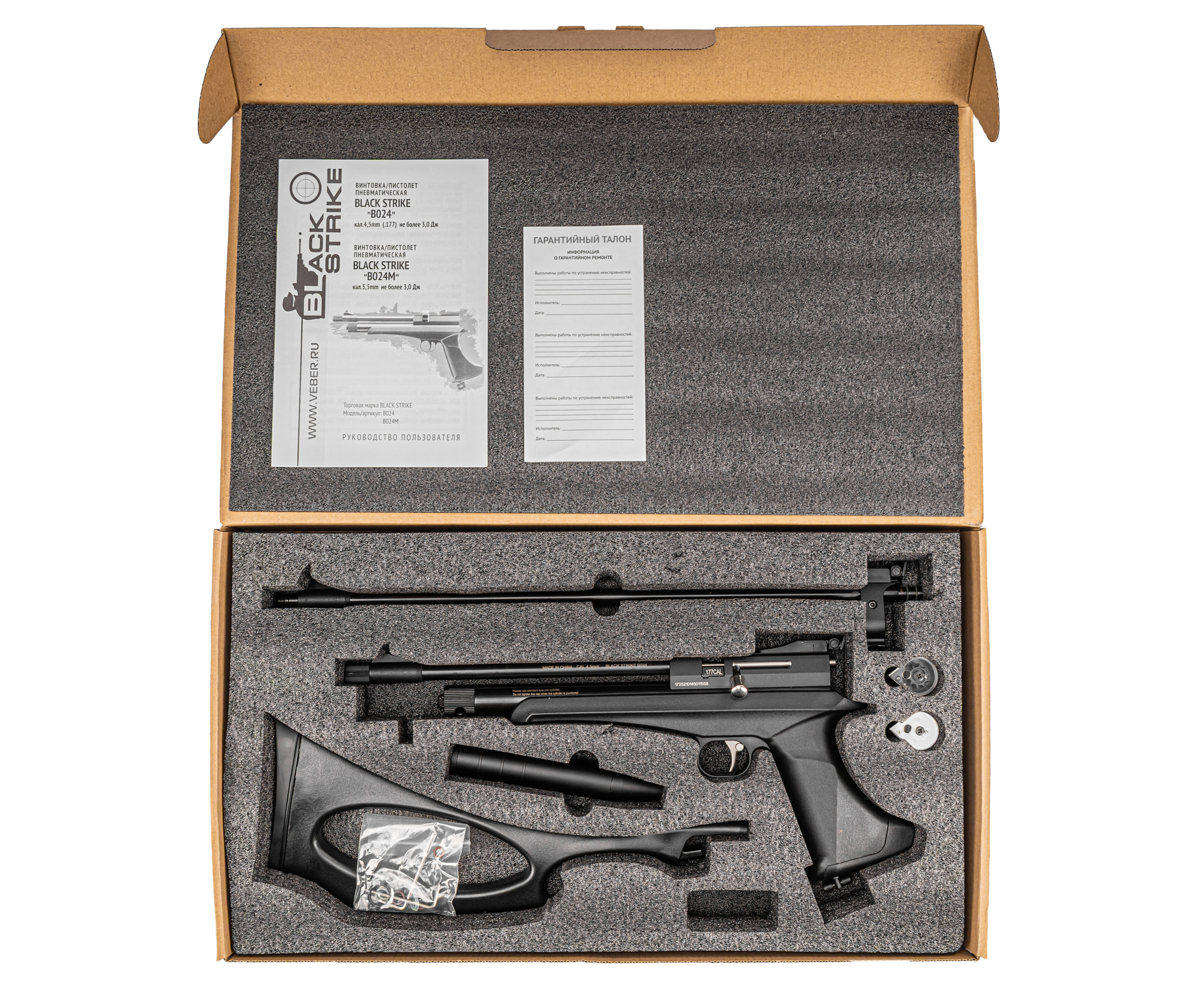 Пневматический пистолет Black Strike B024 в базовом виде предполагает оснащение компактным 208 мм стволом. Для конвертации короткоствольного образца в полноразмерную винтовку его меняют на 450 мм бланк - для этого достаточно поставить его на место штатного, не забыв закрепить кронштейн дополнительной опоры на резервуаре. Мушка присутствует на обоих стволах, соответственно переставлять ее не понадобится.