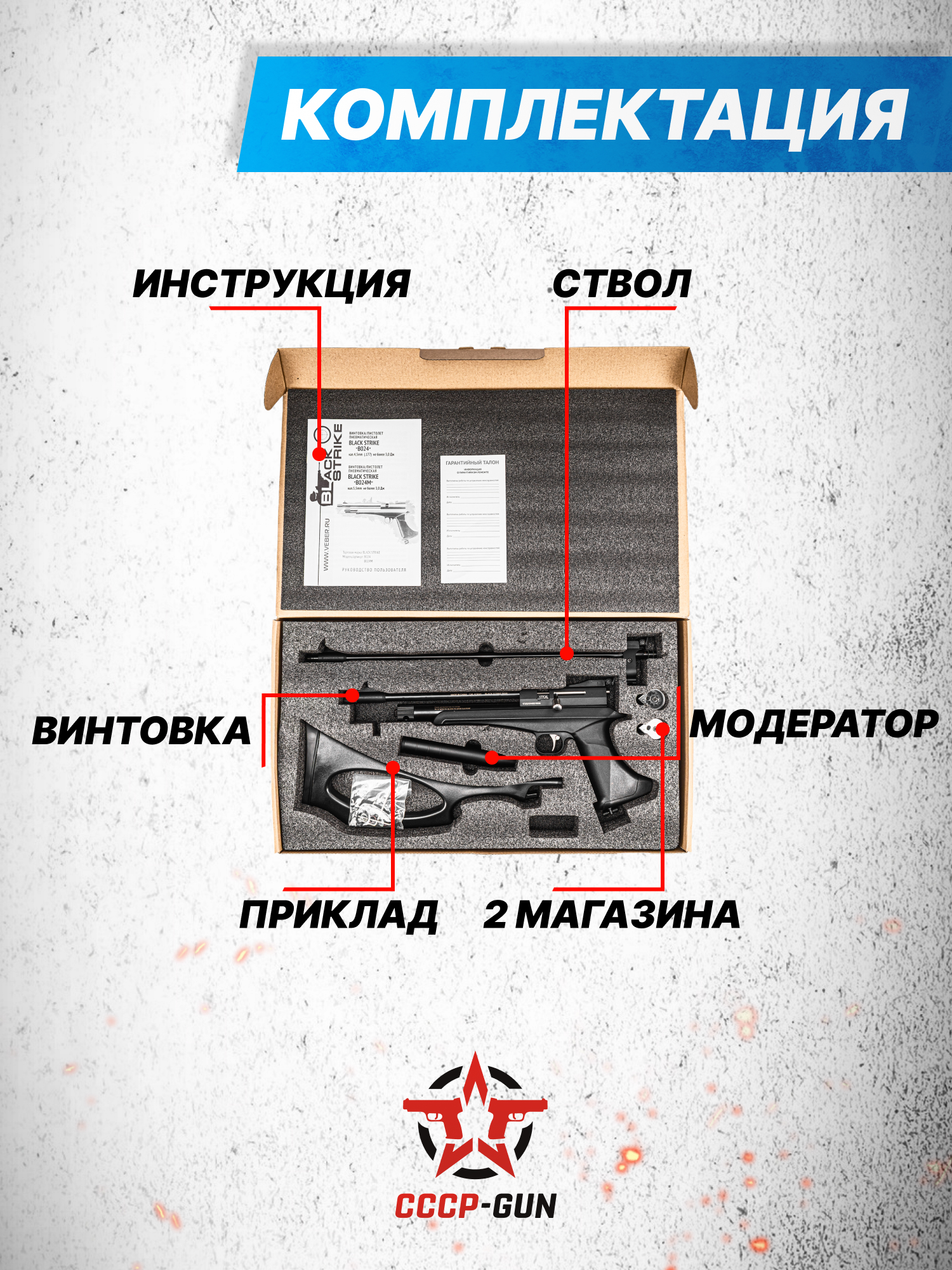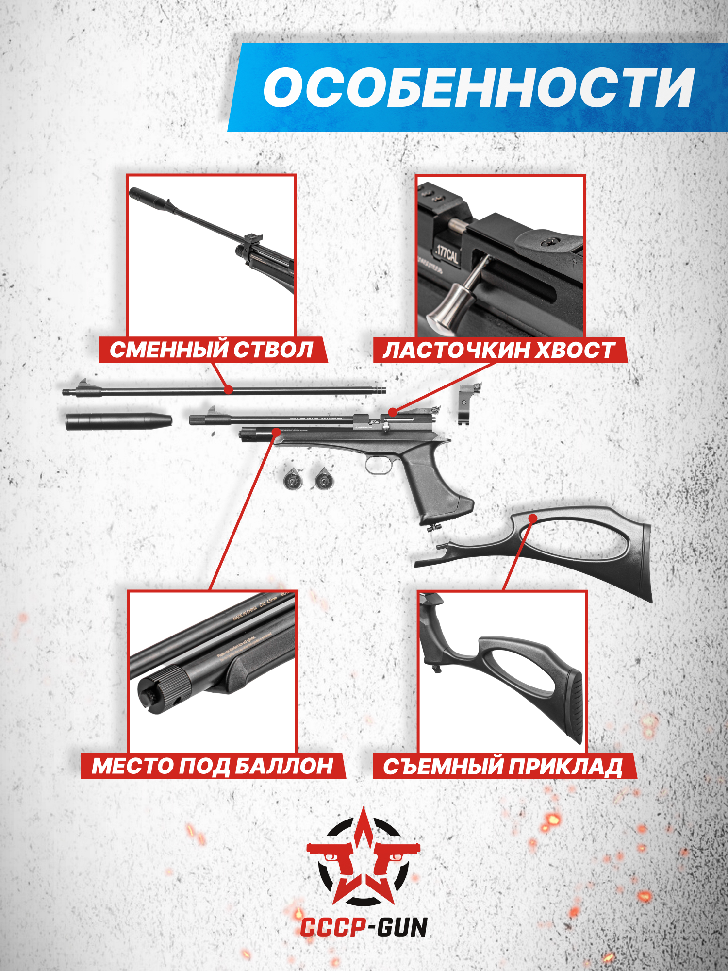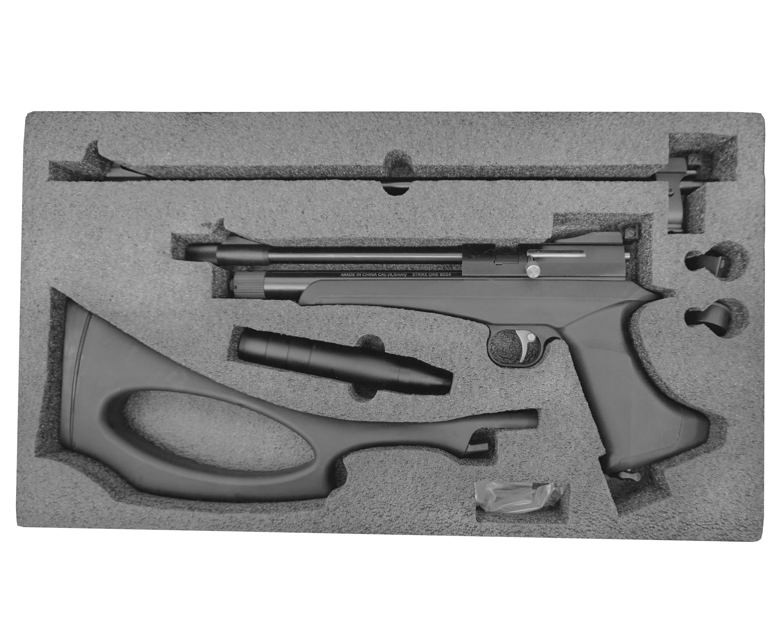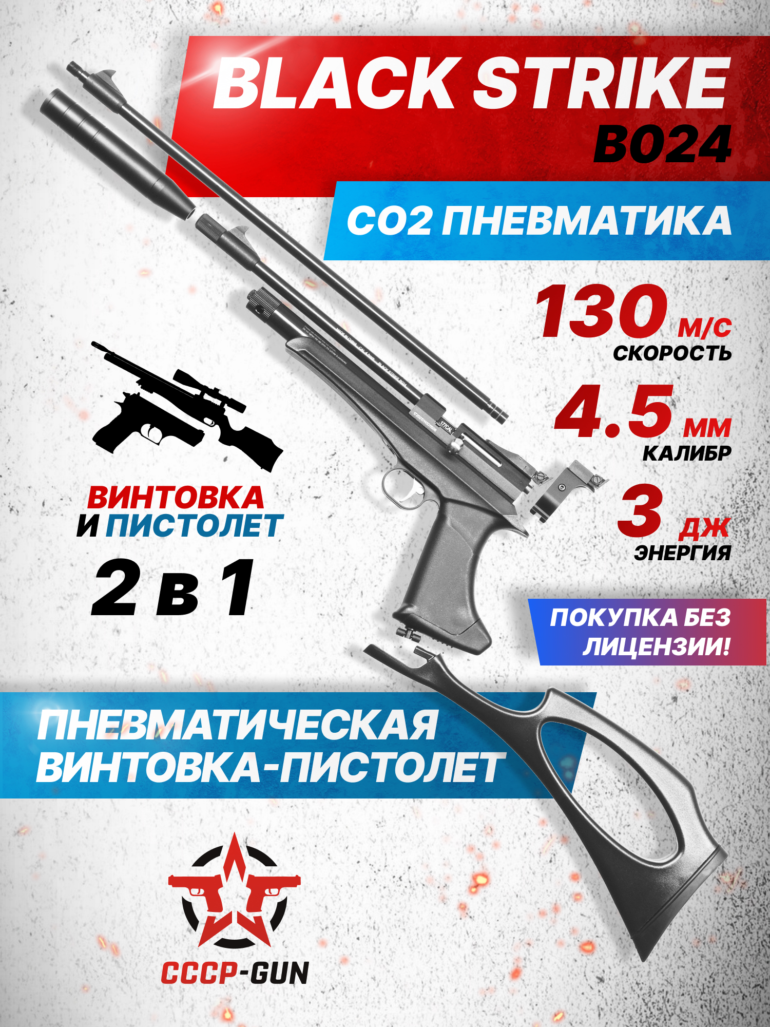 Для использования разных видов оружия необязательно иметь несколько единиц пневматики - компания Black Strike представила модель, сочетающую в себе сразу винтовочную и пистолетную компоновки. Благодаря этому пользователь получает два функционала, заплатив лишь за один. Помимо финансовой привлекательности такое решение удобно в эксплуатации - комплект предполагает возможность оперативной пересборки даже в полевых условиях.
