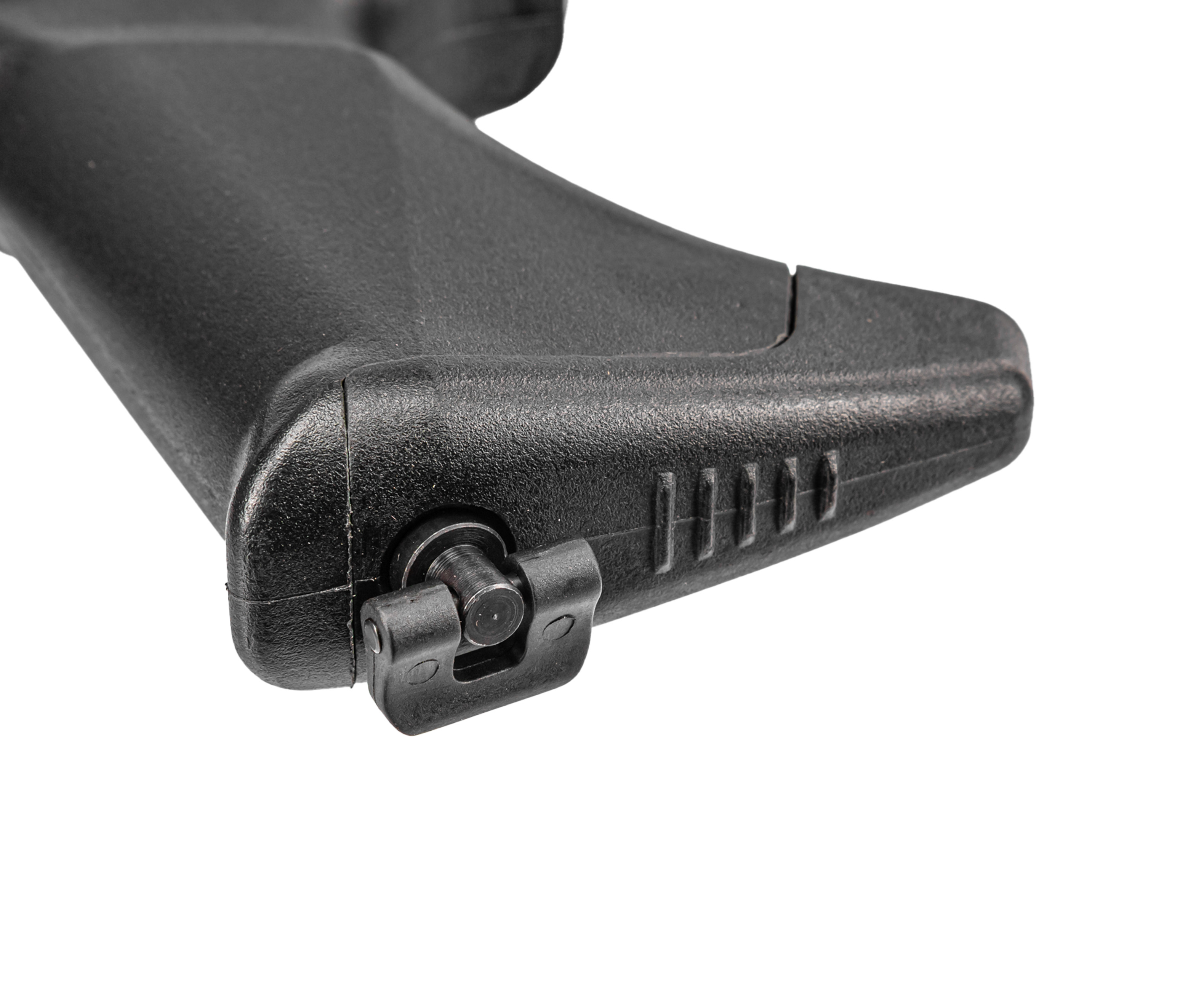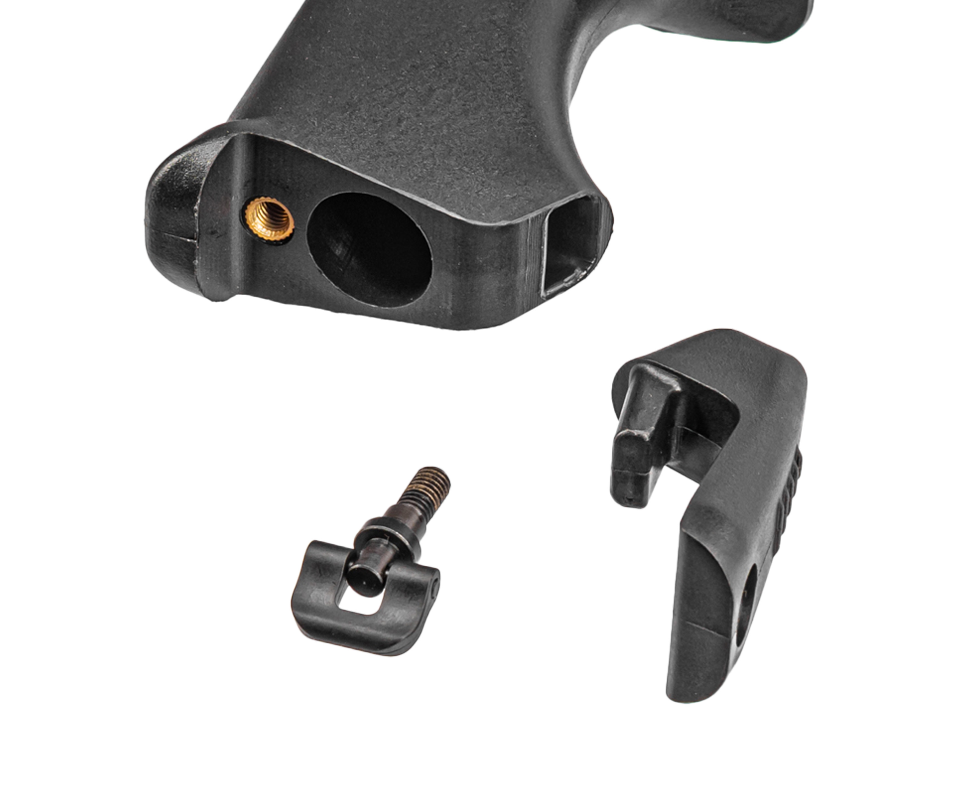 Также в комплекте есть приклад, присоединяемый к пистолетной рукоятке пневматики - вместе с ним винтовка в собранном виде будет иметь длину 858 миллиметров. Для установки потребуется выкрутить винт и изъять заглушку, после чего вставить приклад и вернуть крепеж на место. Высоту посадки опорной части выполнили таким образом, чтобы прицельная линия располагалась перед глазом стрелка.