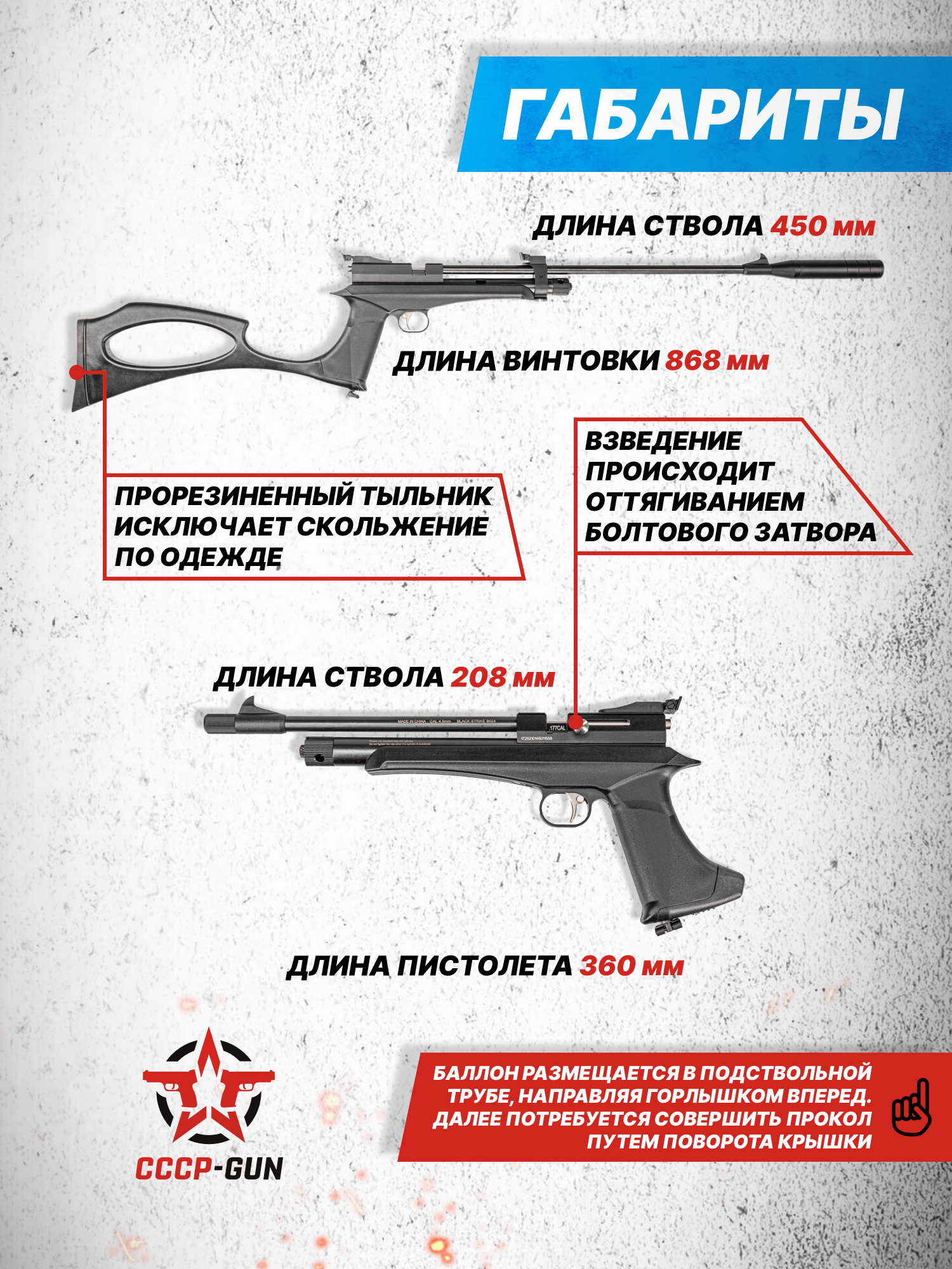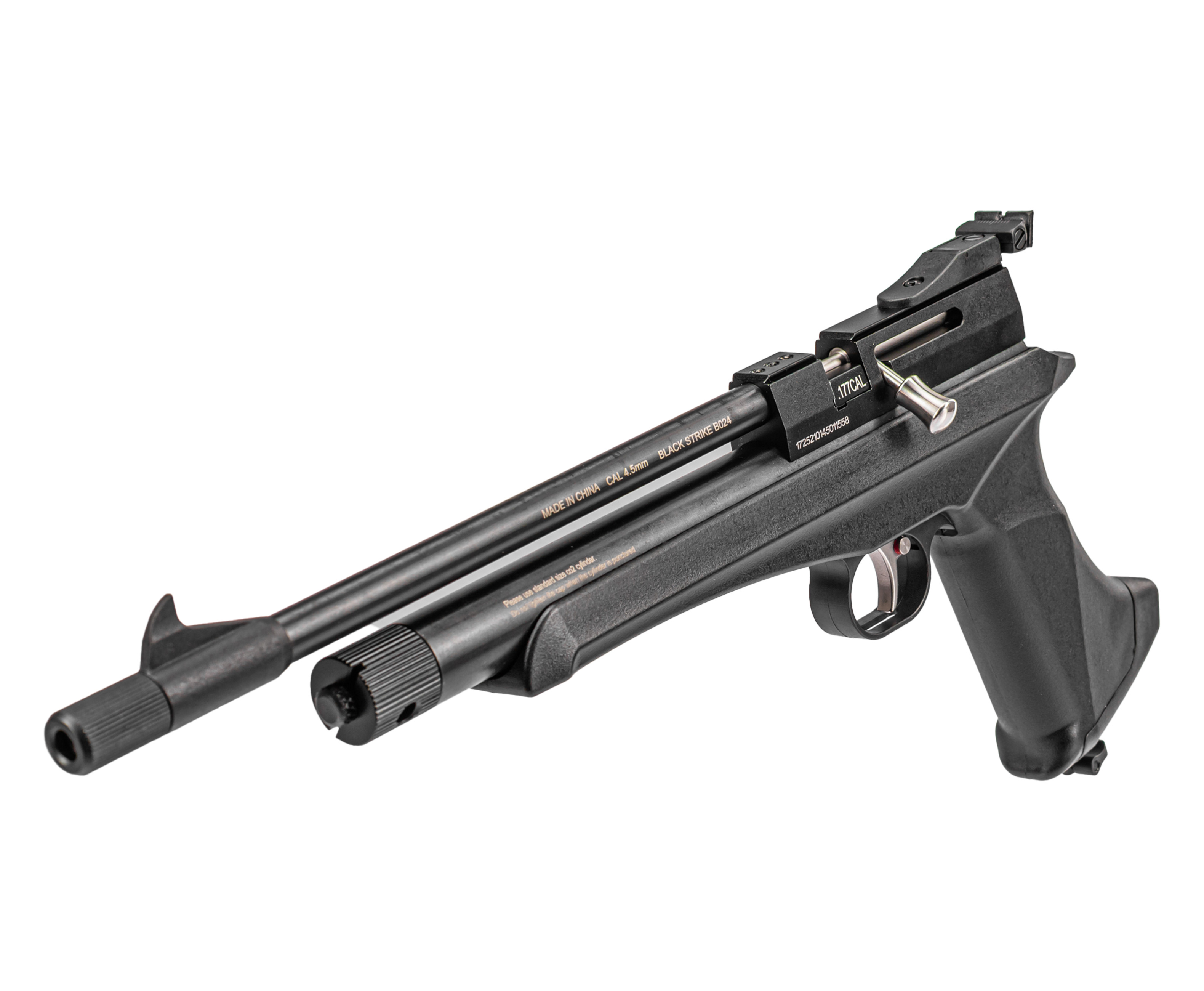 Модель Блэк Страйк относится к классу газобаллонного оружия 4.5 мм - для разгона пули здесь используется углекислый газ, содержащийся в баллончике стандарта 12 грамм. Емкость с СО2 размещают в подствольной трубе направляя горлышком вперед, после чего пробку возвращают на место. Далее потребуется совершить прокол путем ее поворота - для этого в детали присутствует отверстие, куда вставляется комплектный пин и применяется в качестве рычажка.