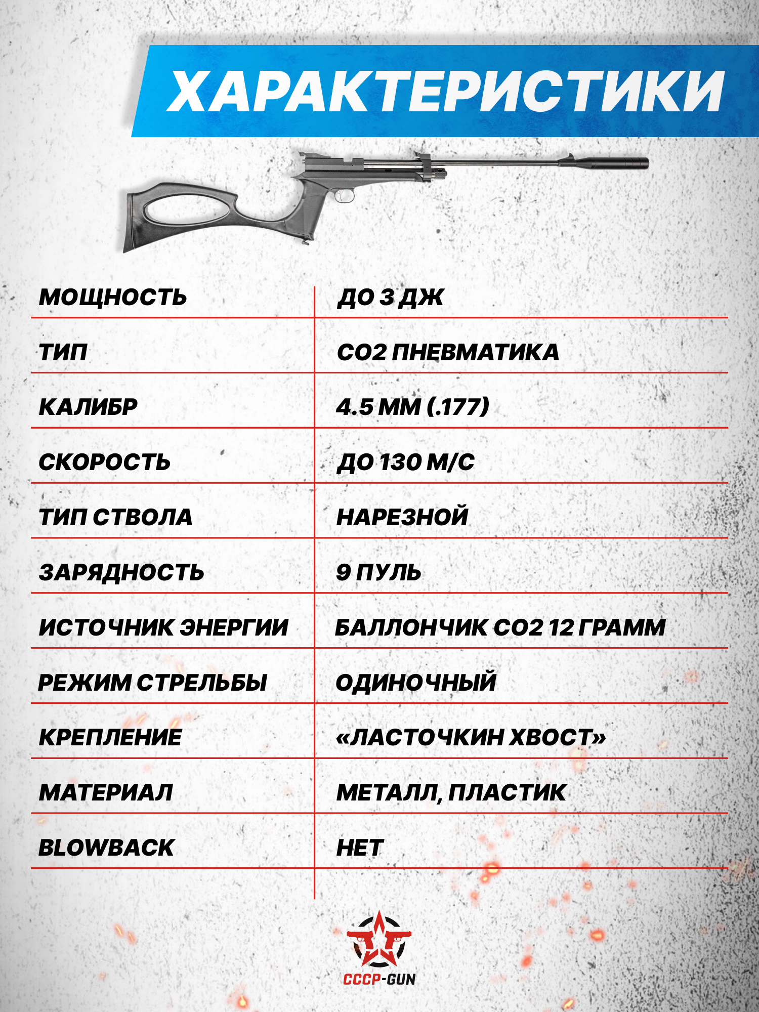 Скорость движения пули при выходе из ствола составляет 130 метров в секунду, благодаря чему изделие подойдет не только для развлекательной стрельбы, но и для любительских соревнований. Несмотря на высокую, по меркам газобаллонной пневматики, скорость винтовка остается законной - энергия пули менее 3J. Следовательно, владение образцом ограничено только возрастом стрелка - разрешения не понадобятся.