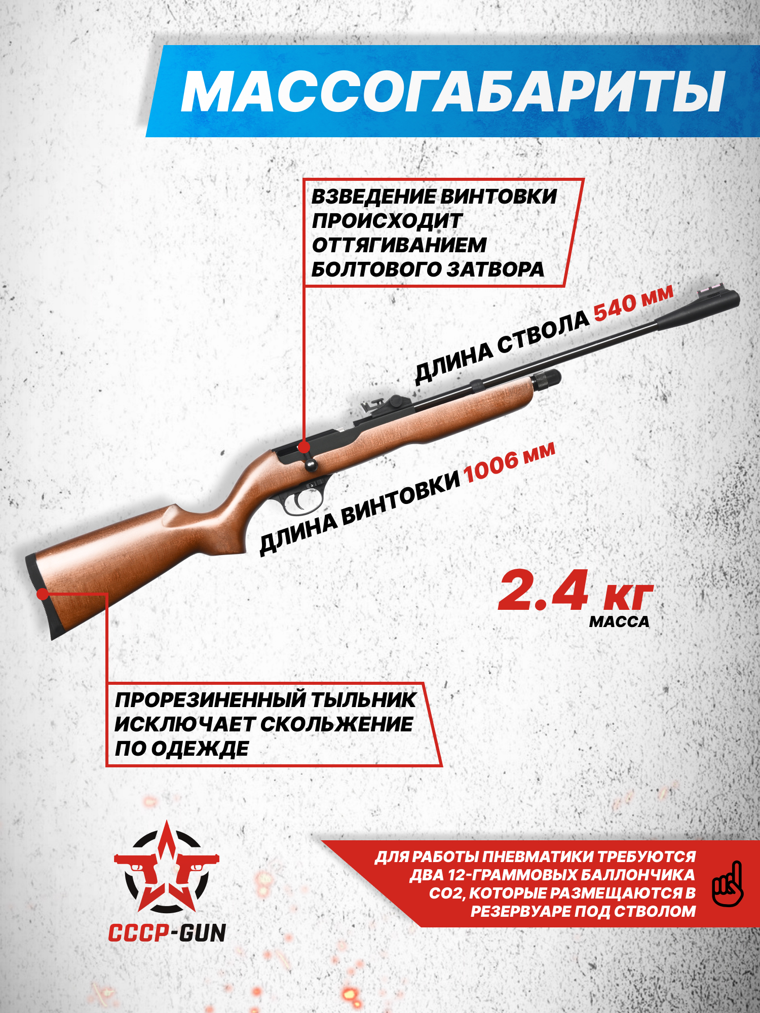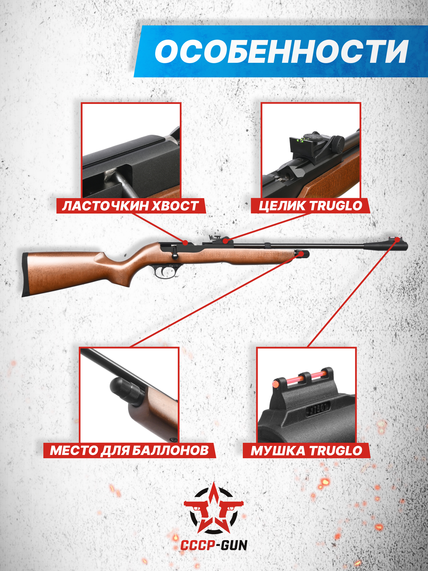 В устройстве оружия также присутствует механический предохранительный механизм - он располагается в нижней части спусковой скобы, благодаря чему управление им удобно выполняется указательным пальцем. Винтовка изготовлена под свинцовый боеприпас калибра 4.5 мм, причем заряжание производится вручную - пулю типа «диаболо» нужно самостоятельно помещать в казенник при взведении.
