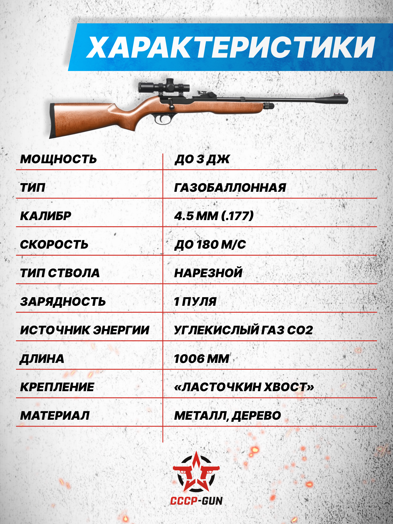 После завершения подготовительных манипуляций обозреваемая газобаллонная винтовка способна разогнать заряд при выстреле до скорости, примерно равной 180 м в сек. Модель соответствует законодательно установленному лимиту дульной энергии в три Джоуля, следовательно, приобретается без необходимости оформления разрешительных документов. Единственным требованием выступает достижение покупателем совершеннолетия.