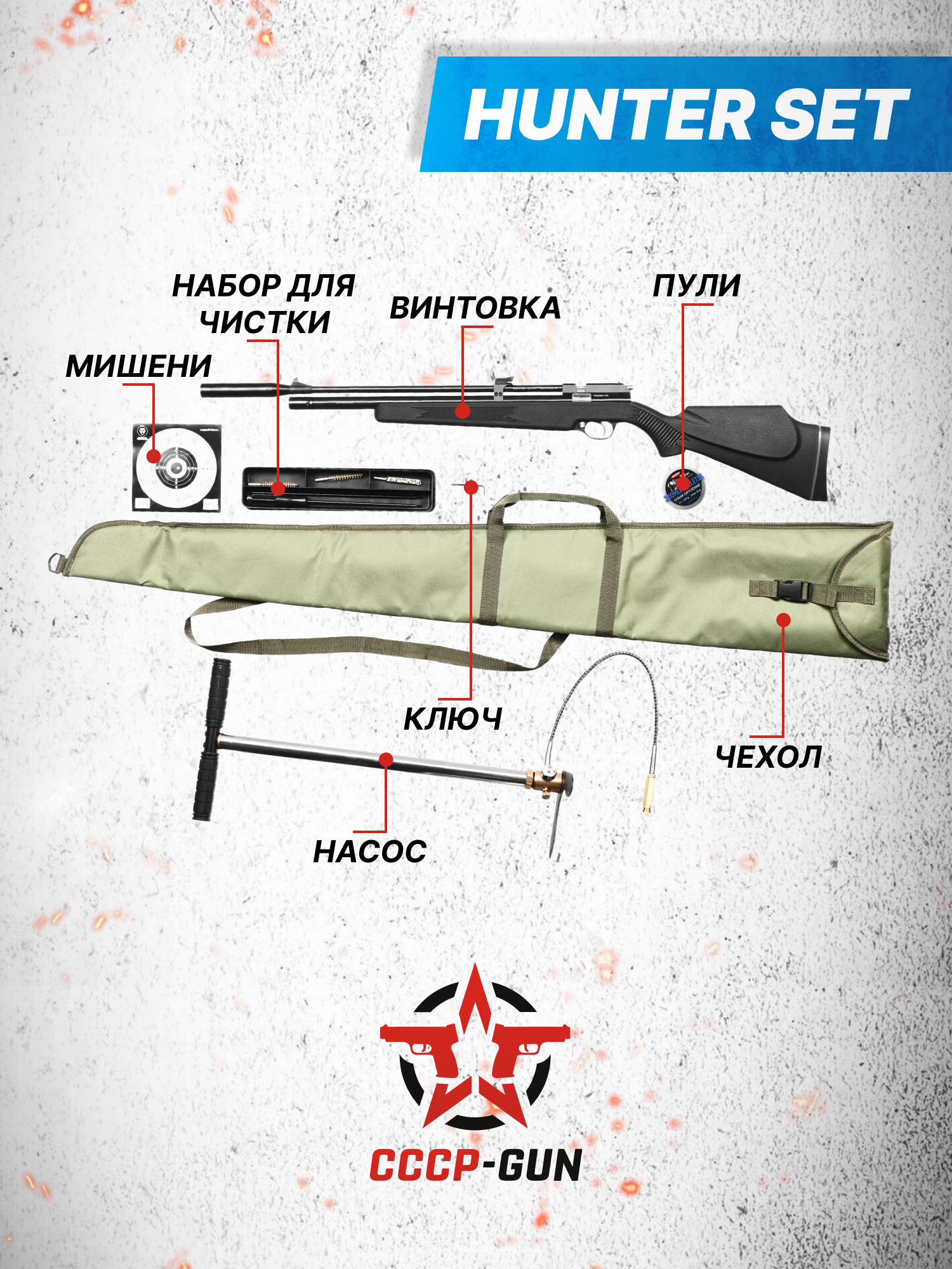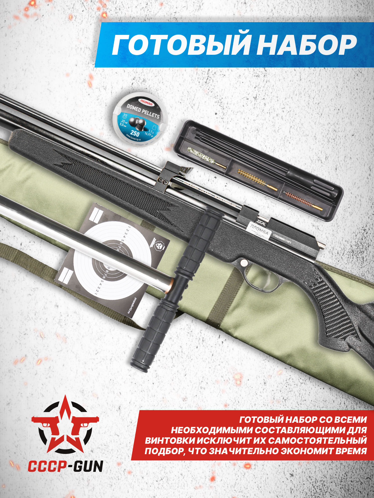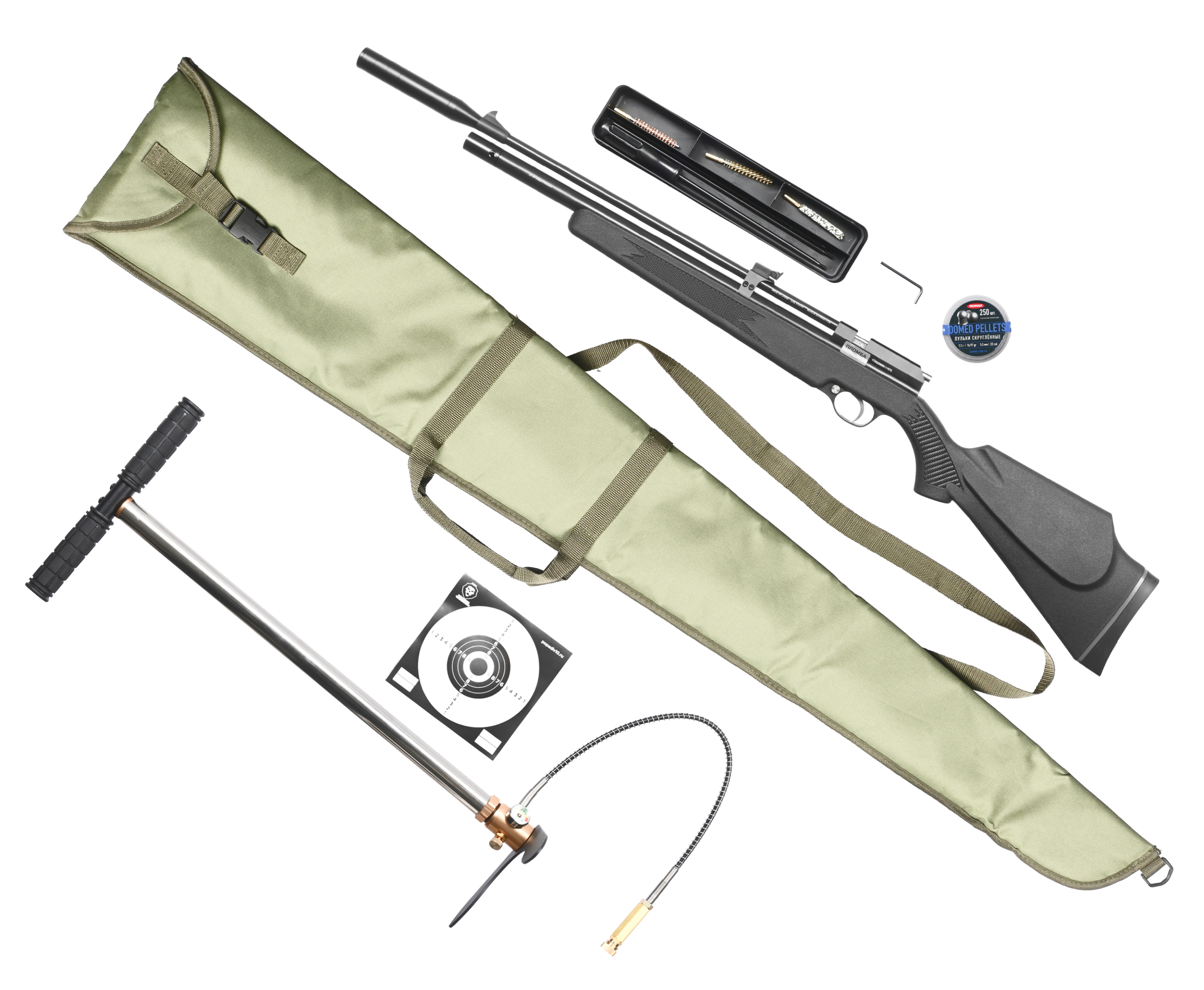 Кроме механического прицела здесь можно воспользоваться оптикой, устанавливаемой с помощью «Ласточкиного хвоста». Помимо насоса для заправки в комплект доложили инструмент для чистки вместе с пульками и набором мишеней, отпечатанных на бумажных квадратных листах. Также в комплектацию вошел ЗИП вкупе с саундмодератором.