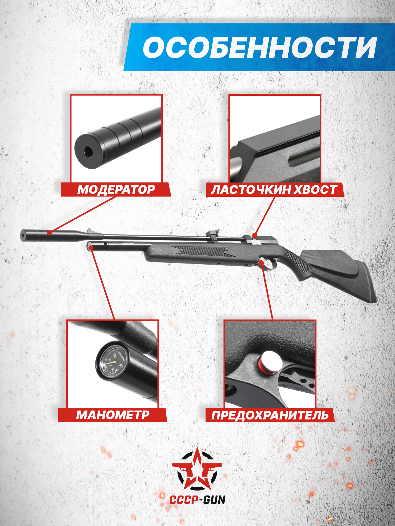 Внимание! Данная модель поставляется в разрешенной мощности для свободного приобретения на территории Российской Федерации. При этом в модели имеется возможность увеличения мощности путем замены части деталей или настройки конструкции, однако не стоит забывать о Федеральном законе «Об оружии» № 150 - ФЗ. В случае необходимости, опираясь на данный закон и руководствуясь им, возможно, потребуется получить разрешение от ЛЛР ГУ МВД России после вмешательства в конструкцию.