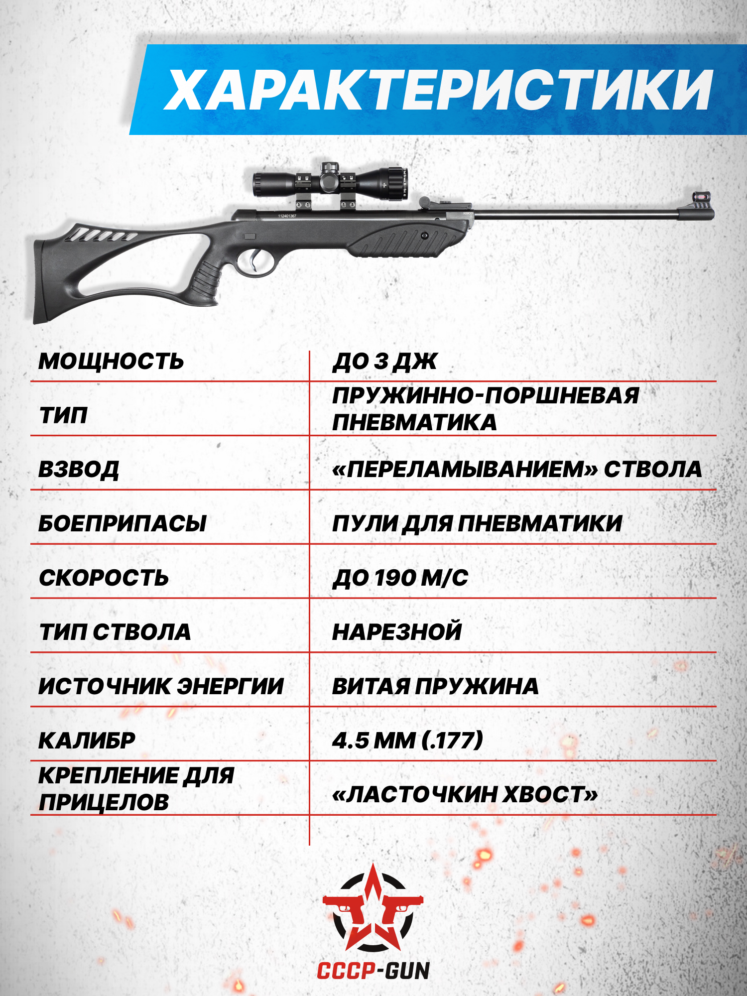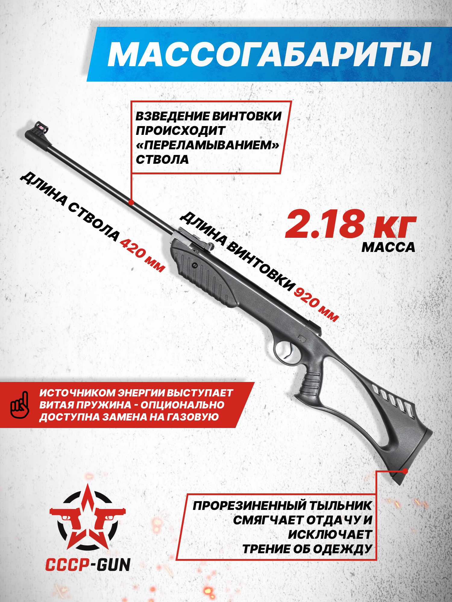 Внимание! Данная модель поставляется в разрешенной мощности для свободного приобретения на территории Российской Федерации. При этом в модели имеется возможность увеличения мощности путем замены части деталей или настройки конструкции, однако не стоит забывать о Федеральном законе «Об оружии» № 150 - ФЗ. В случае необходимости, опираясь на данный закон и руководствуясь им, возможно, потребуется получить разрешение от ЛЛР ГУ МВД России после вмешательства в конструкцию.