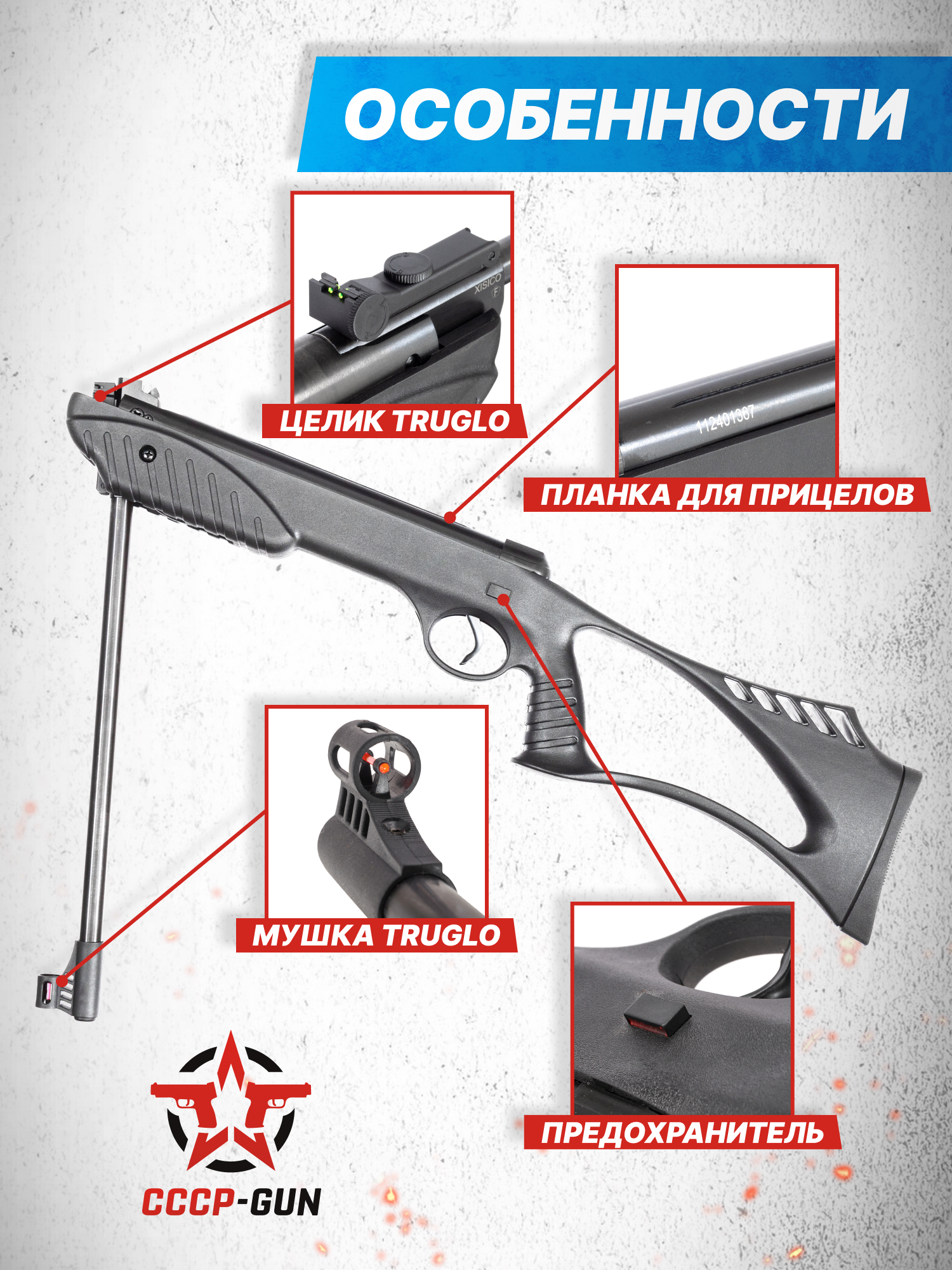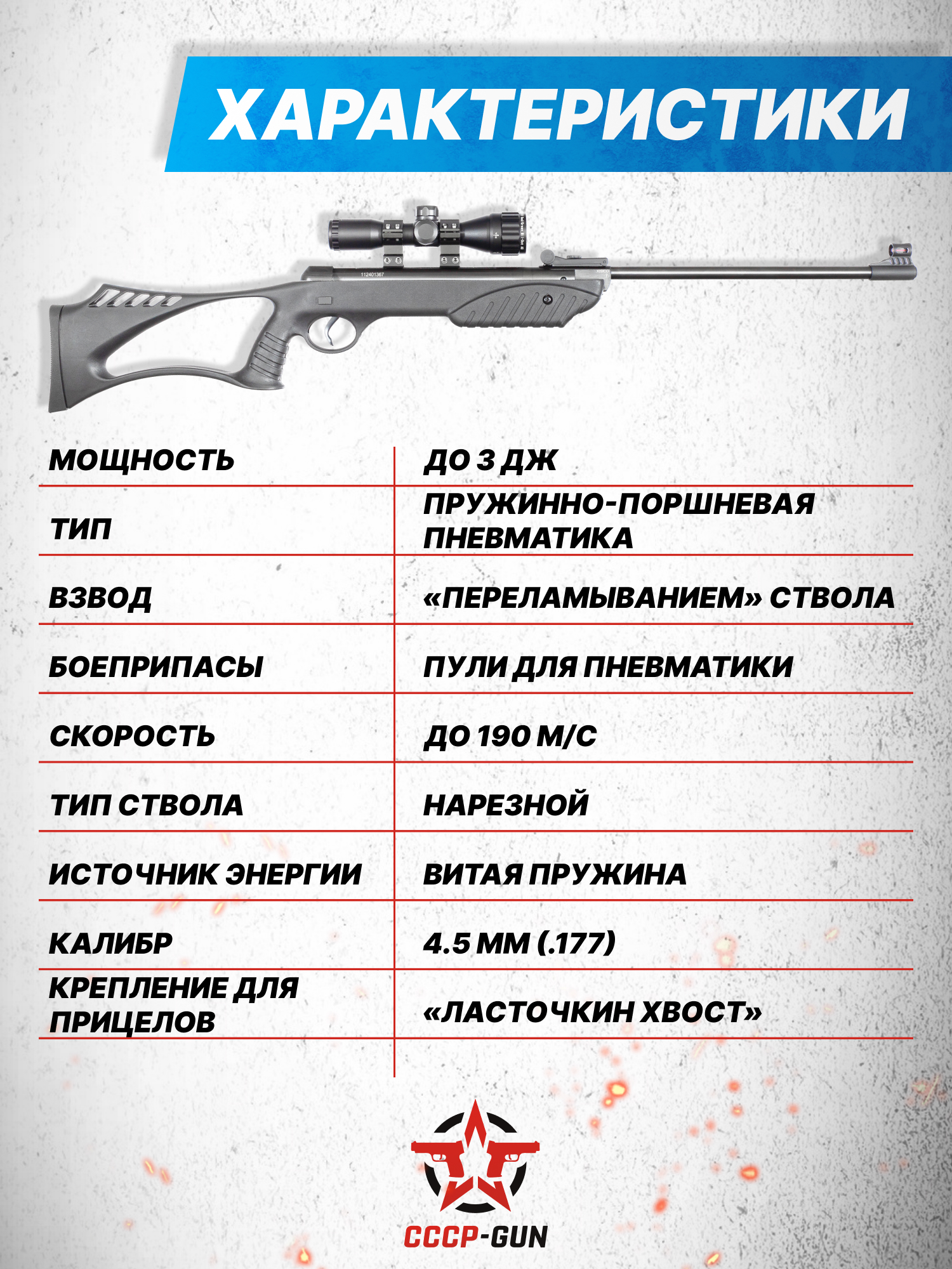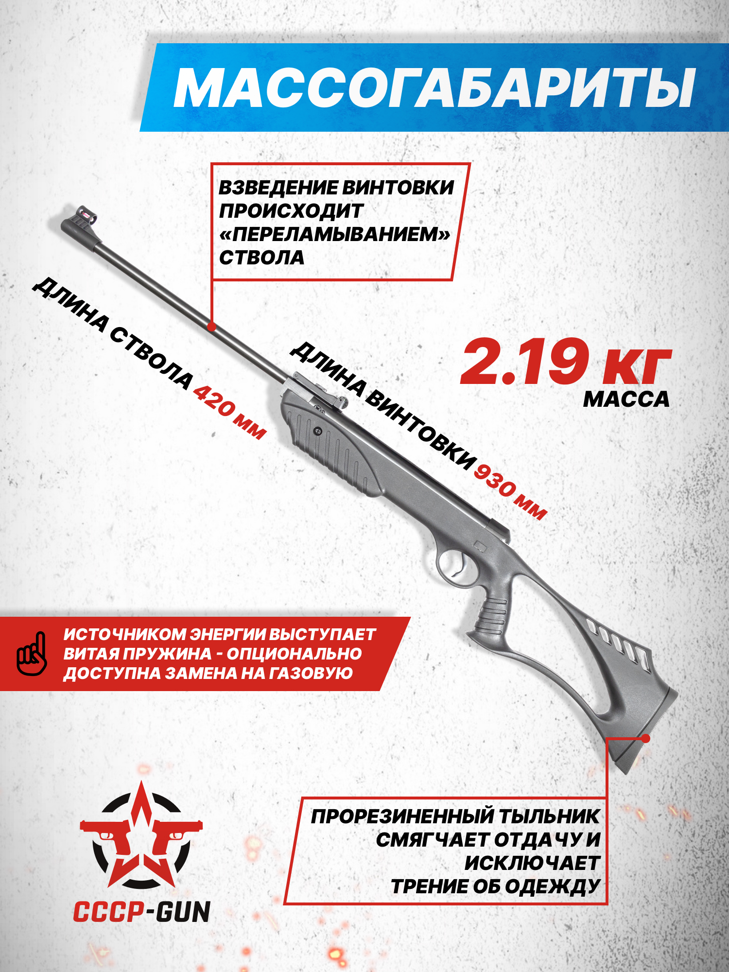Сама винтовка изготовлена в калибре 4.5 миллиметра и представляет собой однозарядное оружие. Досылание метательного снаряда проводится вручную при каждом взведении - для выполнения этой манипуляции потребуется обхватить второй рукой область ближе к дульному срезу ствола и приложить усилие по направлению вниз.