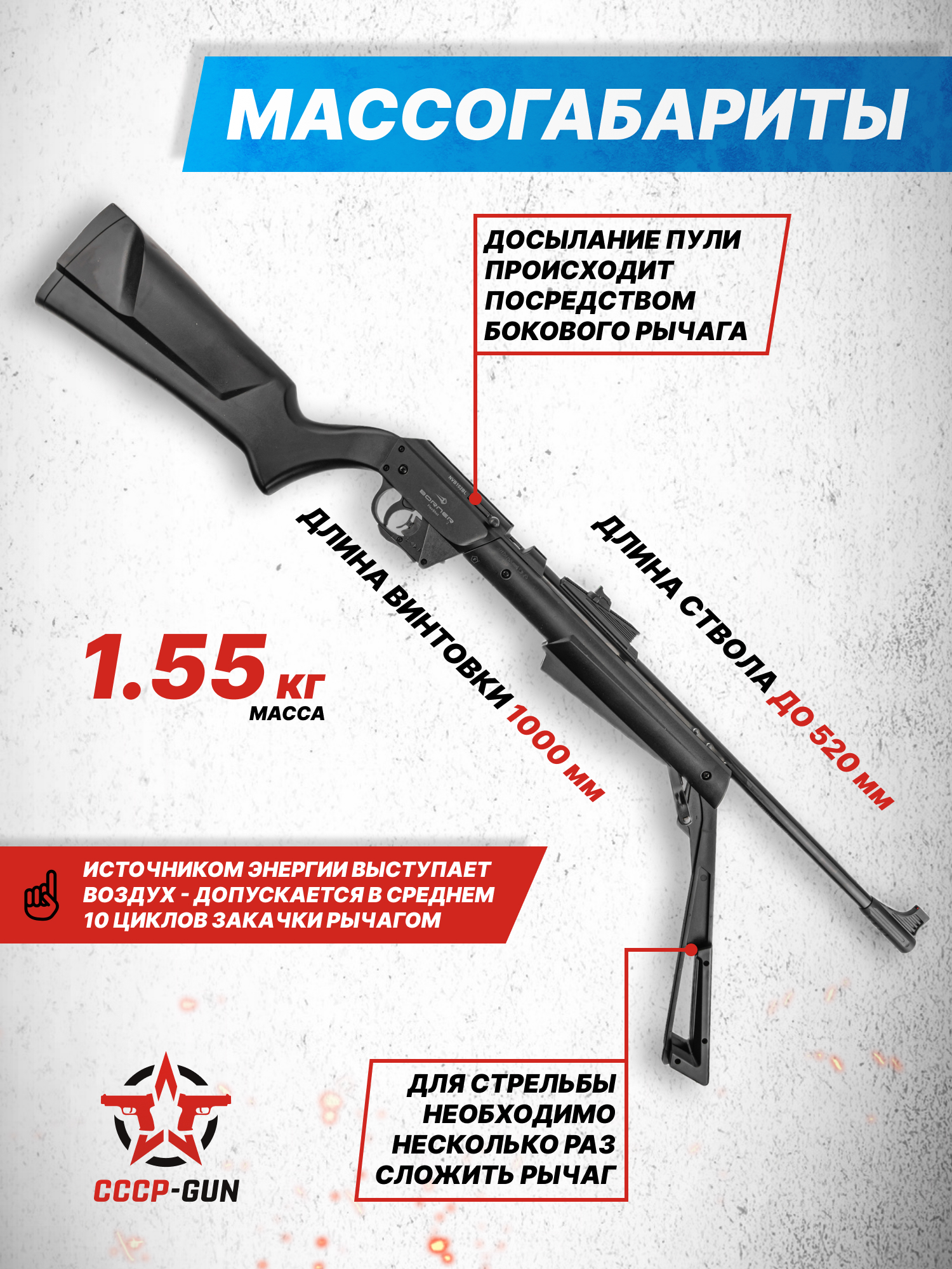 Методика многократной накачки подразумевает совершение нескольких возвратно-поступательных движений через рычажной механизм - необходимое количество таких манипуляций, согласно инструкции от разработчика, варьируется от 3 до 10 циклов сжатия. Соответственно, стрелок способен быстро создать необходимый объем сжатого воздуха, регулируя тем самым мощность производимого выстрела