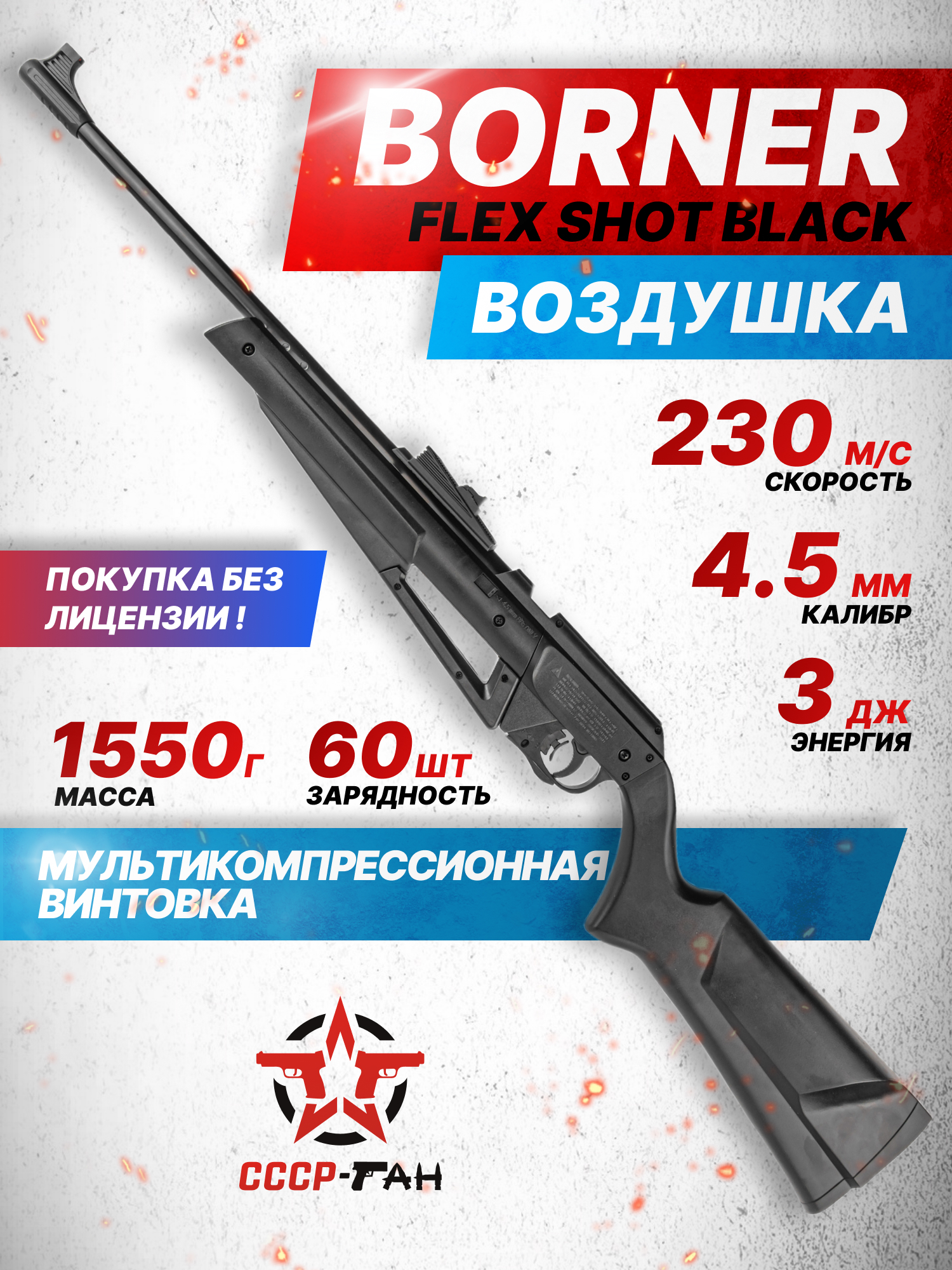 Показатель начальной скорости пули при выстреле может достигать в среднем 230 м в сек - при этом следует отметить, что винтовка Borner Flex Shot поставляется с дульной энергией, не превышающей 3 Дж. Исходя из этого факта, для покупки описываемого экземпляра не нужно оформлять специальное разрешение - приобрести подобную модификацию свободно могут граждане, достигшие совершеннолетия.