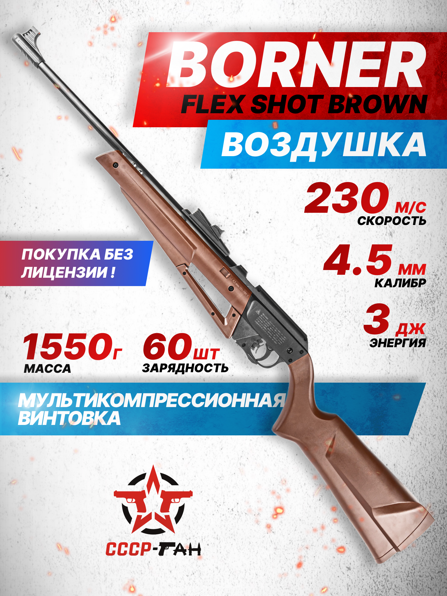 Пневматическая винтовка калибр 4.5 мм Borner выполняется в нескольких расцветках - в обозреваемом случае использовали цвет Brown. Коричневая фурнитура придала модели более классический вид, вместе с чем несколько улучшила маскировочные свойства. Цевье с прикладом изготавливают методом литья полимера - пластиковые детали помогли облегчить вес до 1.55 килограмма, что делает винтовку удобной для все возрастов стрелков.
