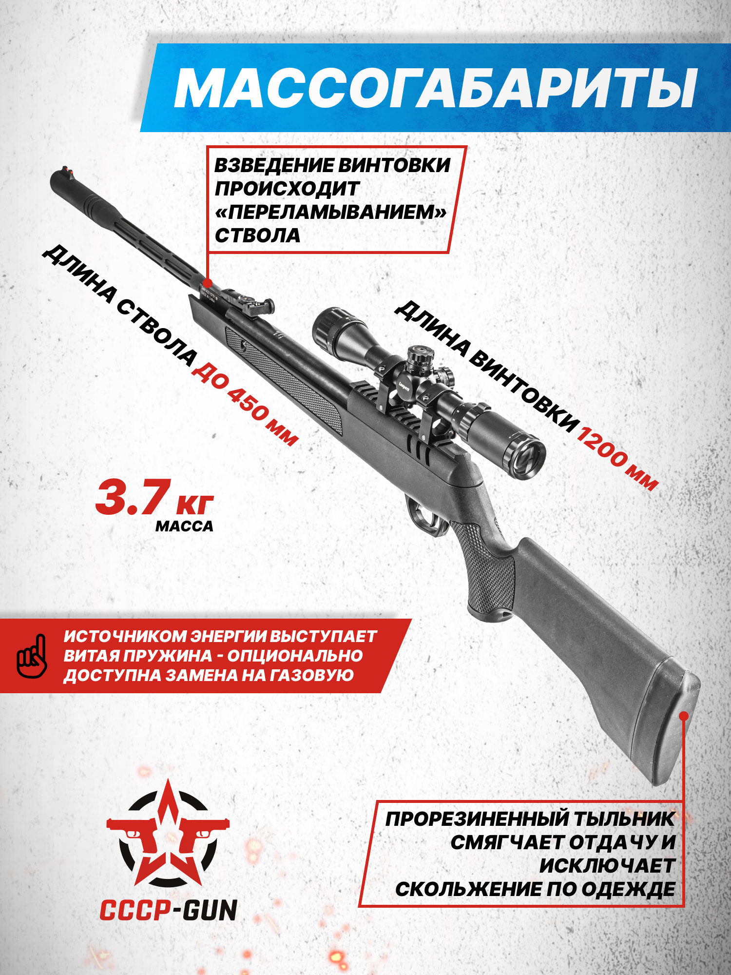 Изготовитель остановился на классическом, для пружинной пневматики, калибре - 4.5 мм. Оружие работает по схеме заряжания после каждого выстрела - перед стрельбой нужно провернуть муфту ствола вниз до постановки поршня на взвод и вложить заряд в казенную часть. Процедуру потребуется повторить после выстрела.