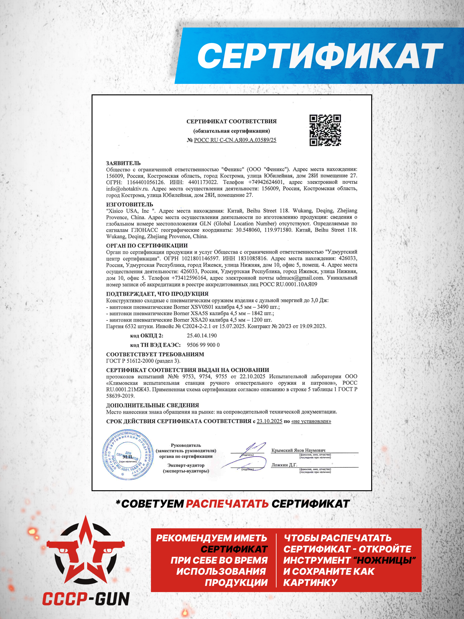 Внимание! Данная модель поставляется в разрешенной мощности для свободного приобретения на территории Российской Федерации. При этом в модели имеется возможность увеличения мощности путем замены части деталей или настройки конструкции, однако не стоит забывать о Федеральном законе «Об оружии» № 150 - ФЗ. В случае необходимости, опираясь на данный закон и руководствуясь им, возможно, потребуется получить разрешение от ЛЛР ГУ МВД России после вмешательства в конструкцию.