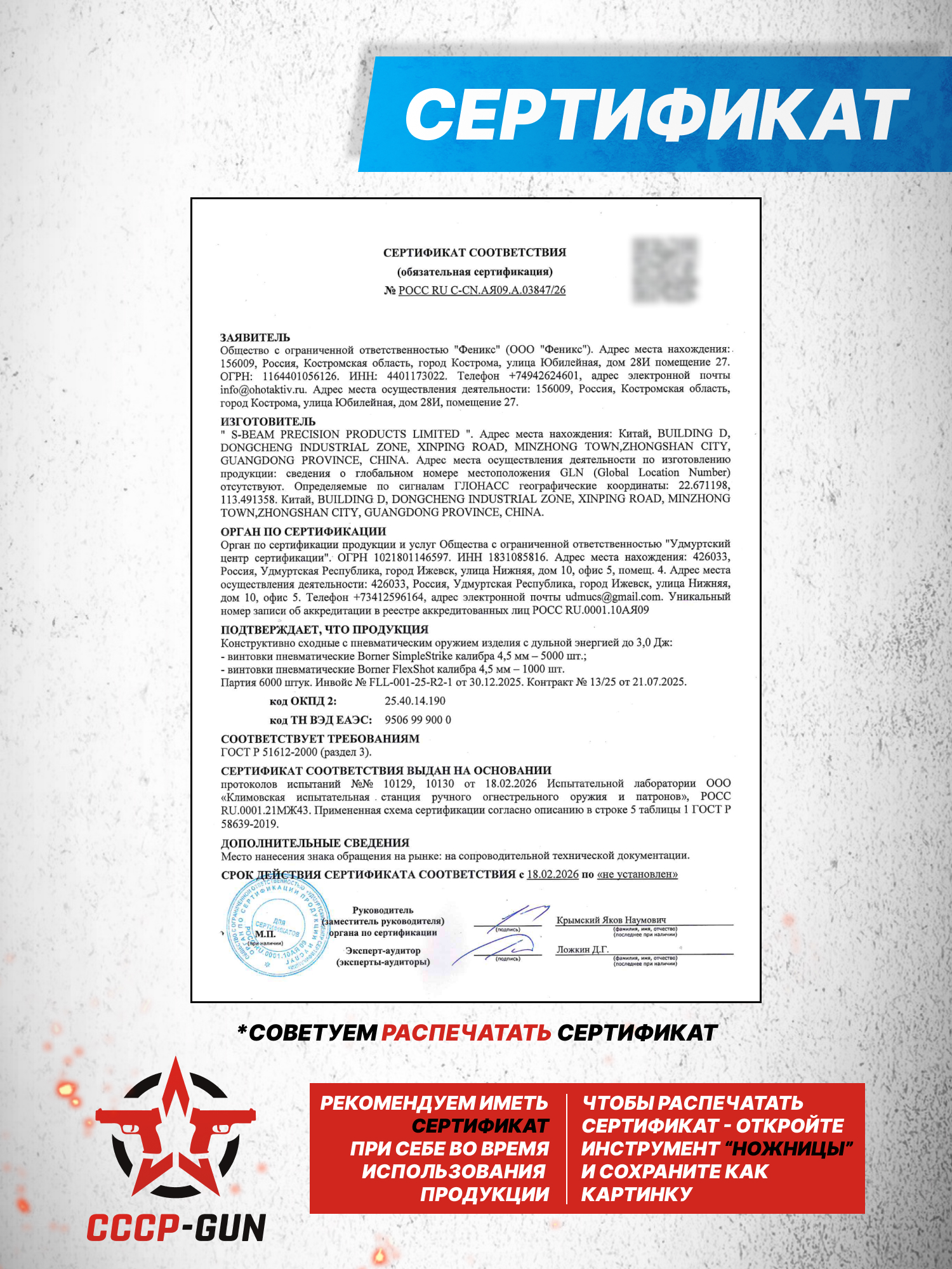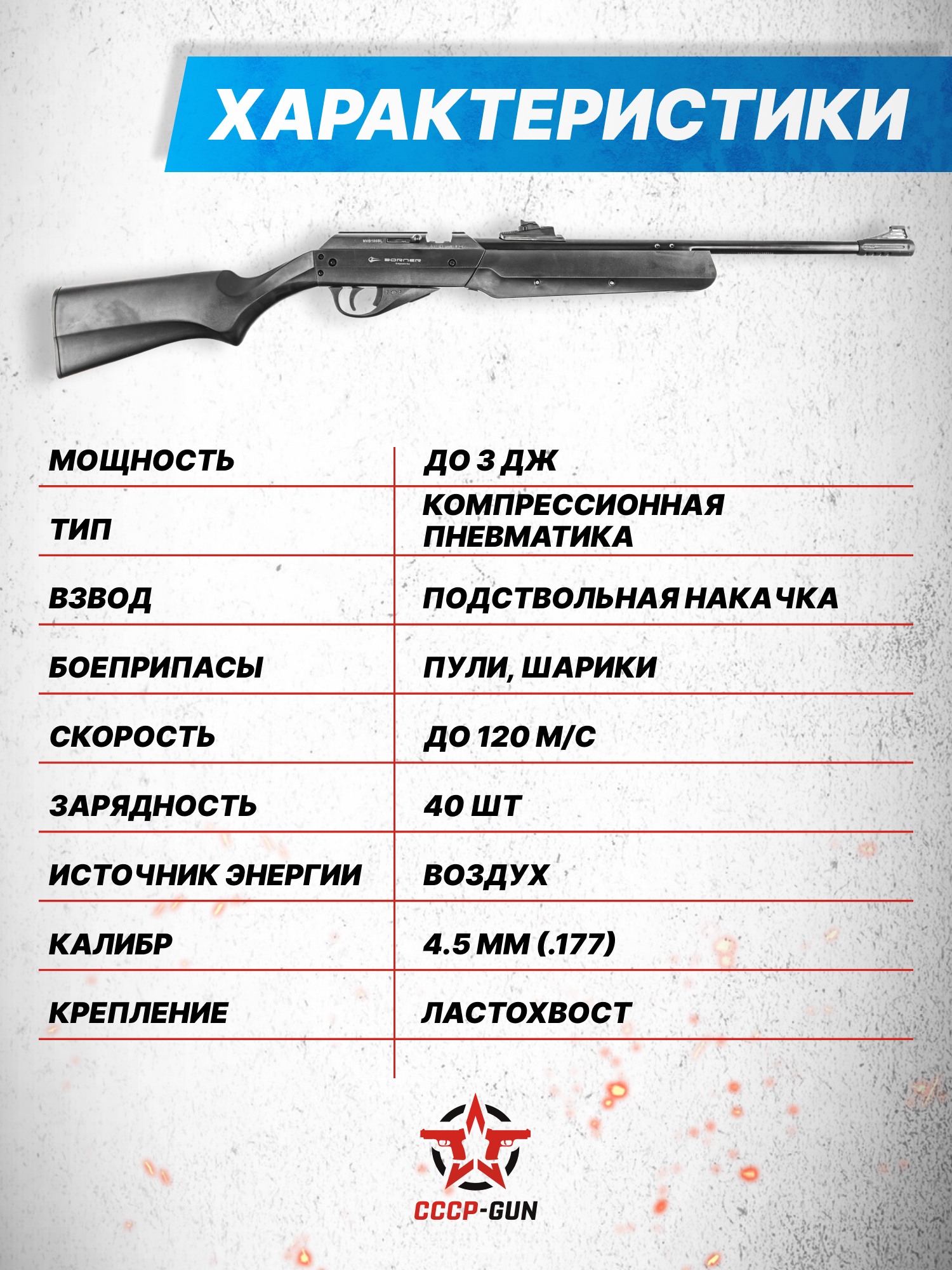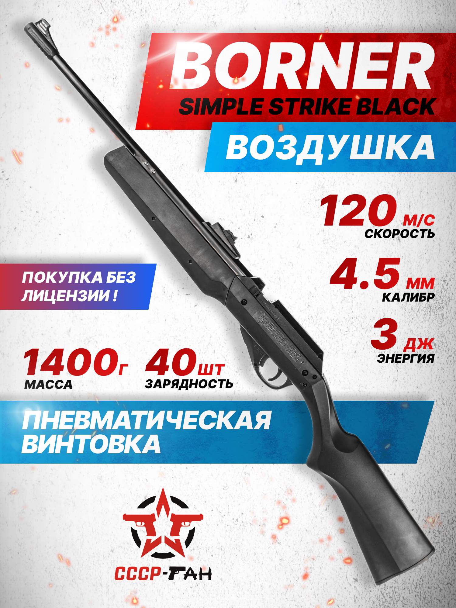 Обозреваемая Борнер пневматика винтовка способна разогнать шарик до 120 метров в секунду. При этом изделие полностью отвечает требованиям отечественного законодательства. Дульный энергетический потенциал не превышает 3 Джоулей, поэтому модель можно приобрести без процедуры получения разрешительной документации при совершеннолетии.