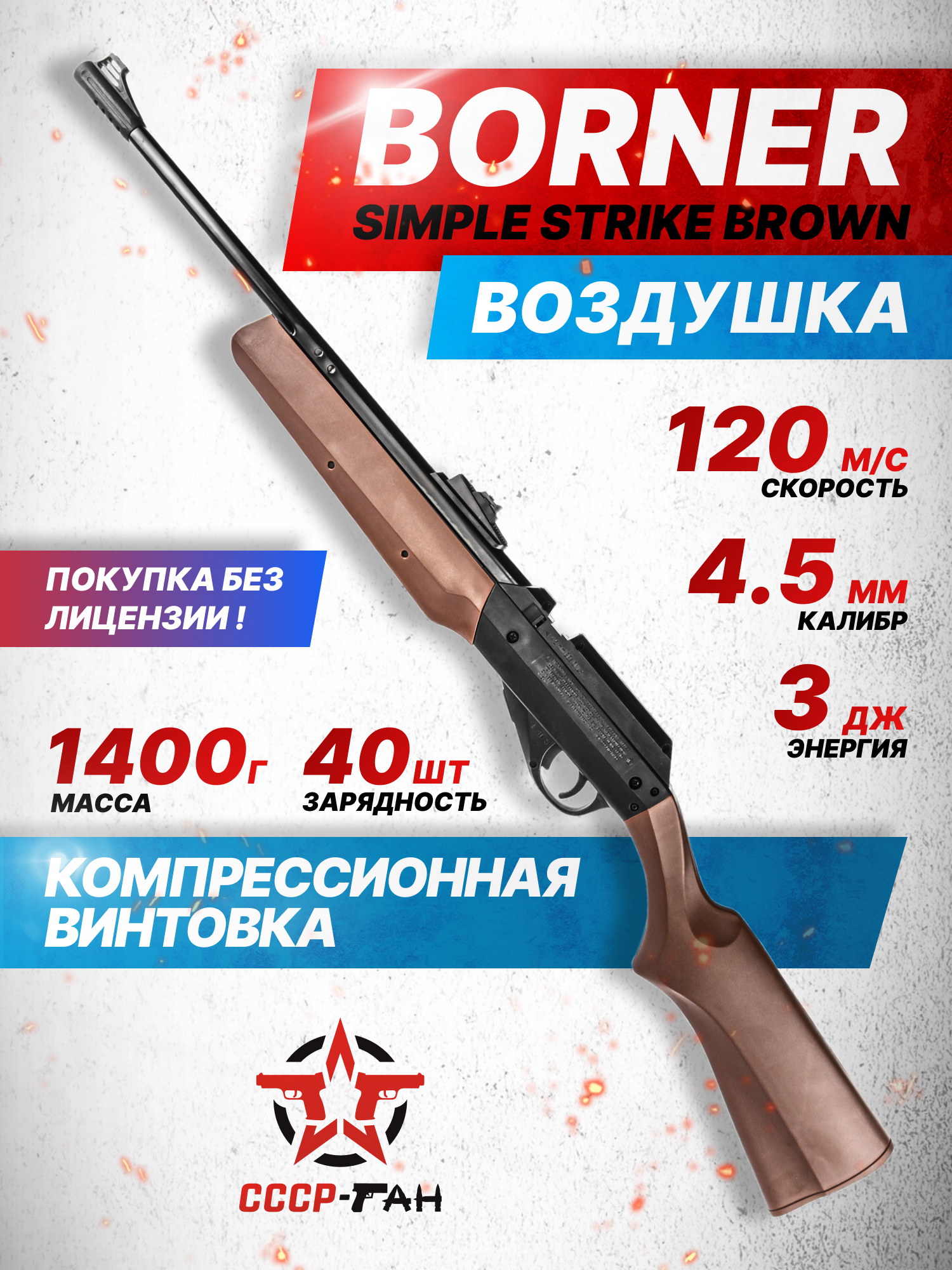 Недавно выпущенная Борнер винтовка Simple Strike способна составить конкуренцию традиционным экземплярам с откидным стволом. Представленный образец привлекателен тем, что не нуждается в задействовании сменных газовых баллонов либо постоянной подкачке от внешних устройств. Воздушная смесь, требуемая для совершения выстрела, закачивается в цилиндр за счет рычага - роль последнего играет подвижная секция цевья.
