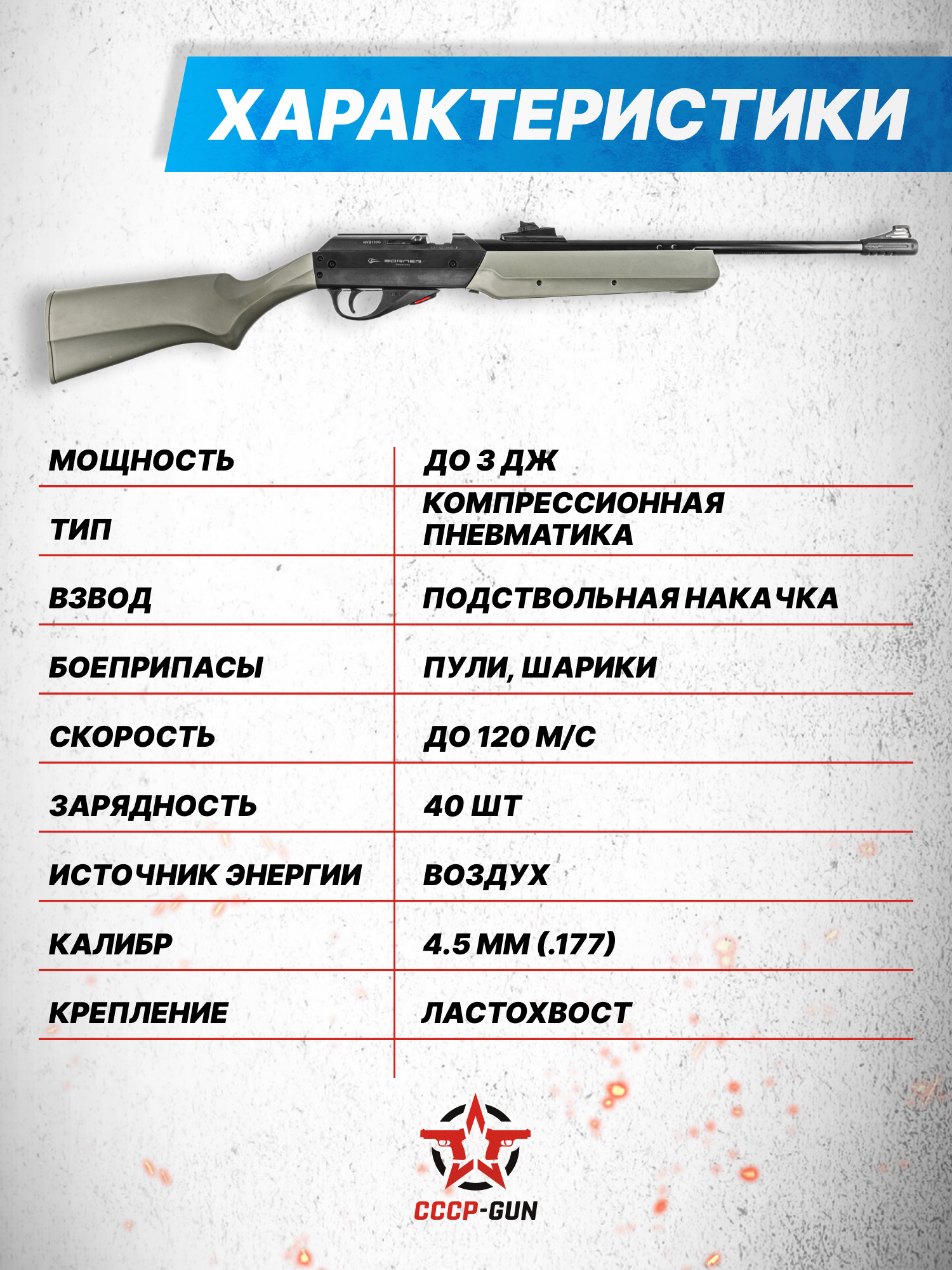 Представленный Borner 4 5 мм позволяет достичь скорости полета пули до 120 м в сек - при этом изделие сохраняет доступность в свободном обороте, так как предусматривается сочетание массы используемых стальных шариков и дульной энергии, не превышающей 3 Дж. Следовательно, получение каких-либо специализированных документов не потребуется - необходимо лишь удостоверение достижения восемнадцатилетнего возраста.