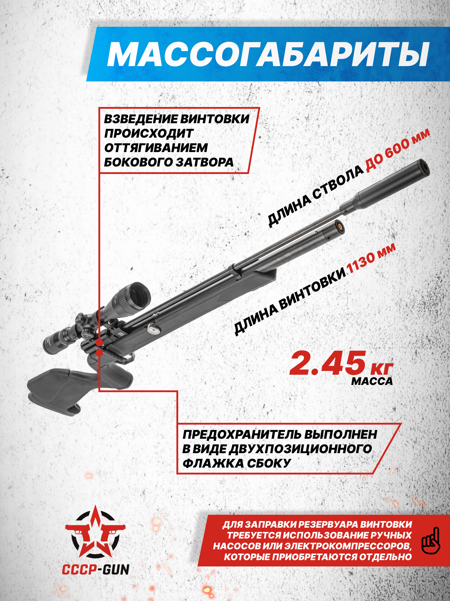 Винтовка будет готова к работе после предварительной заправки встроенного резервуара сжатым воздухом - для накачки предполагается использование насосов и иных средств, способных повысить давление газа. Емкость линейно размещенного резервуара - до 200 куб. сантиметров. При накачке баллона нужно следить за тем, чтобы указатель в манометре не перешел допустимую эксплуатационную границу - 250 Бар.