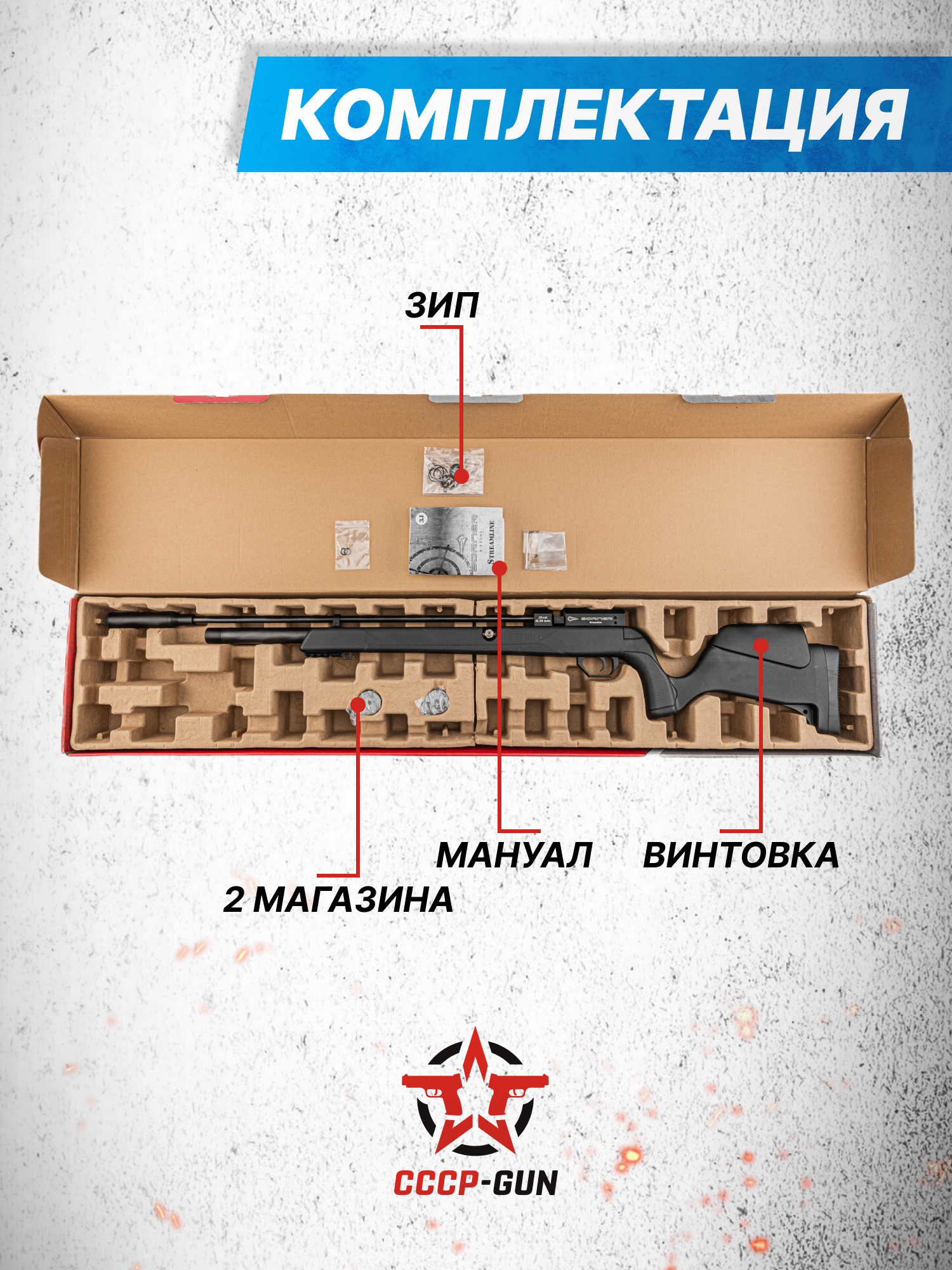 Комплект поставки Винтовка, магазин, упаковка, заправочный штуцер, краткая документация, копия сертификата (по запросу покупателя)