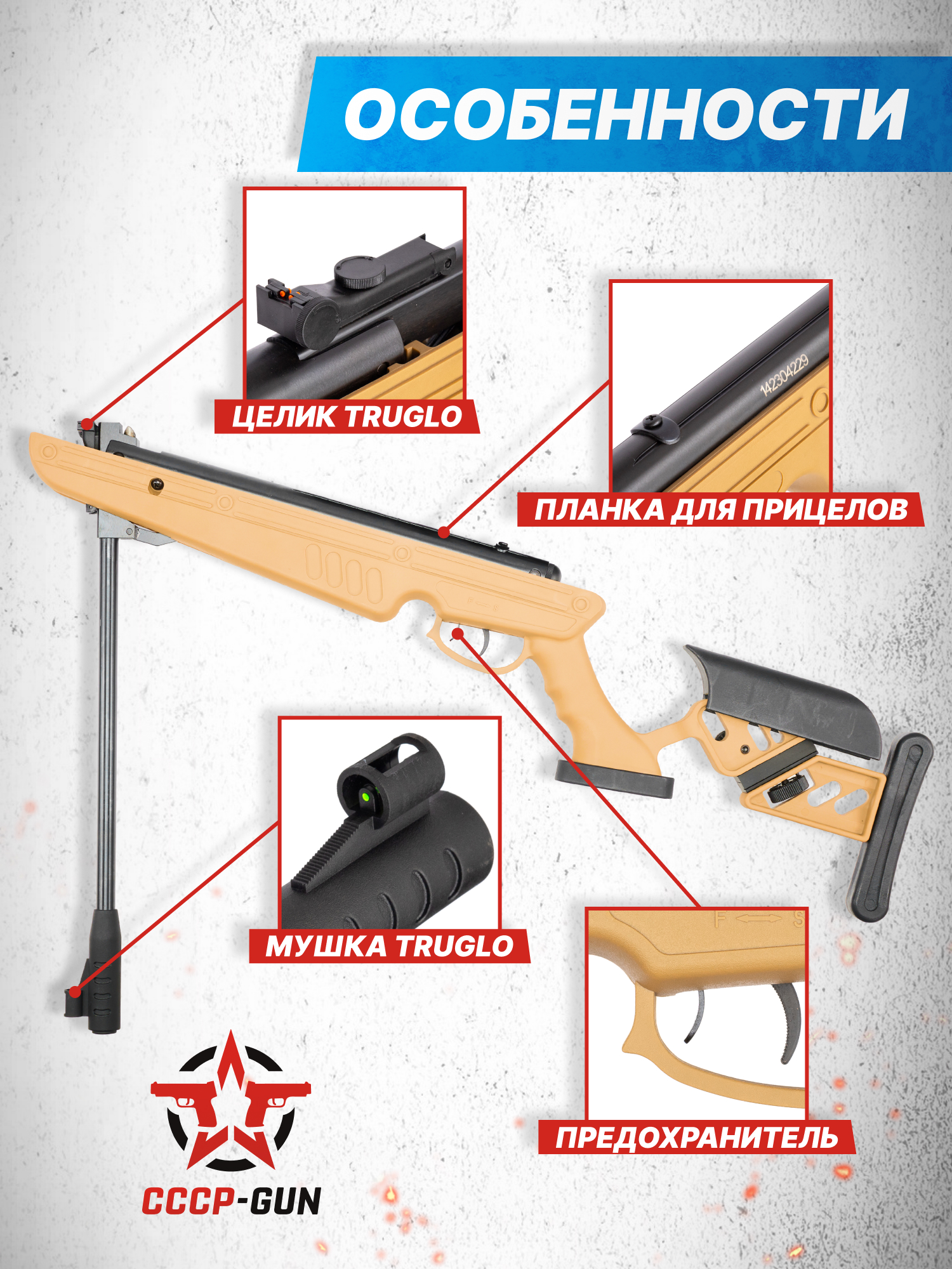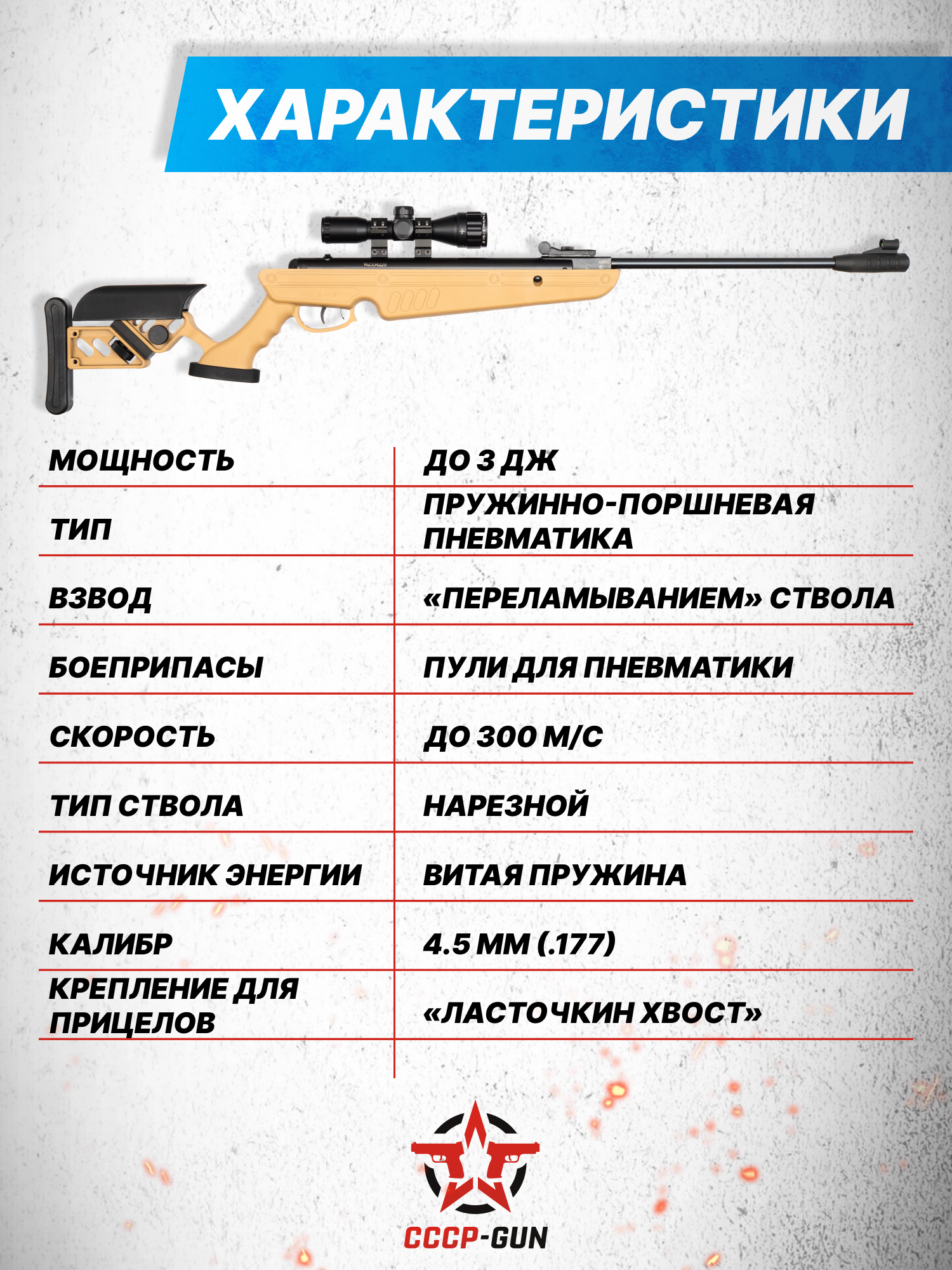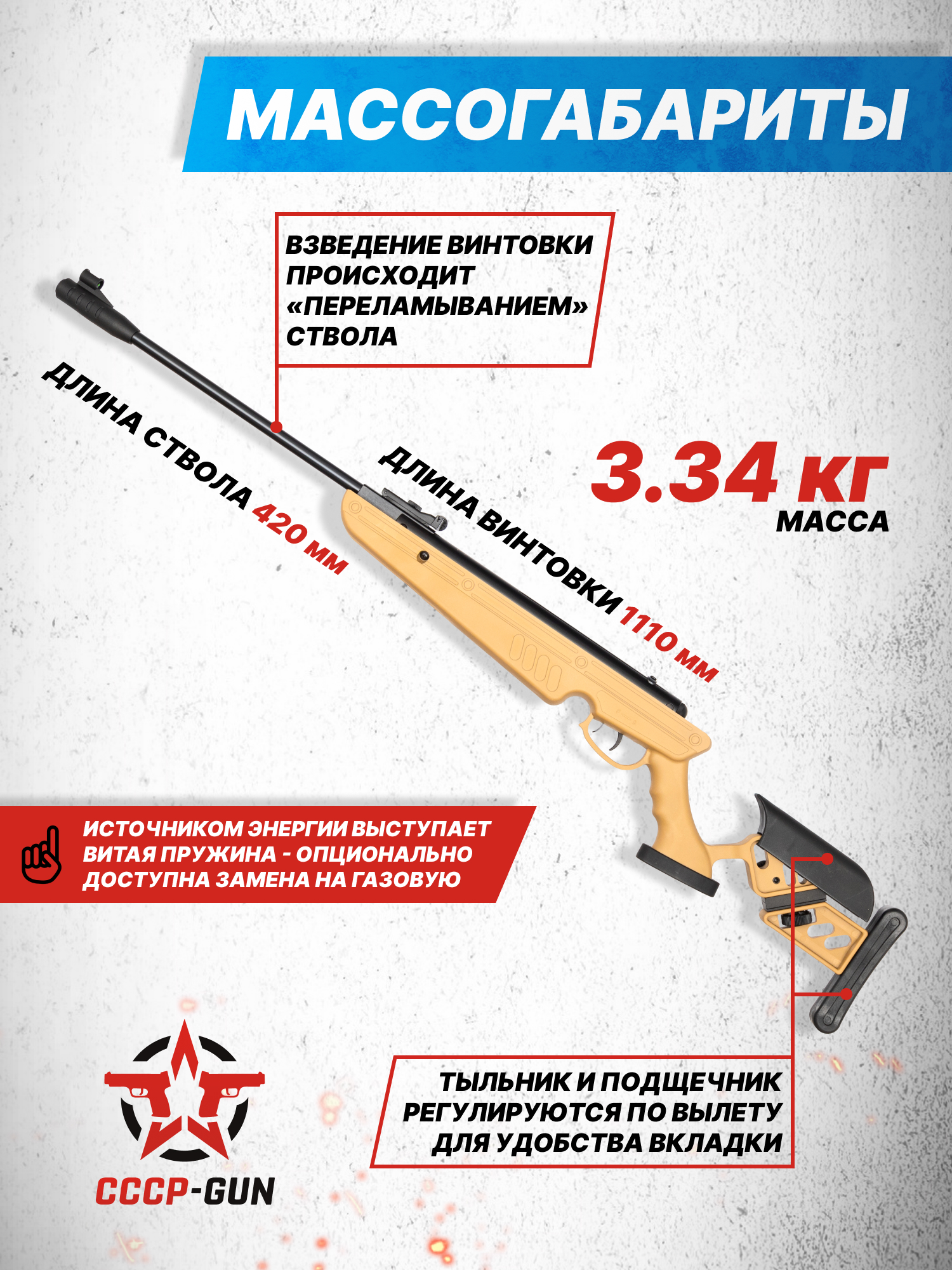 После усиления механизма винтовки максимальная скорость выпускаемых из представленного оружия снарядов будет достигать 300 метров в секунду. Штатный вариант модели для российского рынка подразумевает витую пружину, которая создает давление в камере, выталкивая поршень. Взводится пневматика переломным методом путем складывания ствола, также в этот момент пользователь получает доступ к отсеку для зарядки боеприпаса.