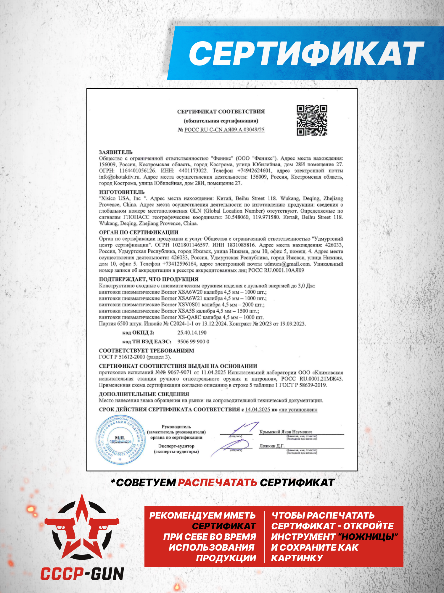 Лицензия для покупки винтовки на территории России не требуется, так как производитель поставляет изделия с разрешенной дульной энергией на уровне показателя 3 Дж. Такое решение помогает делать пневматику доступной для развлекательной стрельбы и тренировок начинающих пользователей. Также конструкторы Borner спроектировали для повышения безопасности компактный предохранитель, который установлен перед спусковым крючком и закрывается продолговатой скобой, повышая удобство переключения.