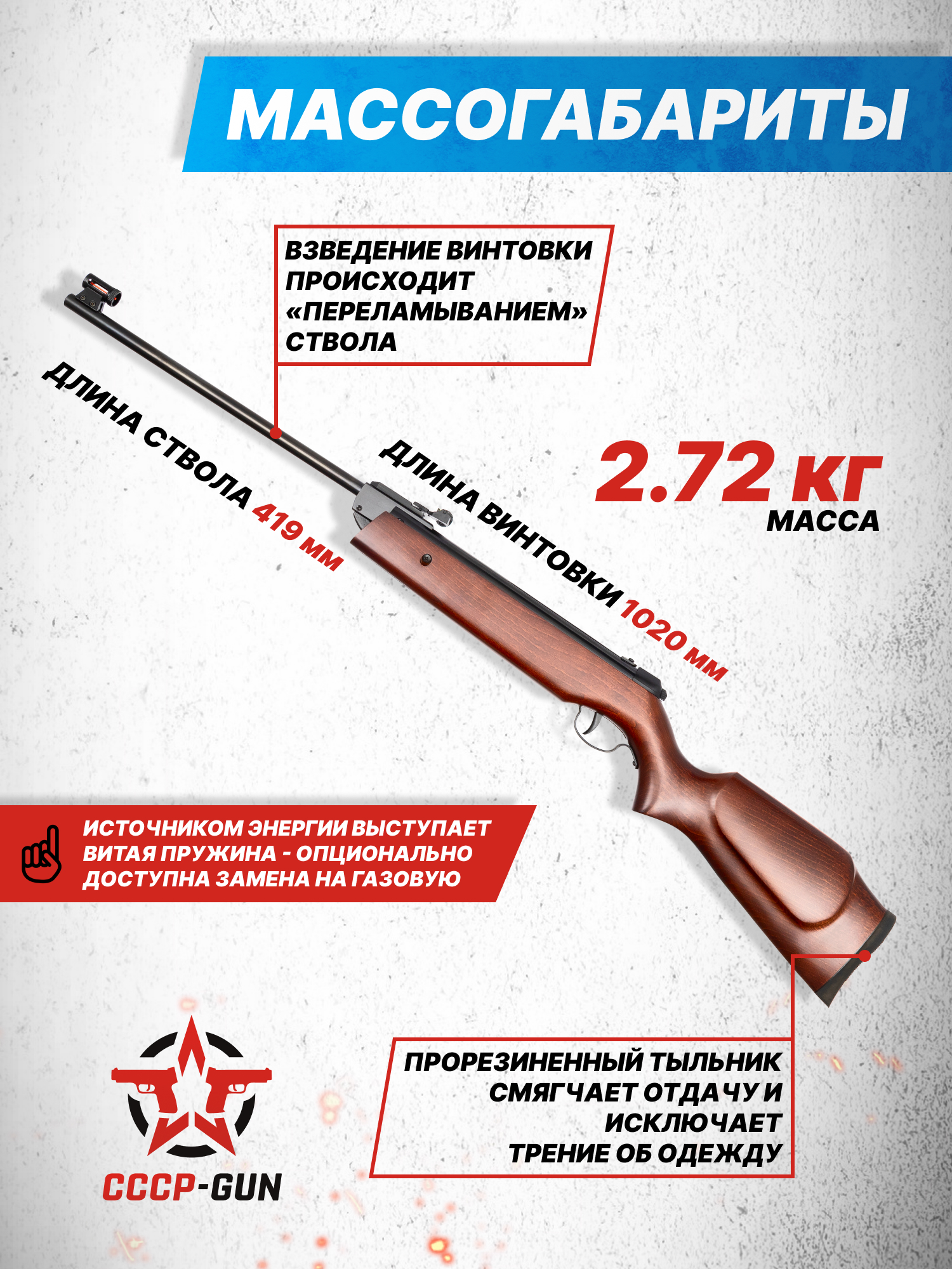 Рассматриваемая модель относится к качественным образцам бюджетного сегмента, соединяя в себе долговечность и демократичную стоимость. Несмотря на то, что ложа винтовки изготовлена в традиционном формате из дерева, масса изделия составляет всего 2.8 кг, а размеры пневматики равны 1029x120x40 мм. Дополнительную эстетичность добавляет приклад формата Монте-Карло с выраженным подщечником.