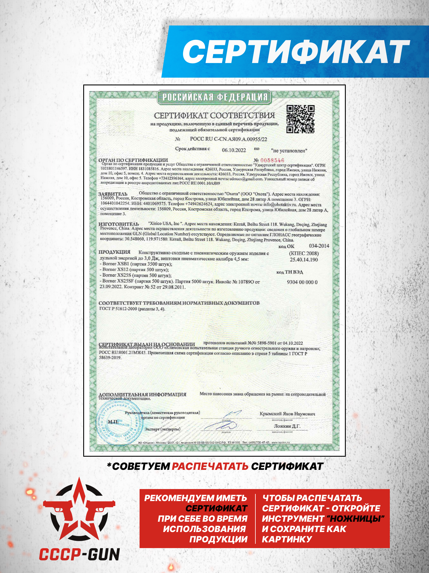 Скорость снаряда по паспорту составляет порядка 200 метров в секунду, поэтому винтовка подойдет как для развлекательной, так и для спортивной стрельбы. Стоит отметить, что в России изделие продается свободно и доступно даже для начинающих пользователей пневматики, поскольку дульная энергия обозреваемой модели насчитывает менее 3 J. Таким образом для приобретения Borner XS12 не нужно получать дополнительное разрешение в Росгвардии.