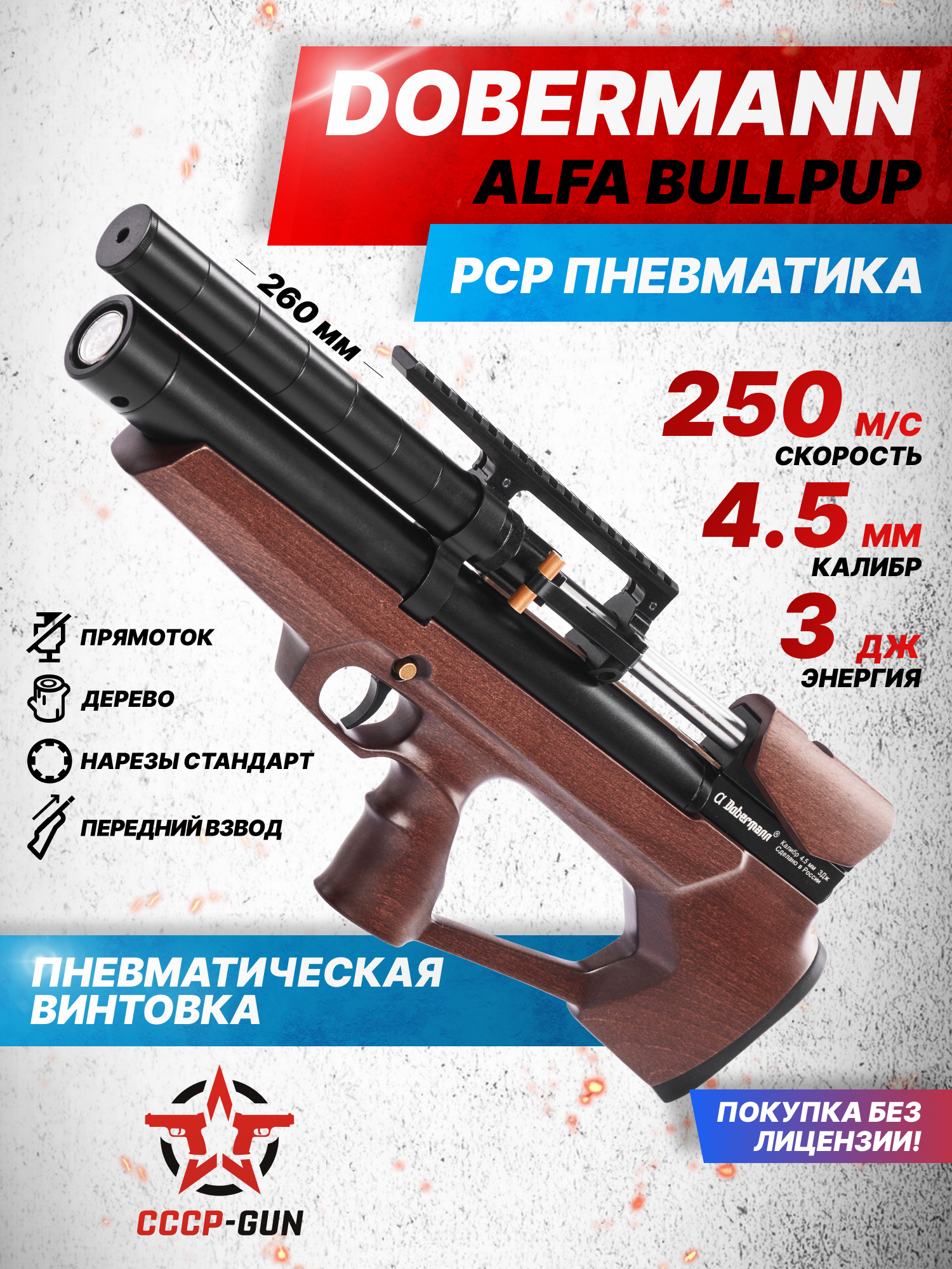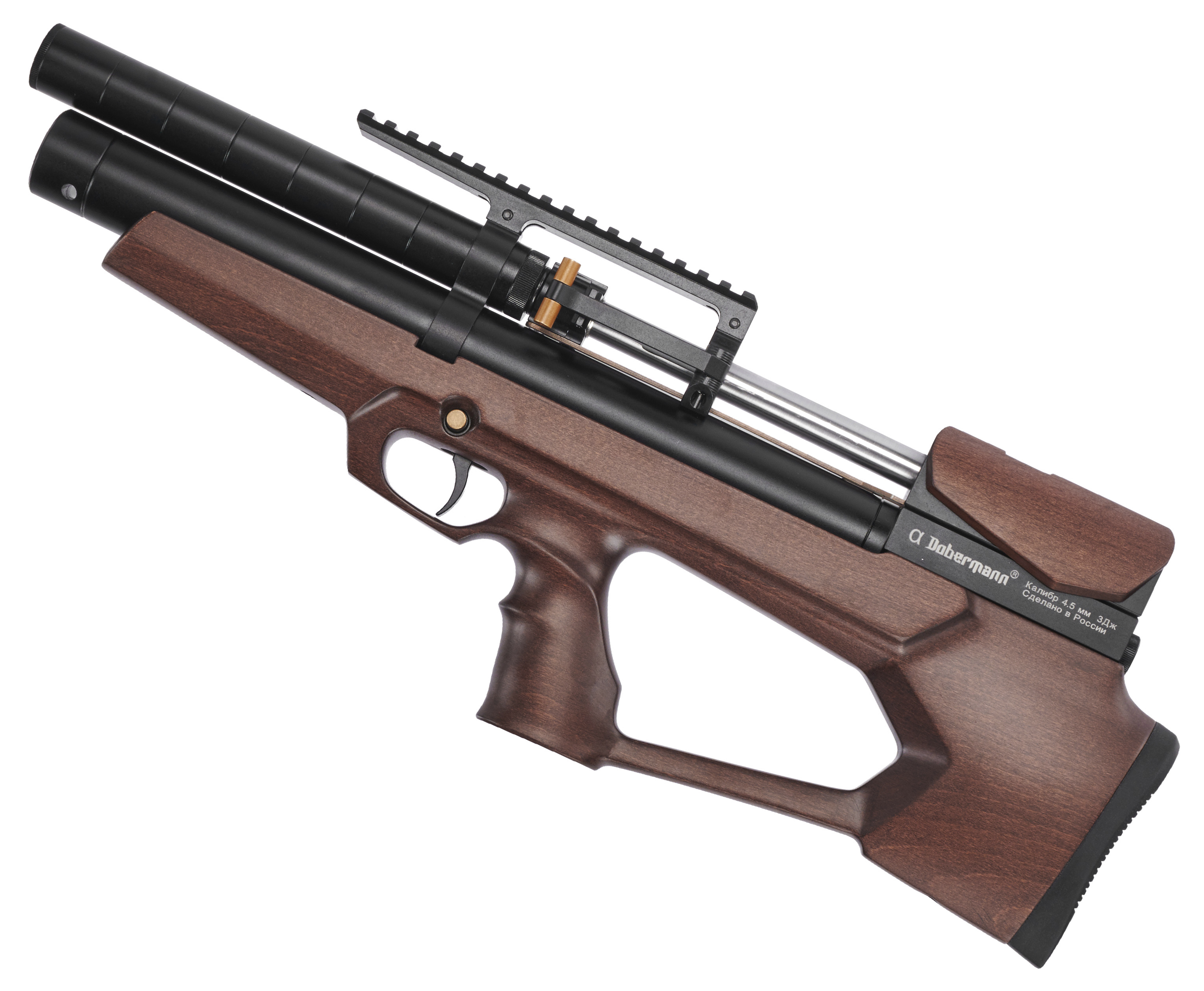Обозреваемая Dobermann пневматическая винтовка функционирует исключительно в одиночном режиме, требующем обязательного ручного перезаряжания перед производством каждого последующего выстрела. Система безопасности включает кнопочный предохранительный механизм блокировки спуска, размещенный в зоне легкой досягаемости указательного пальца стрелка непосредственно над спусковым крючком. Подача свинцовых боеприпасов калибра 4.5 мм организована посредством вращающегося магазина барабанного типа емкостью на семь слотов.