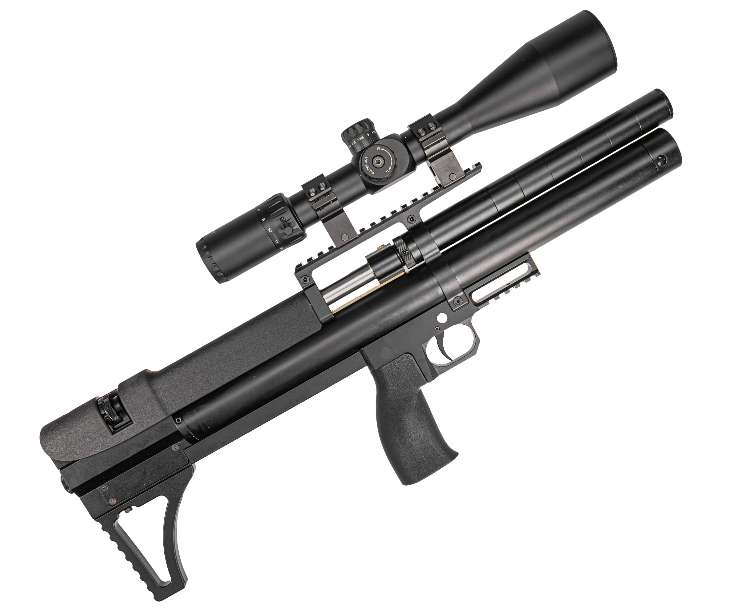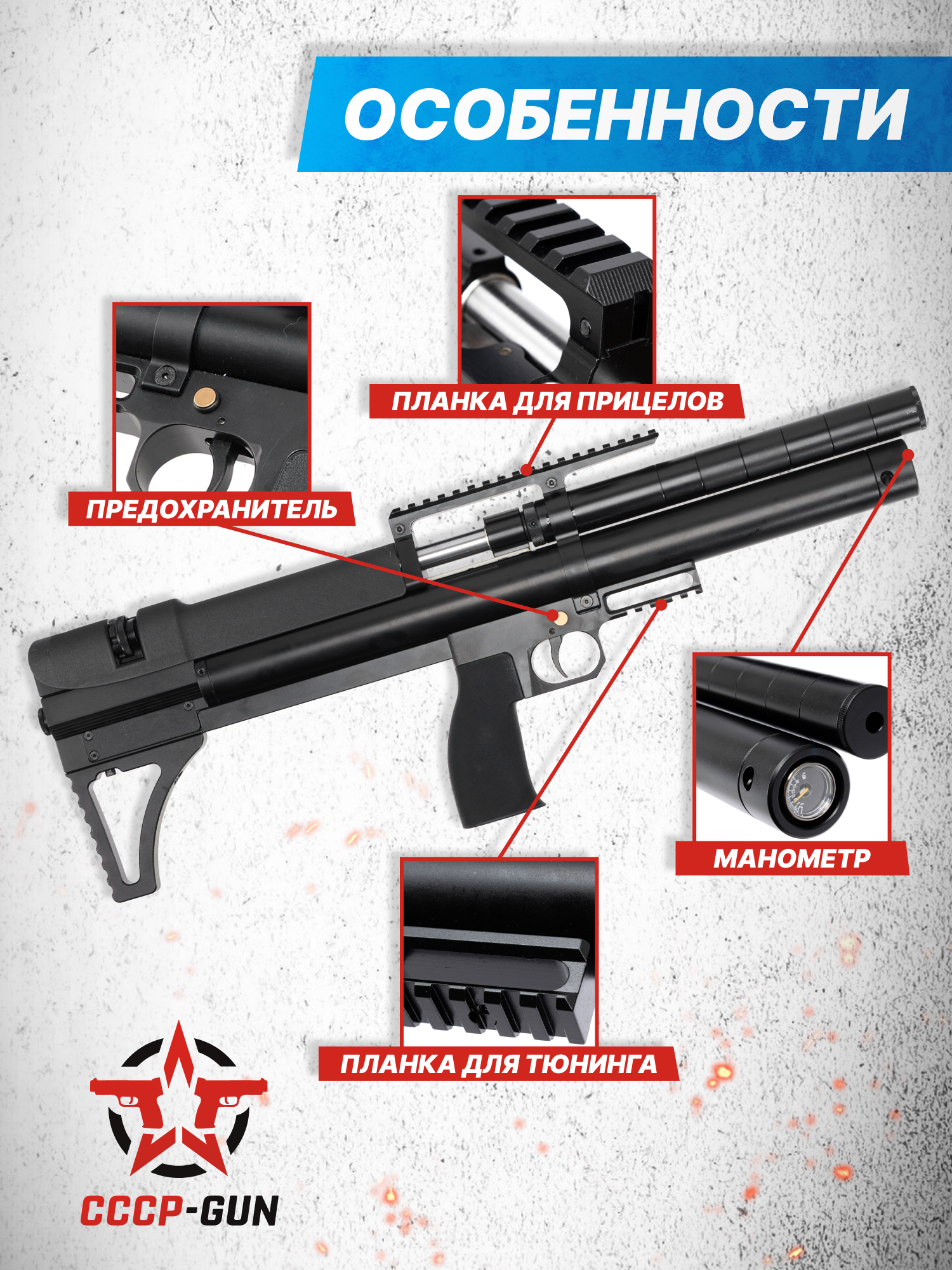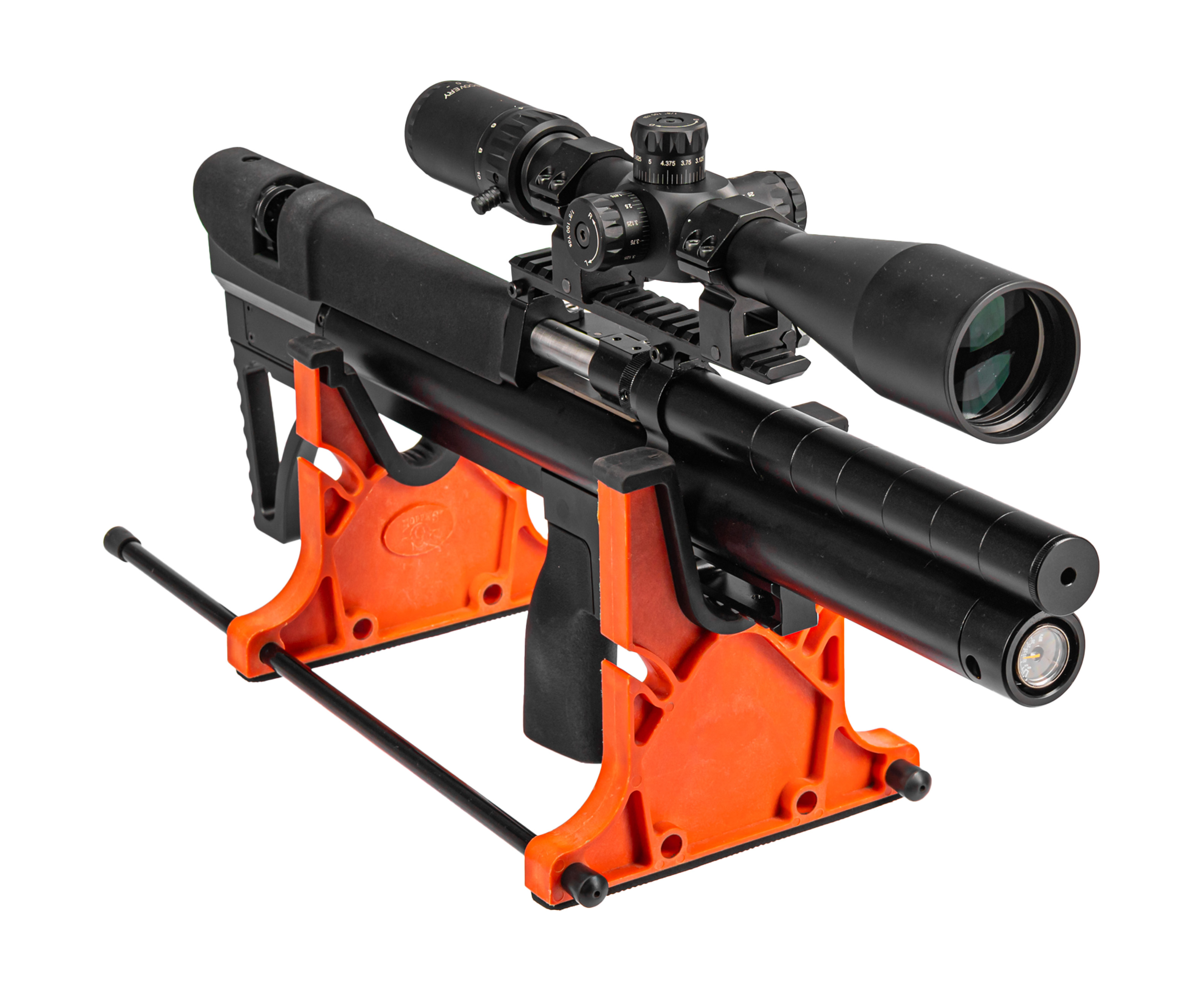 Экземпляр отличается конструкцией, предусматривающей редуктор для регулировки потока воздуха из резервуара в ствольный канал. За счет этого пользователь будет наблюдать повторяемость выстрелов по баллистическим данным - точка попадания и траектория полета снаряда становится более предсказуемой. Перед покупкой и эксплуатацией важно учесть, что предельный показатель давления системы составляет 250 Бар.